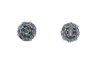 Paar modieuze oorbellen bezet met 32 ceylon saffieren: 3.70ct (gemerkt) + witte diamanten: 12 baguette en 48 briljant geslepen
