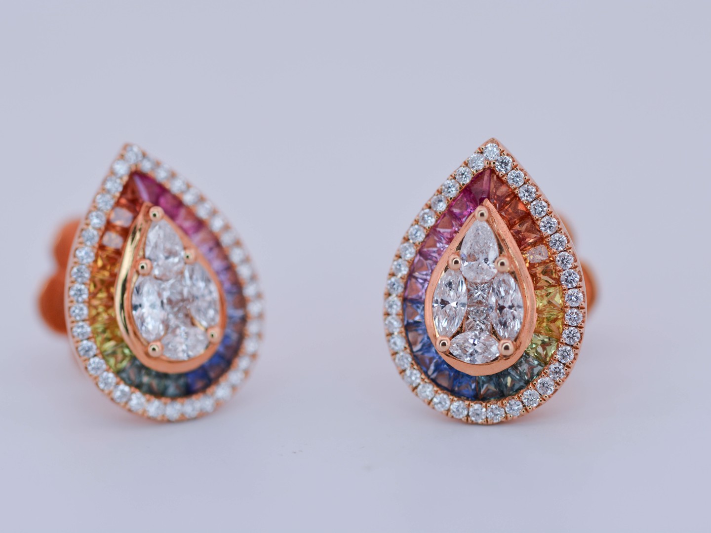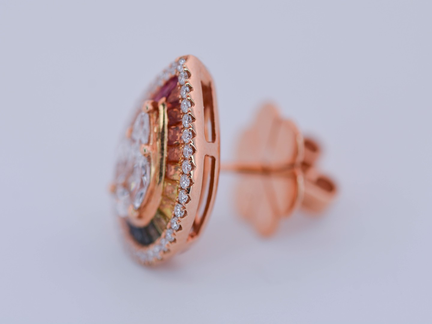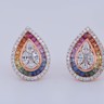 Exclusief paar multicolor oorbellen, vervaardigd in 18 karaat roze goud (gemerkt 750), bezet met een levendige compositie van robijnen, saffieren, citrines en tsavorieten, met een gezamenlijk gewicht van circa 1,80 karaat.