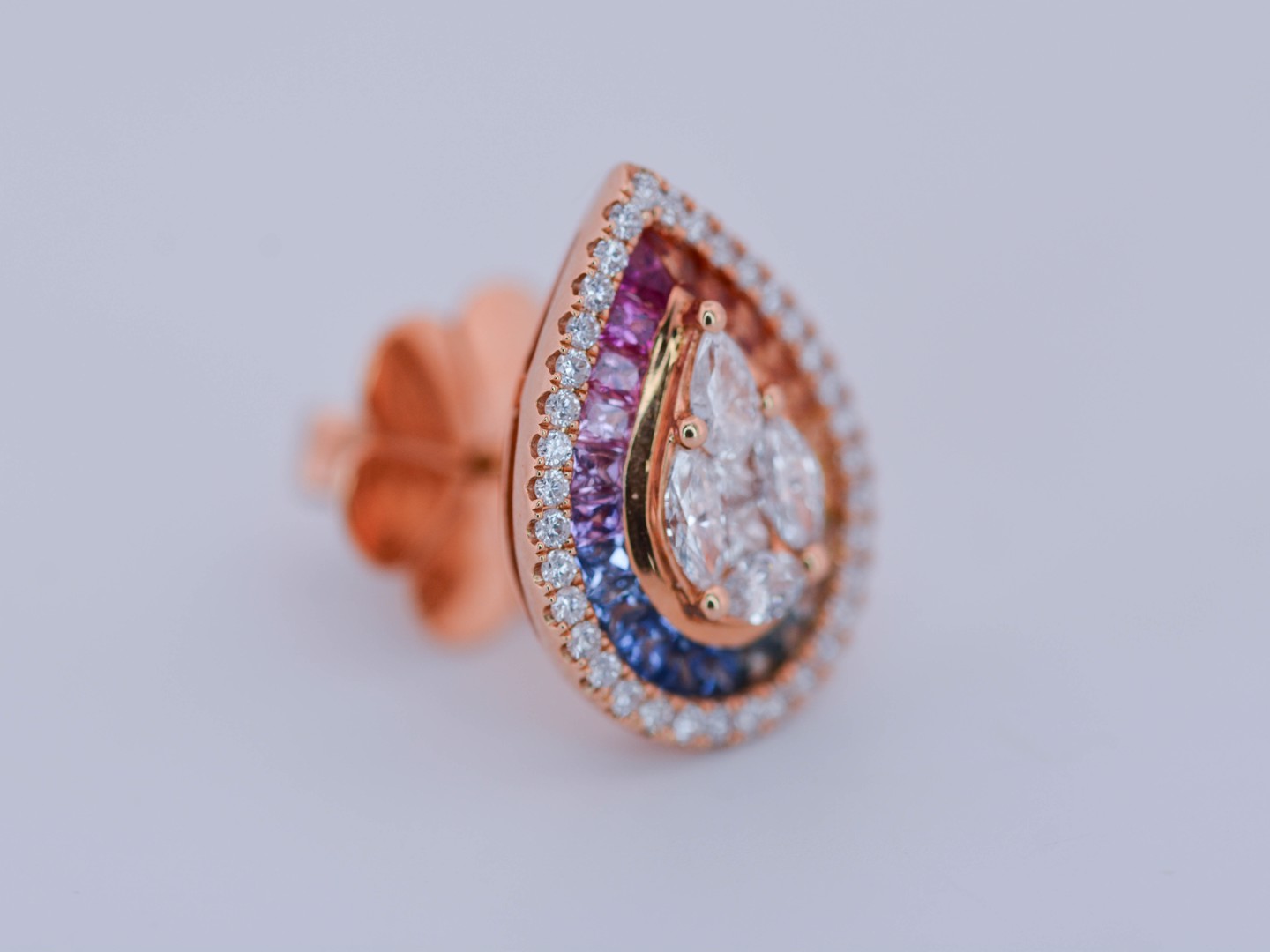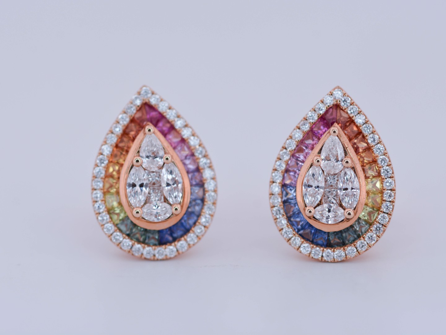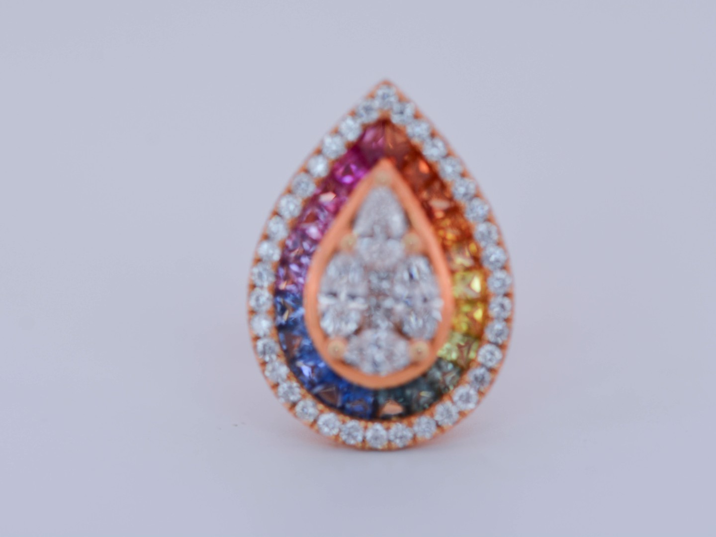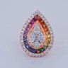 De kleurrijke stenen worden omringd door een schitterende combinatie van briljant-, marquise- en peergeslepen witte diamanten, samen goed voor ongeveer 2 karaat.