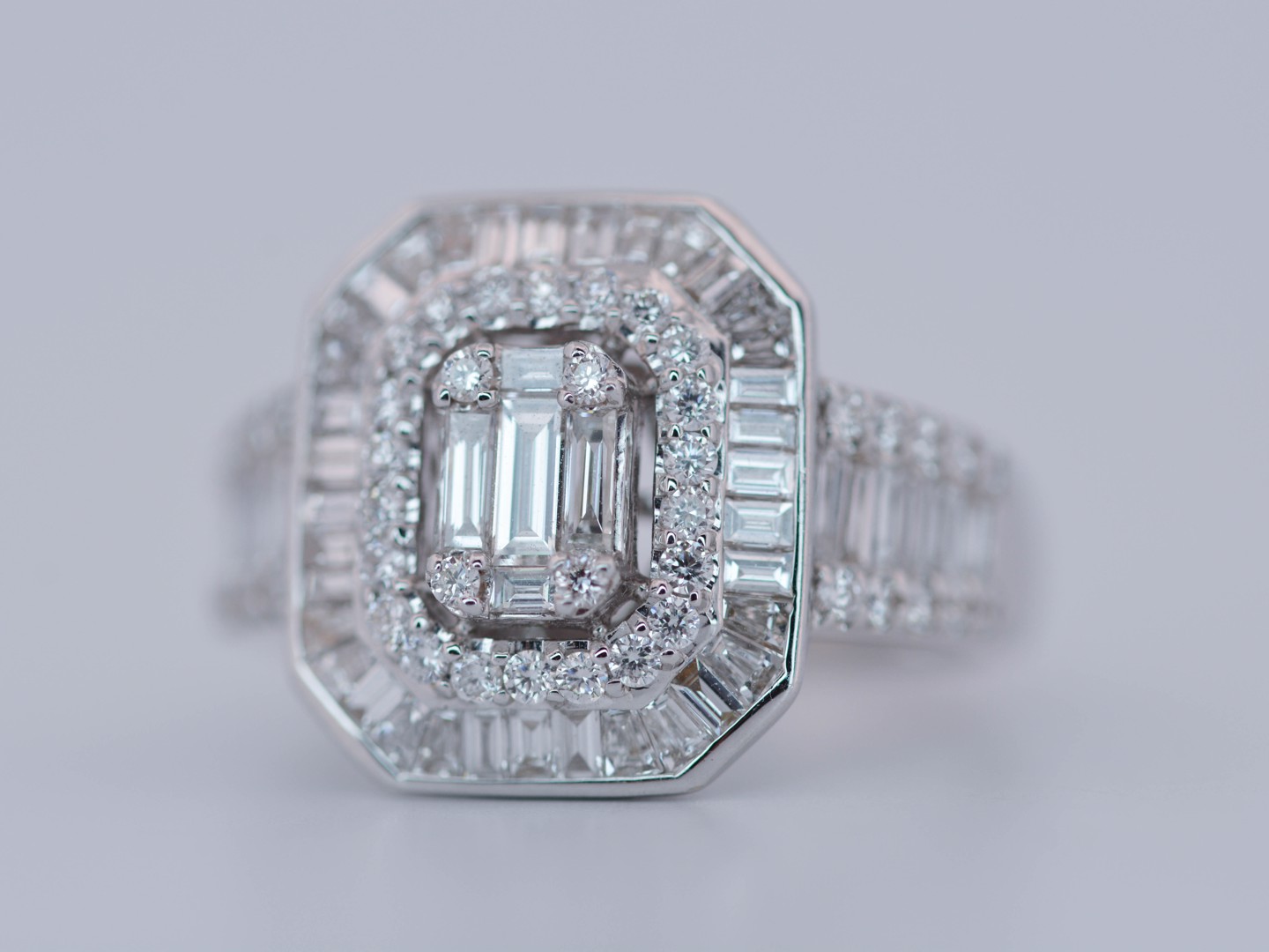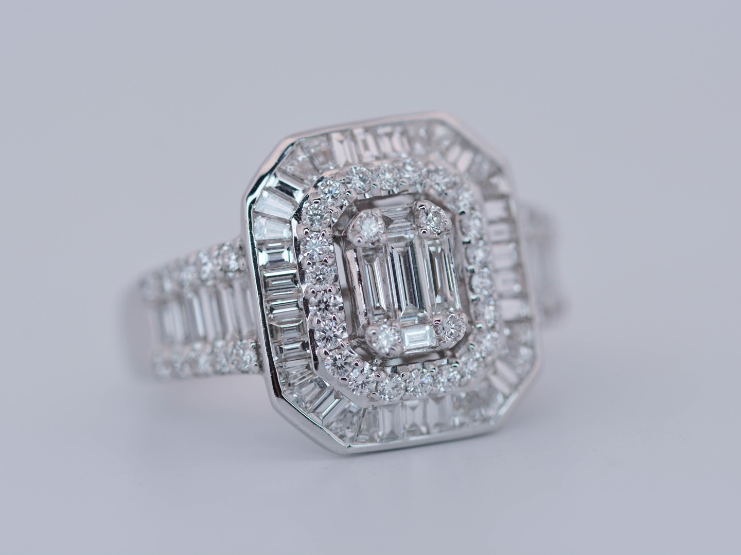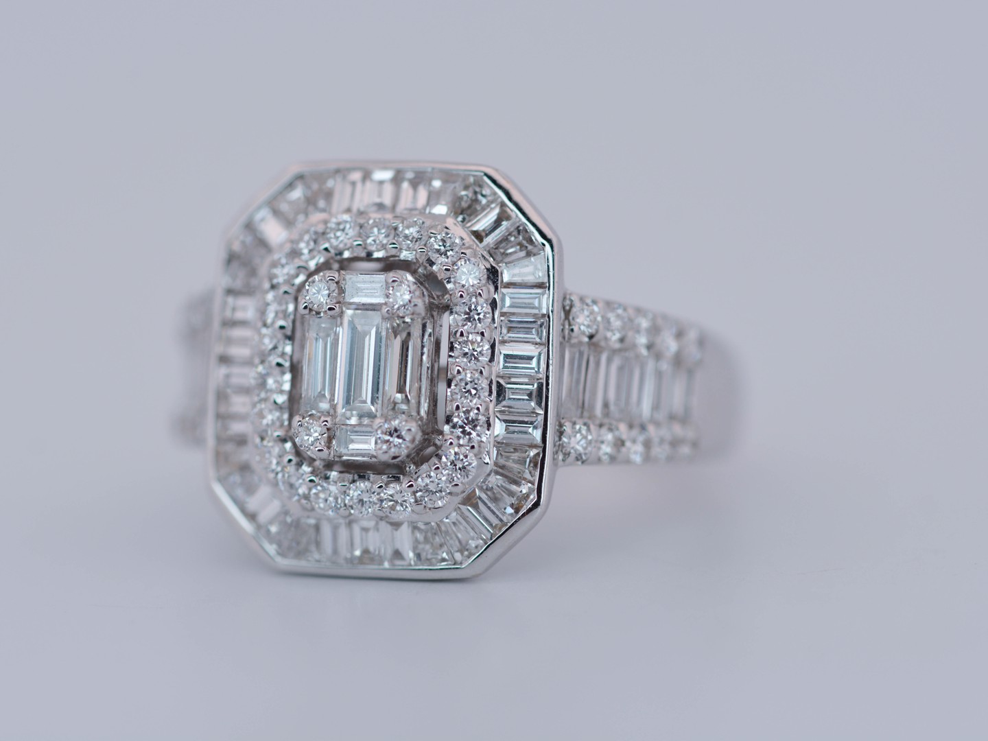 Elegante ring vervaardigd in 18 karaat wit goud (gemerkt 750), bezet met een verfijnde combinatie van briljant- en baguettegeslepen witte diamanten, met een totaalgewicht van circa 2,10 karaat.