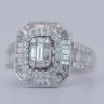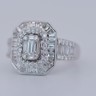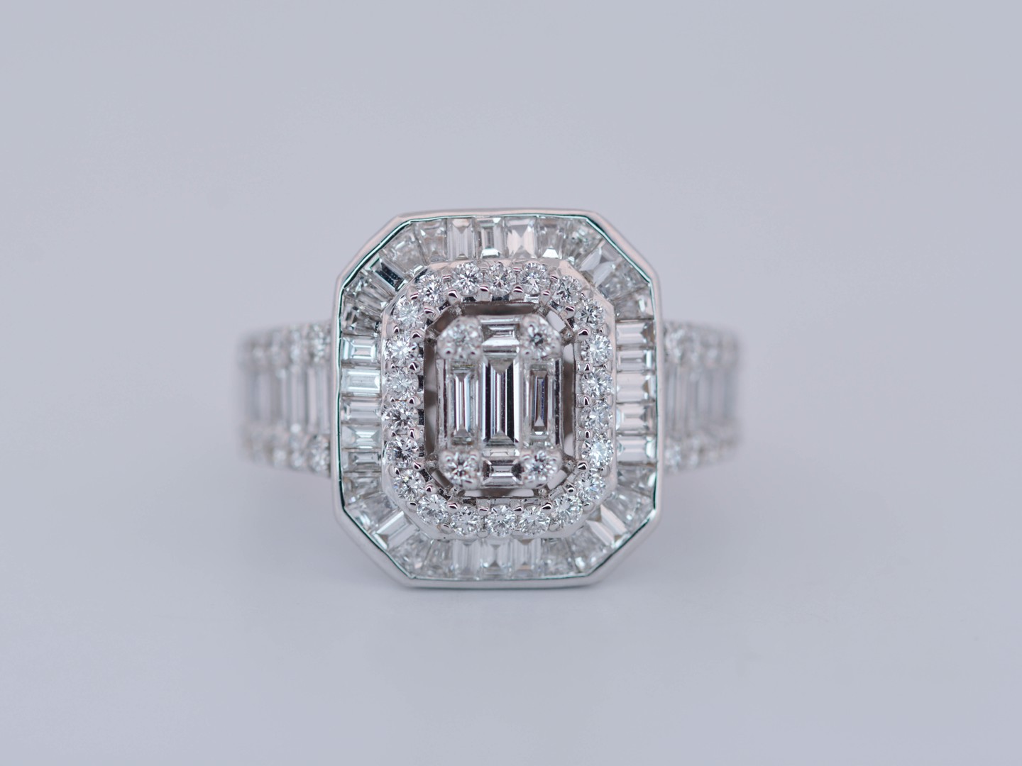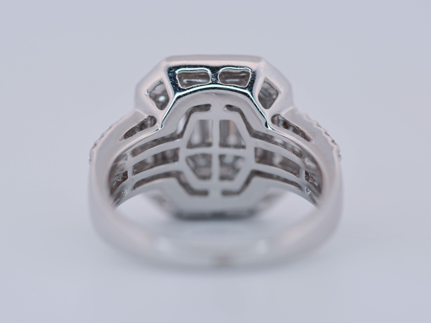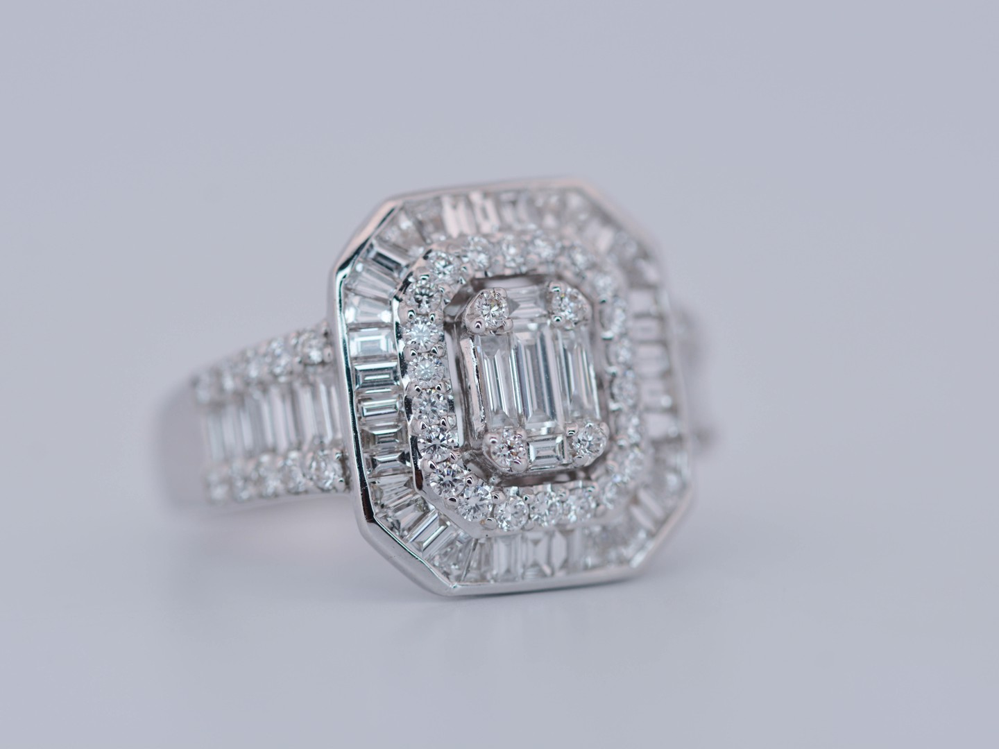 Elegante ring vervaardigd in 18 karaat wit goud (gemerkt 750), bezet met een verfijnde combinatie van briljant- en baguettegeslepen witte diamanten, met een totaalgewicht van circa 2,10 karaat.