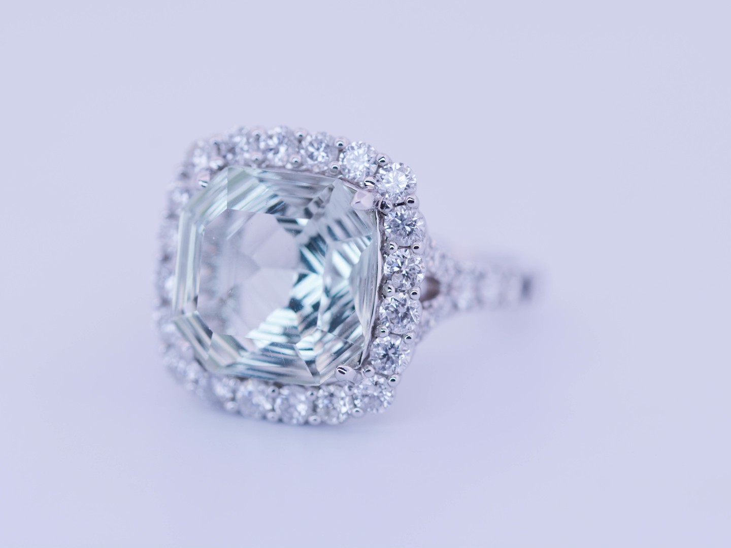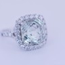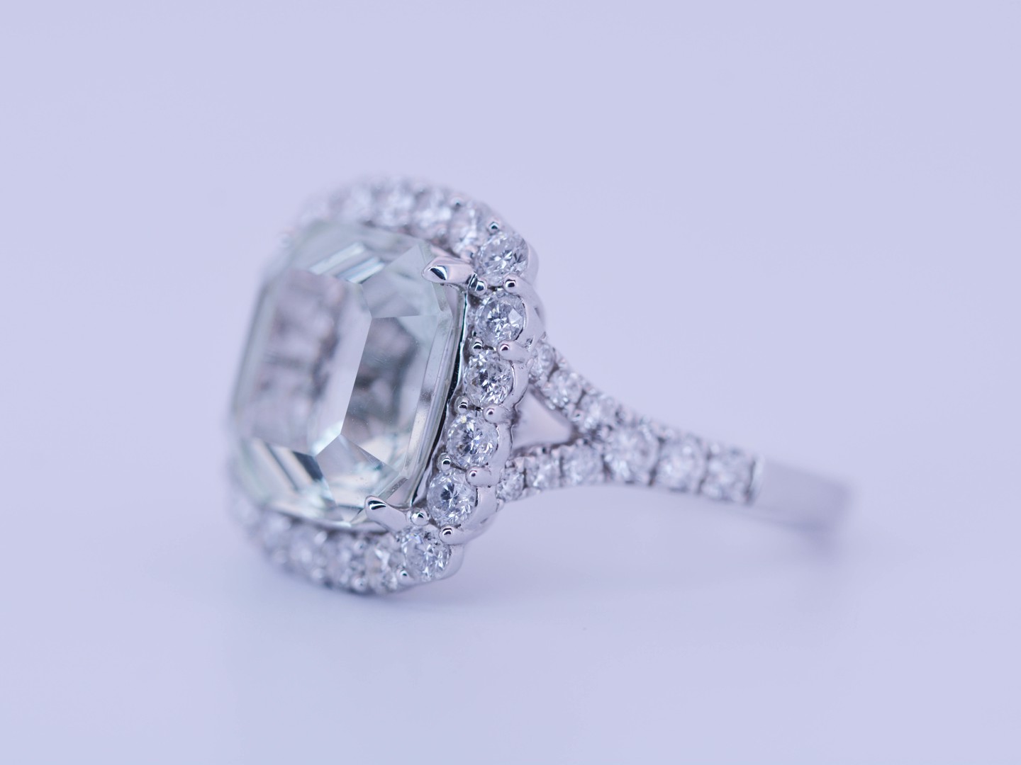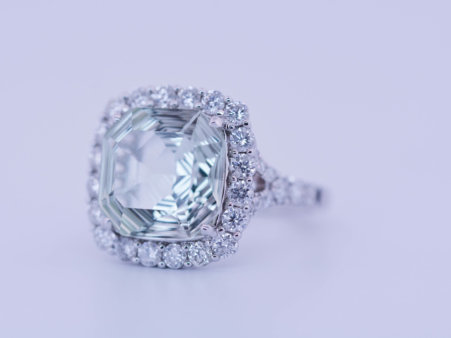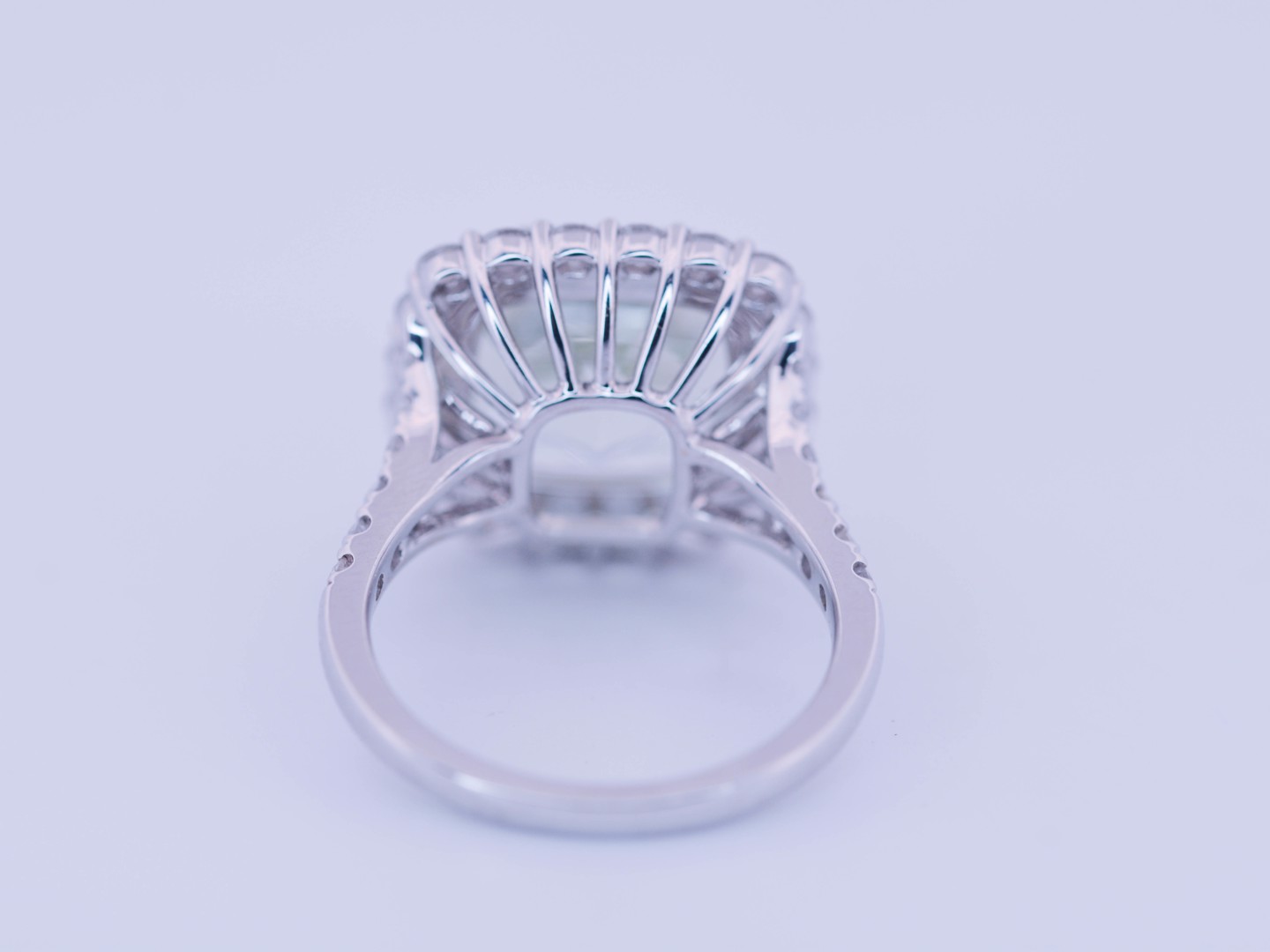 Verfijnde ring vervaardigd in 18 karaat wit goud (gemerkt 750), bezet met een lichte, frisgroene prasioliet van circa 6,5 karaat, omringd door 38 briljantgeslepen witte diamanten met een totaalgewicht van ongeveer 2 karaat.