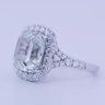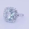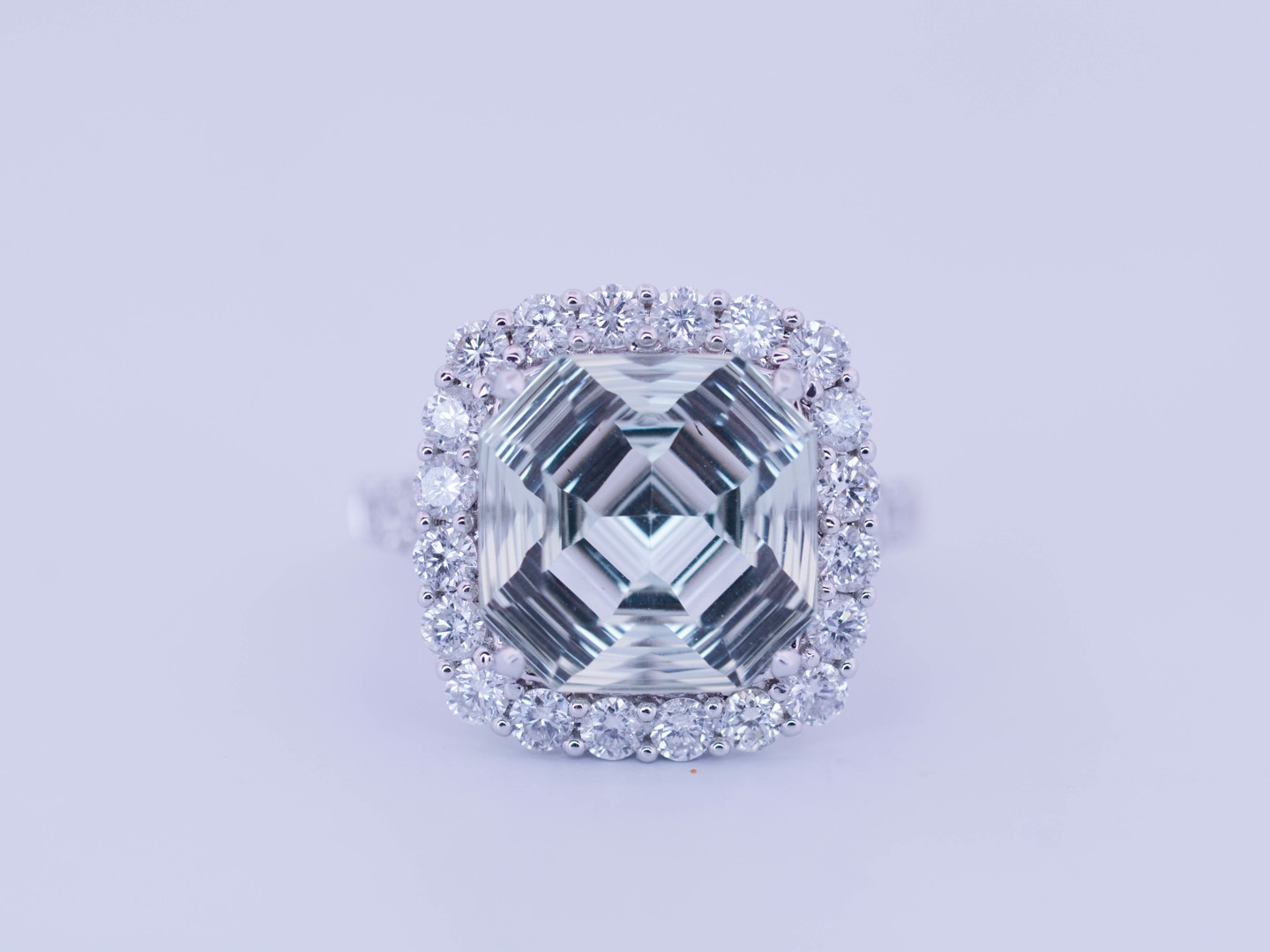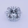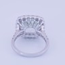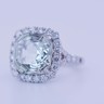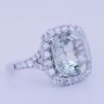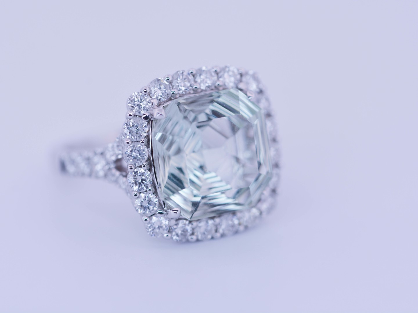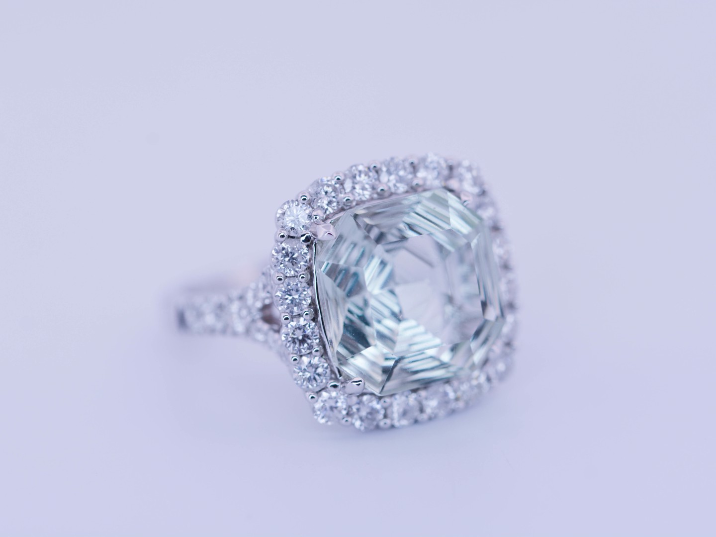 Verfijnde ring vervaardigd in 18 karaat wit goud (gemerkt 750), bezet met een lichte, frisgroene prasioliet van circa 6,5 karaat, omringd door 38 briljantgeslepen witte diamanten met een totaalgewicht van ongeveer 2 karaat.