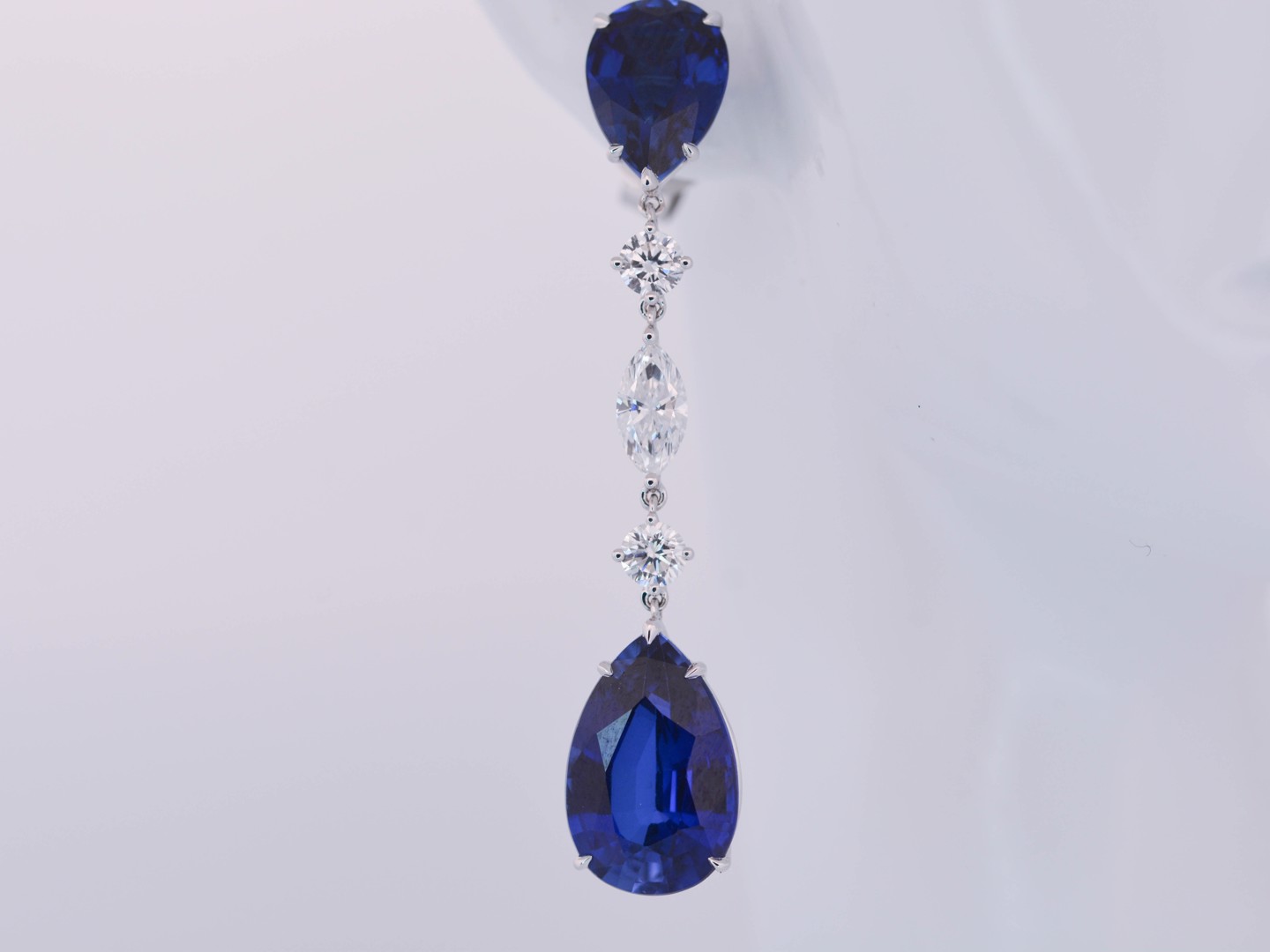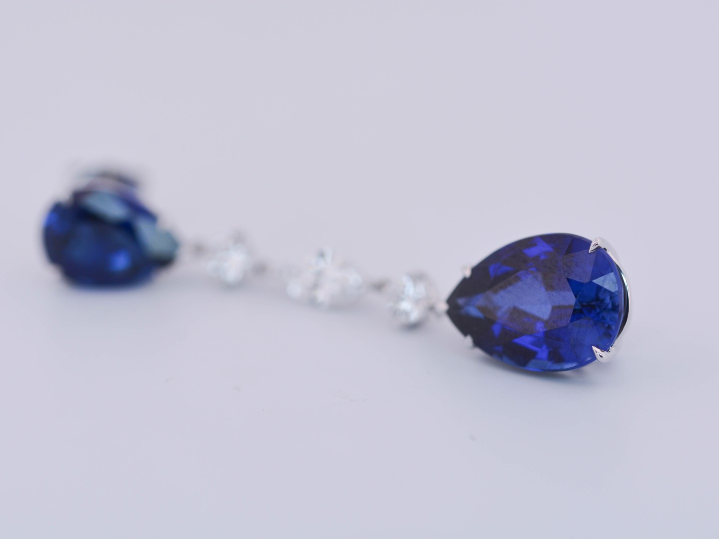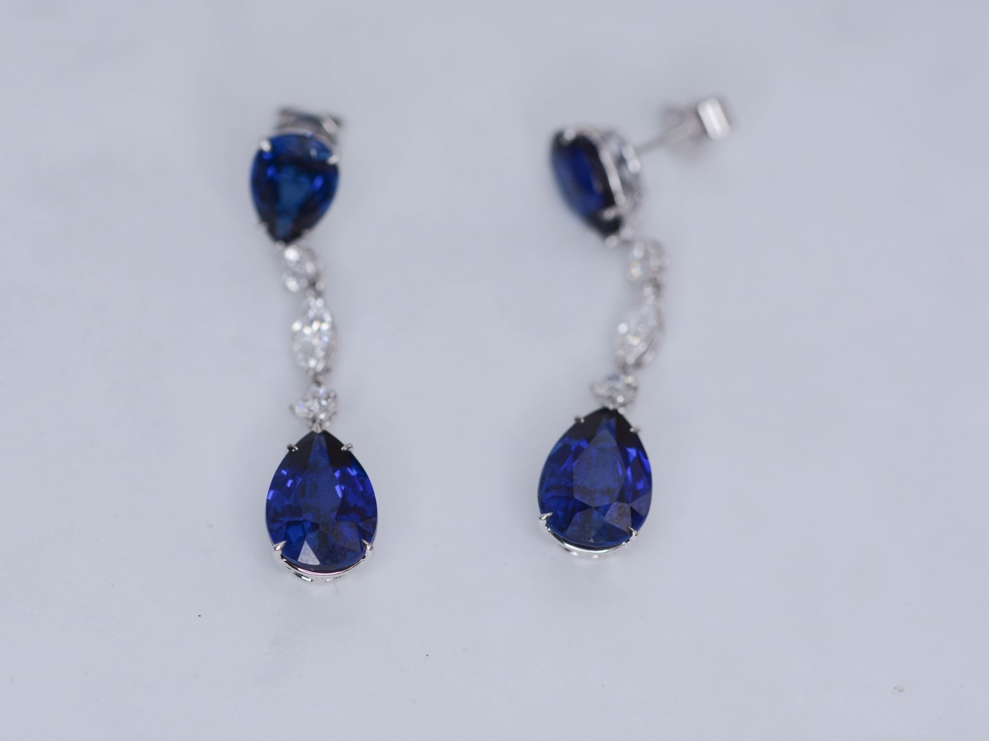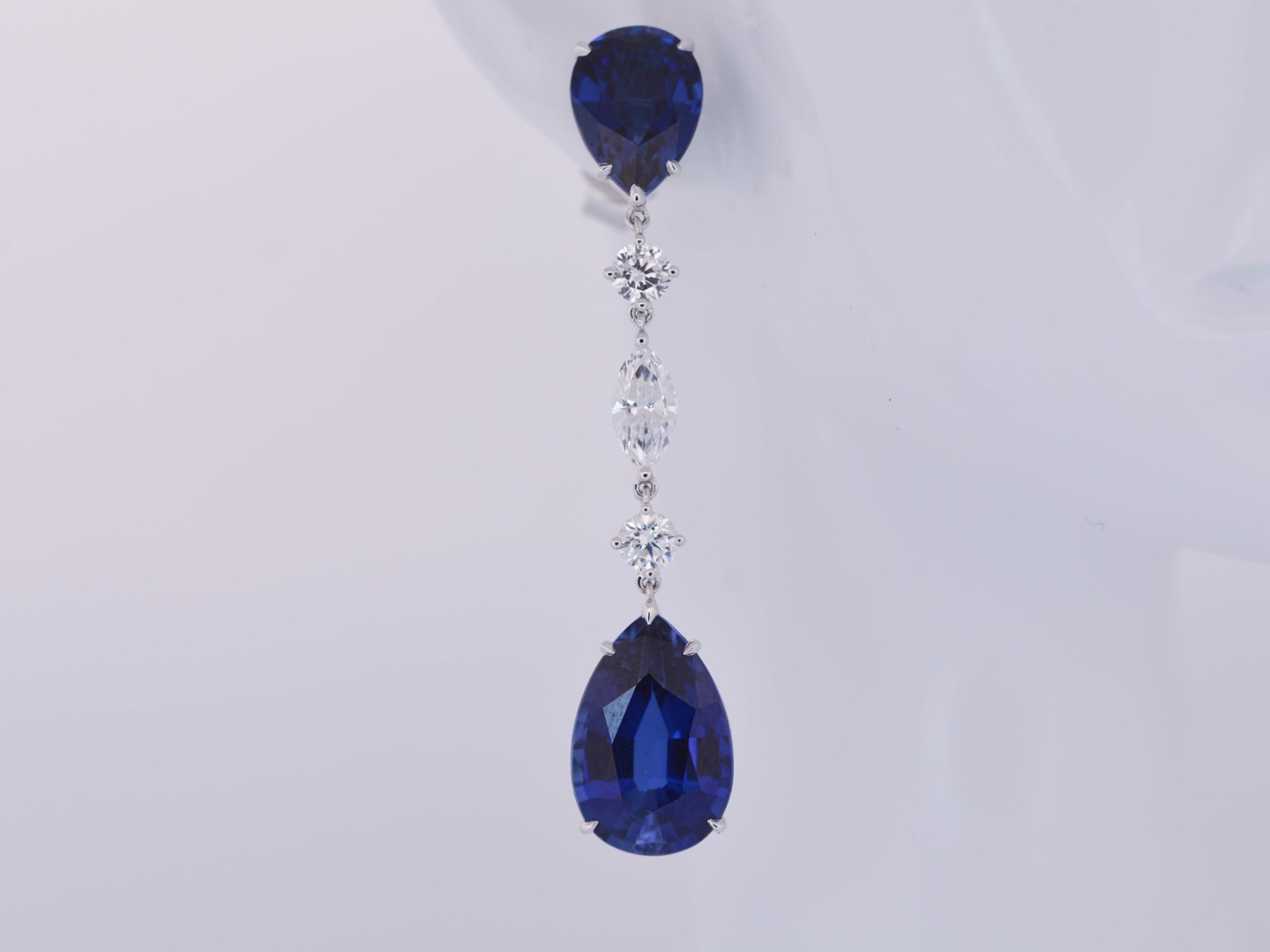 Exclusief paar kwaliteits-oorbellen, vervaardigd in 18 karaat wit goud, bezet met vier saffieren met een gezamenlijk gewicht van circa 20 karaat, die schitteren in een rijke, koninklijke blauwe tint.