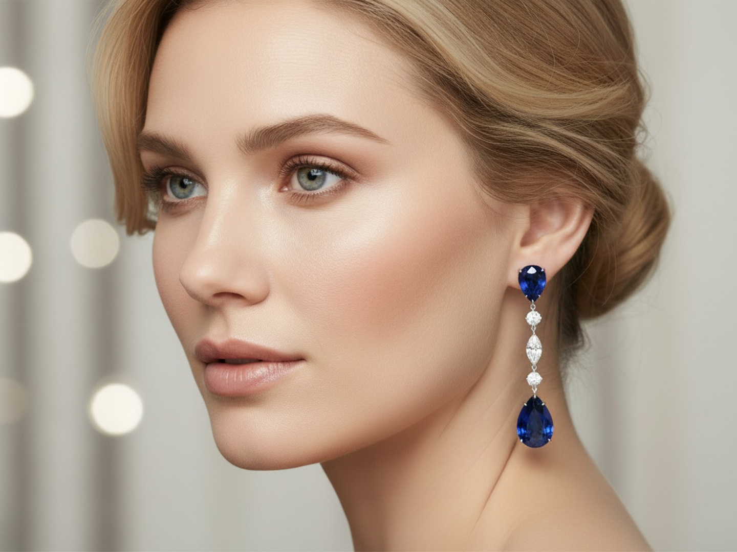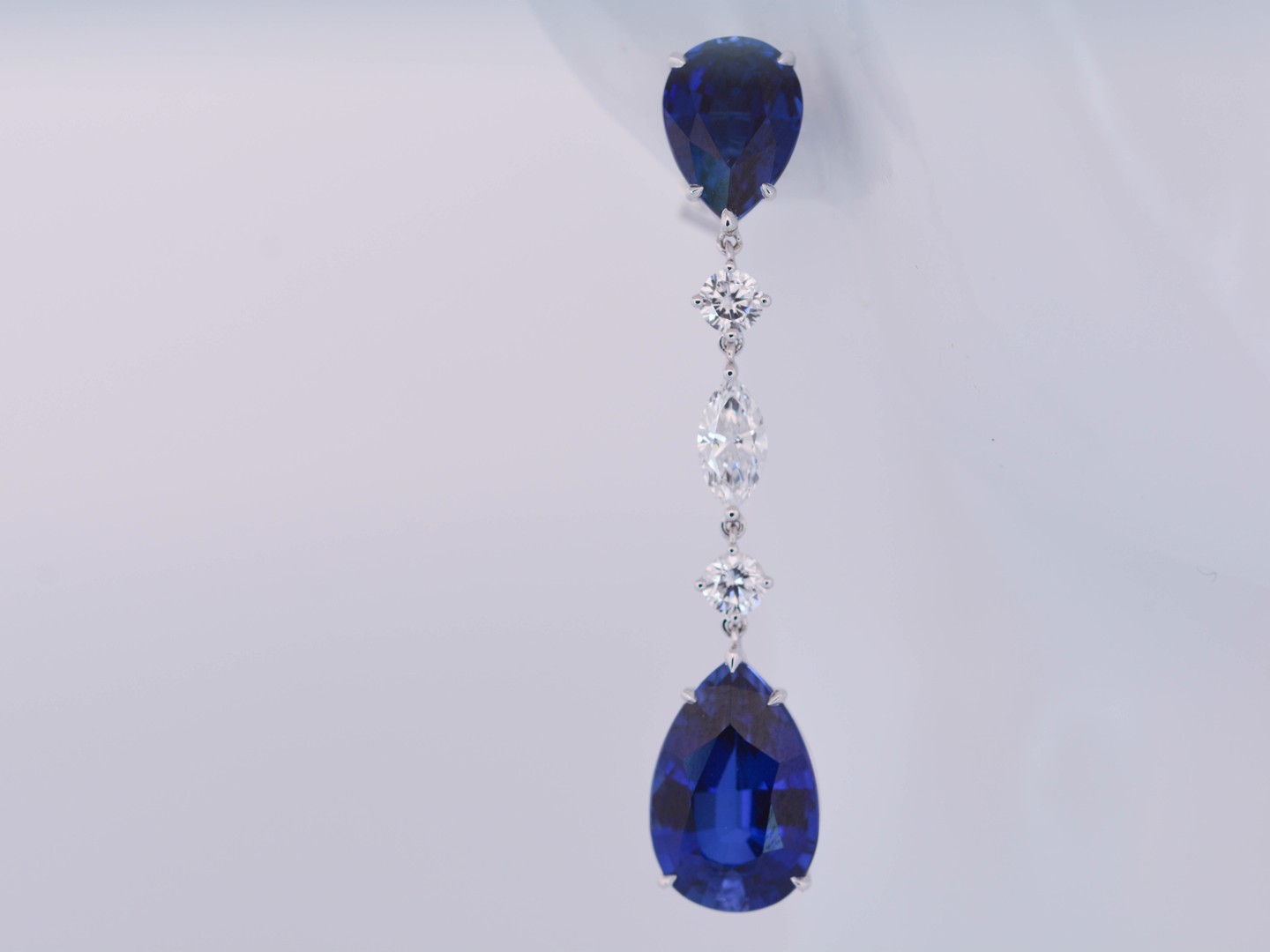 De saffieren worden harmonieus aangevuld door zes witte diamanten, vier briljanten en twee marquisegeslepen diamanten, samen goed voor ongeveer 1,60 karaat.