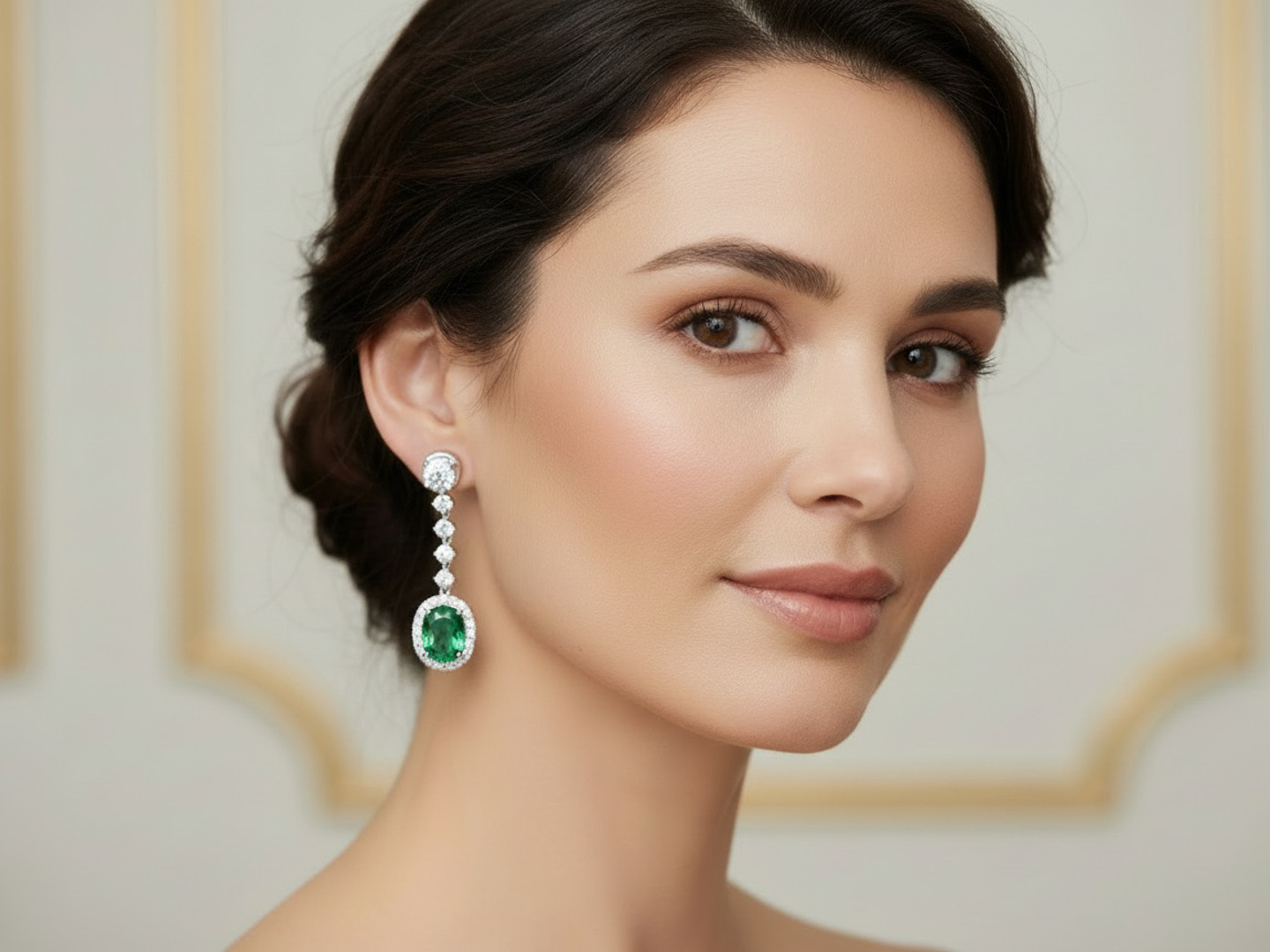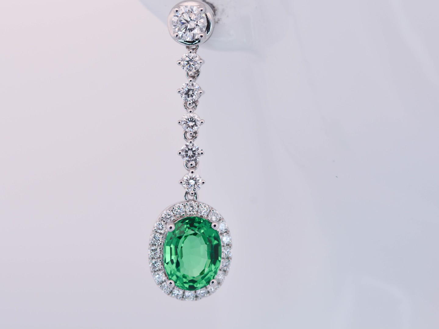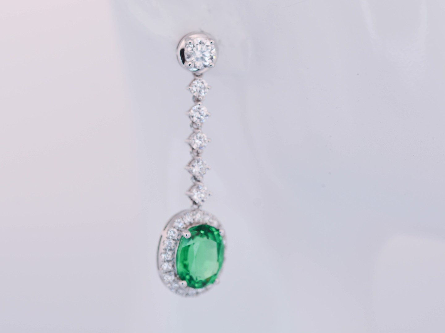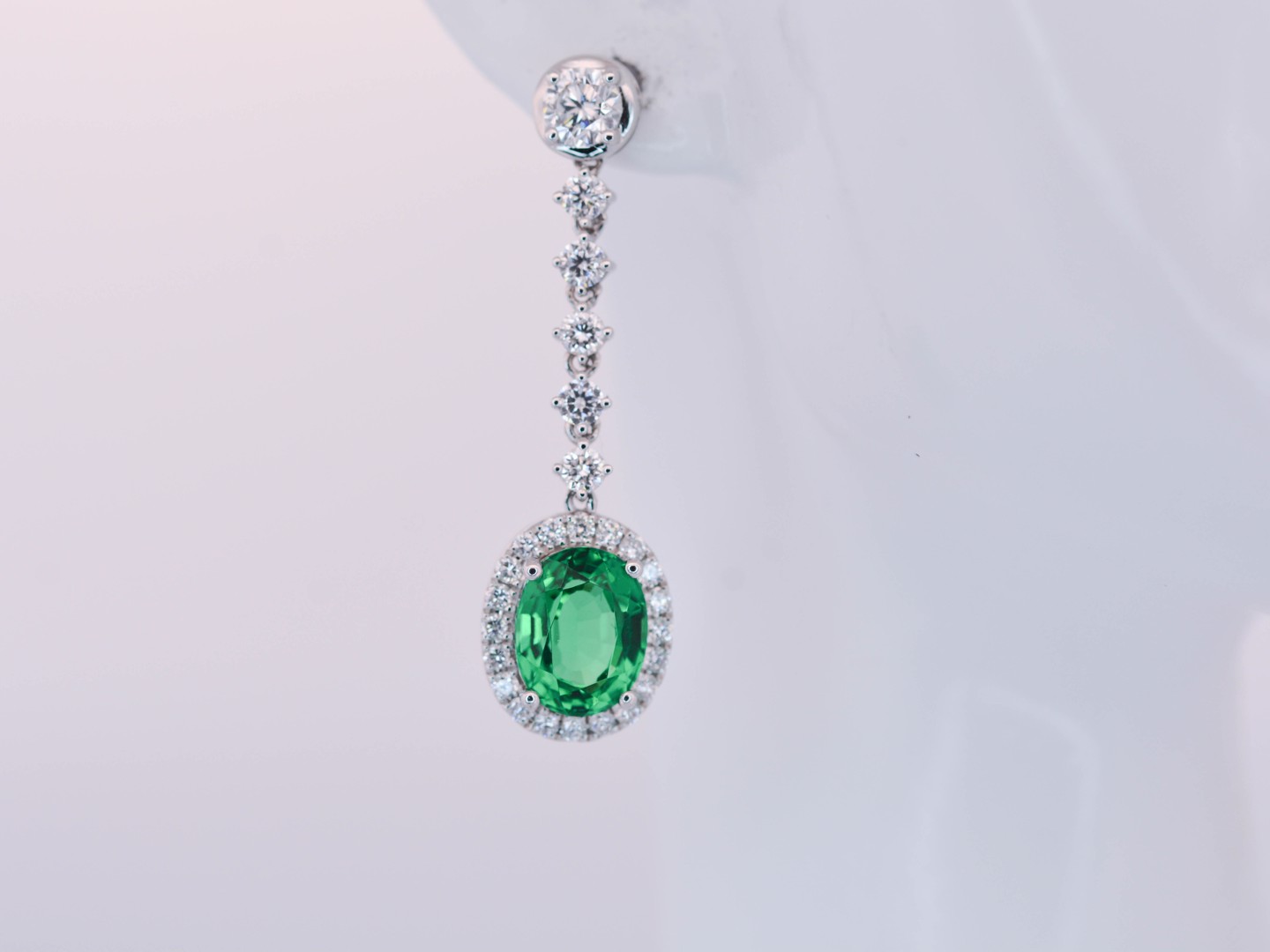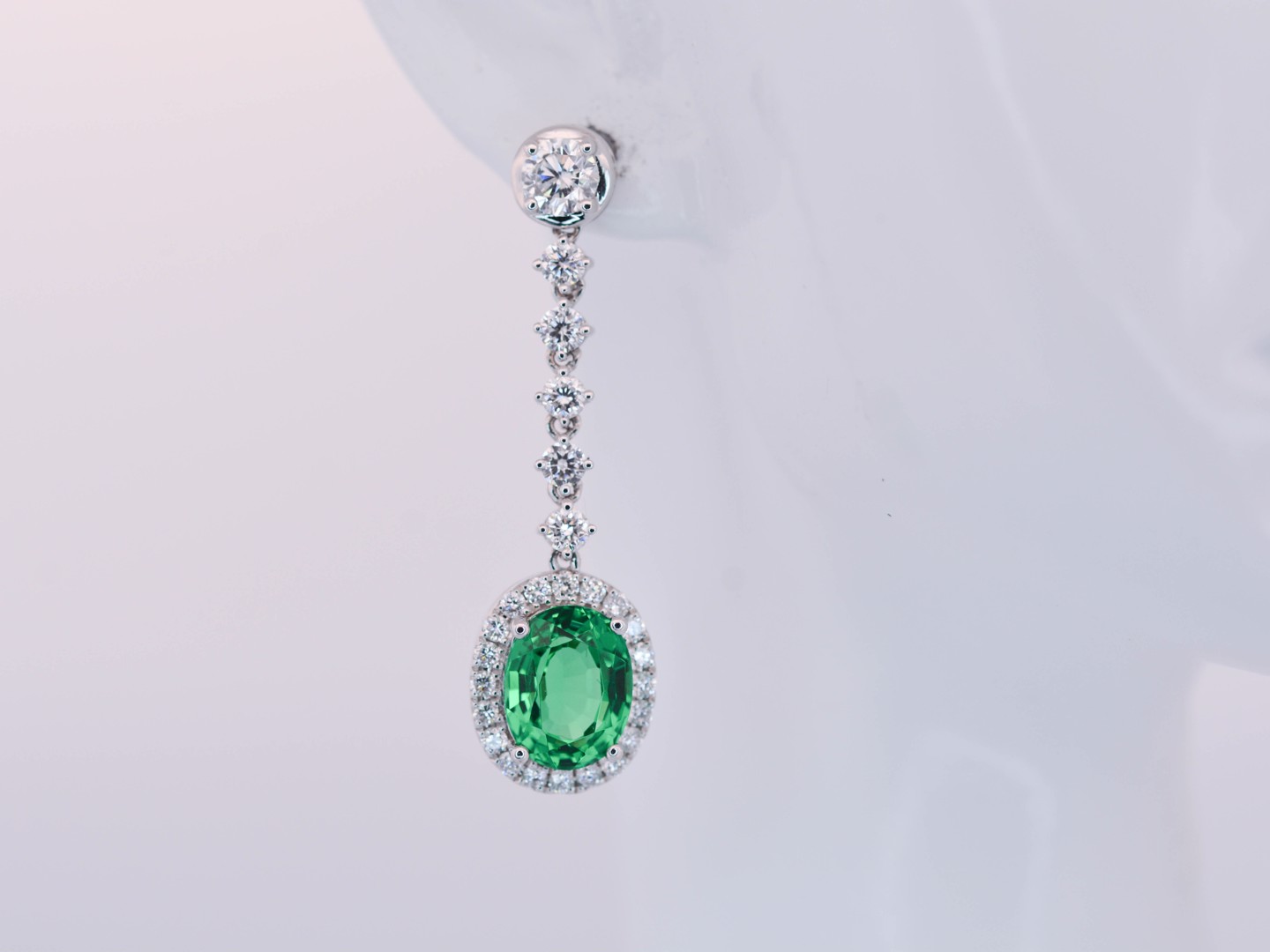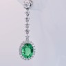 De diamanten, van kleur E–G (Exceptional White) en zuiverheid VS, omlijsten de levendige groene smaragden met fonkelende verfijning.