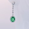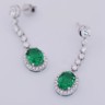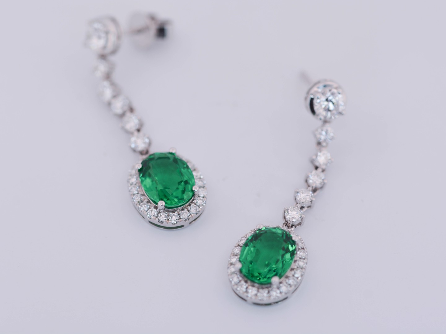 Exclusief paar oorbellen, vervaardigd in 18 karaat wit goud, bezet met twee smaragden met een gezamenlijk gewicht van circa 4 karaat, omringd door briljantgeslepen witte diamanten met een totaalgewicht van ongeveer 2,60 karaat.