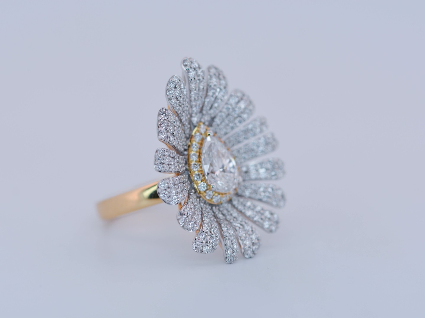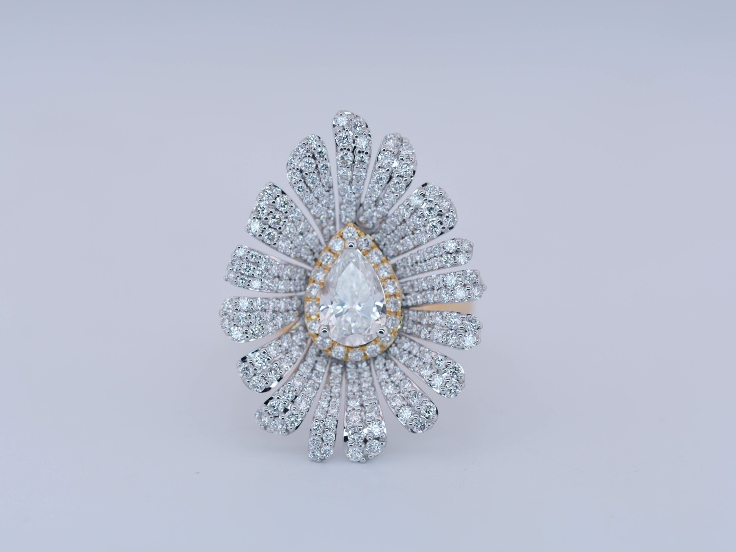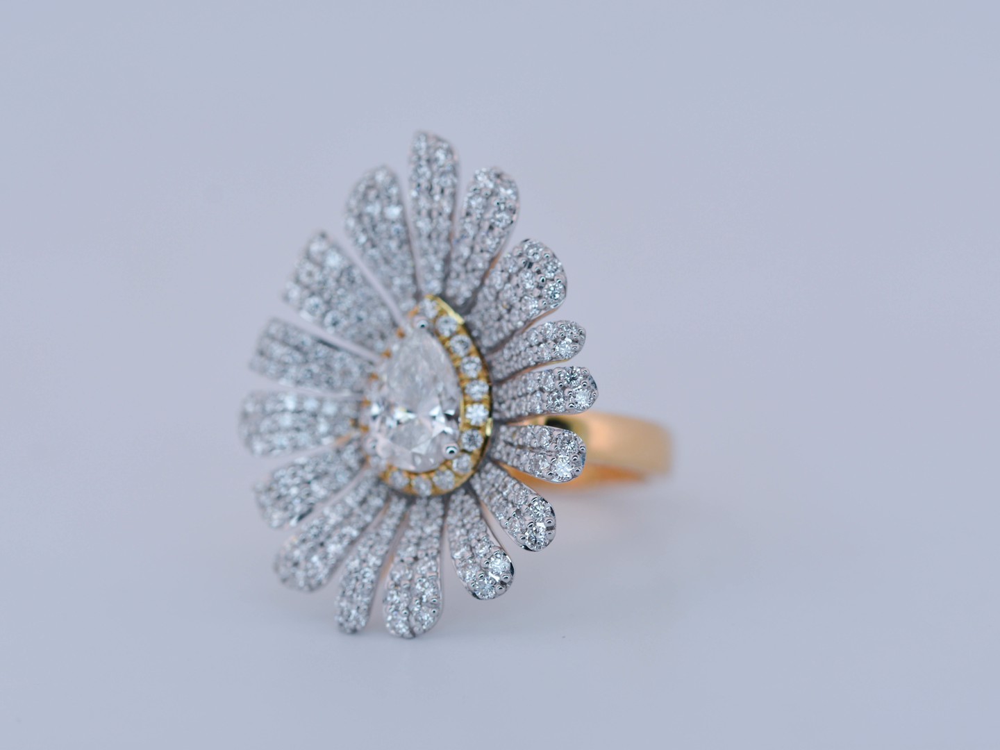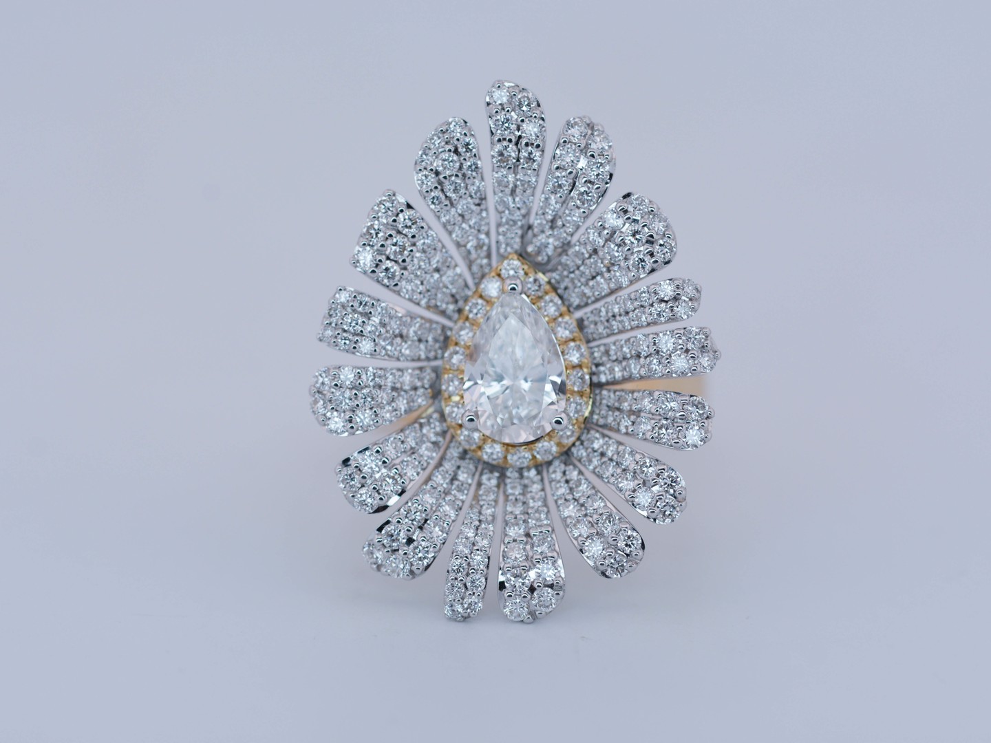 Uitzonderlijke ring, vervaardigd in een harmonieuze combinatie van geel en wit goud, 18 karaat, bezet met een peervormig geslepen diamant van circa 1 karaat, van kleur I en zuiverheid VS.