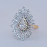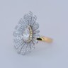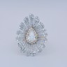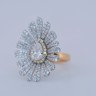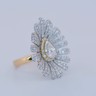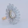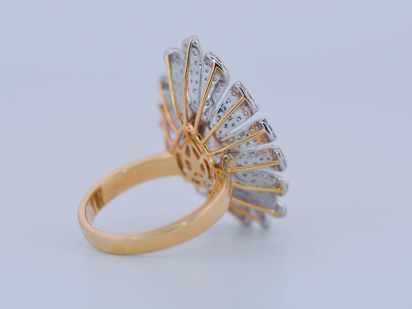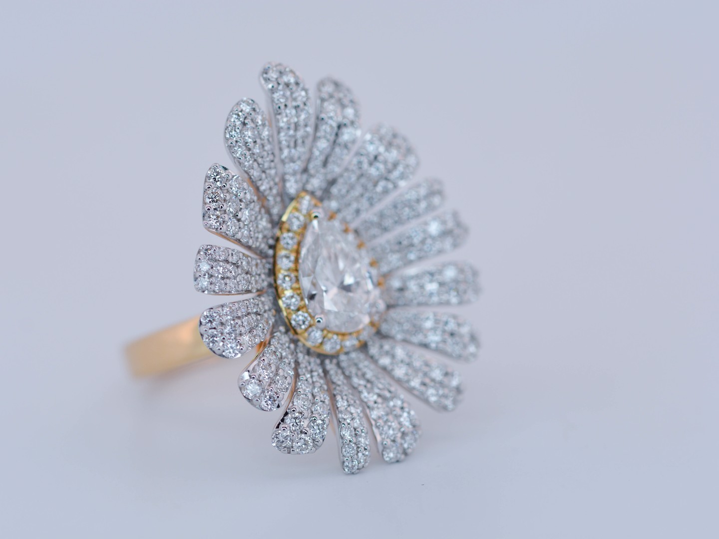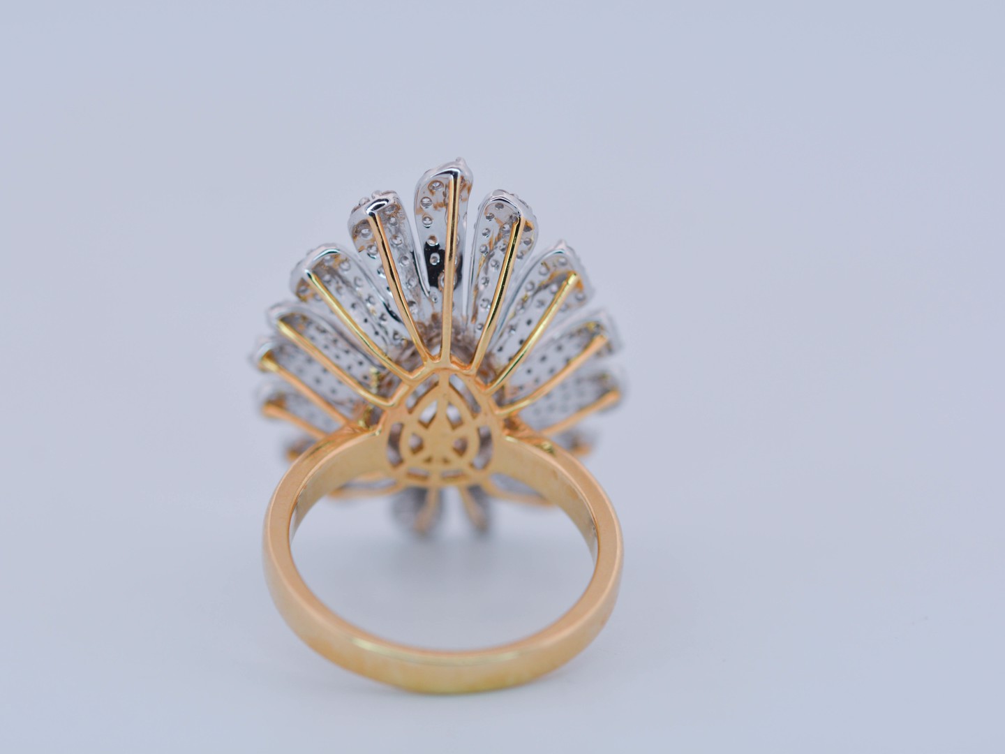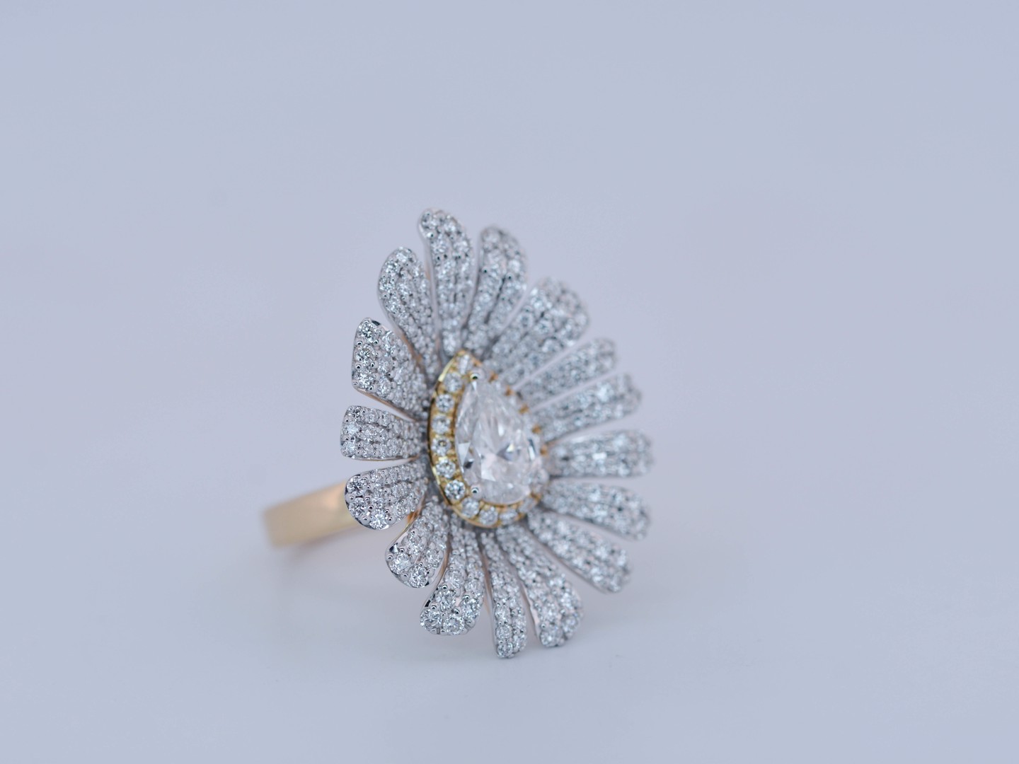 Uitzonderlijke ring, vervaardigd in een harmonieuze combinatie van geel en wit goud, 18 karaat, bezet met een peervormig geslepen diamant van circa 1 karaat, van kleur I en zuiverheid VS.