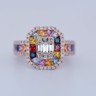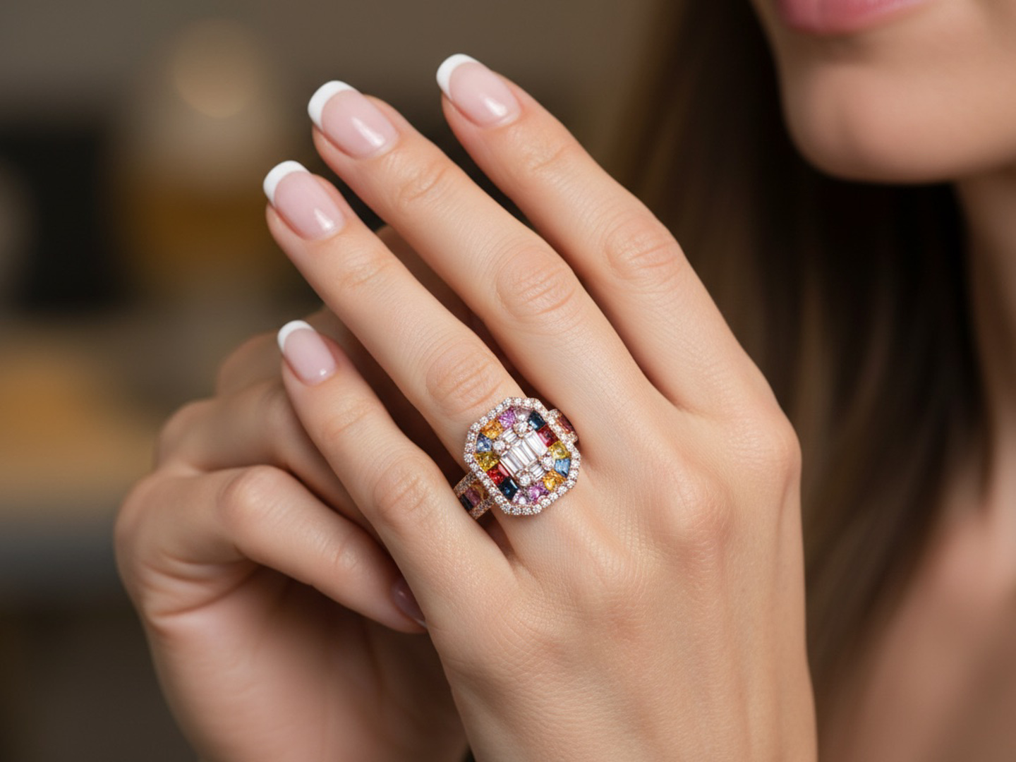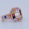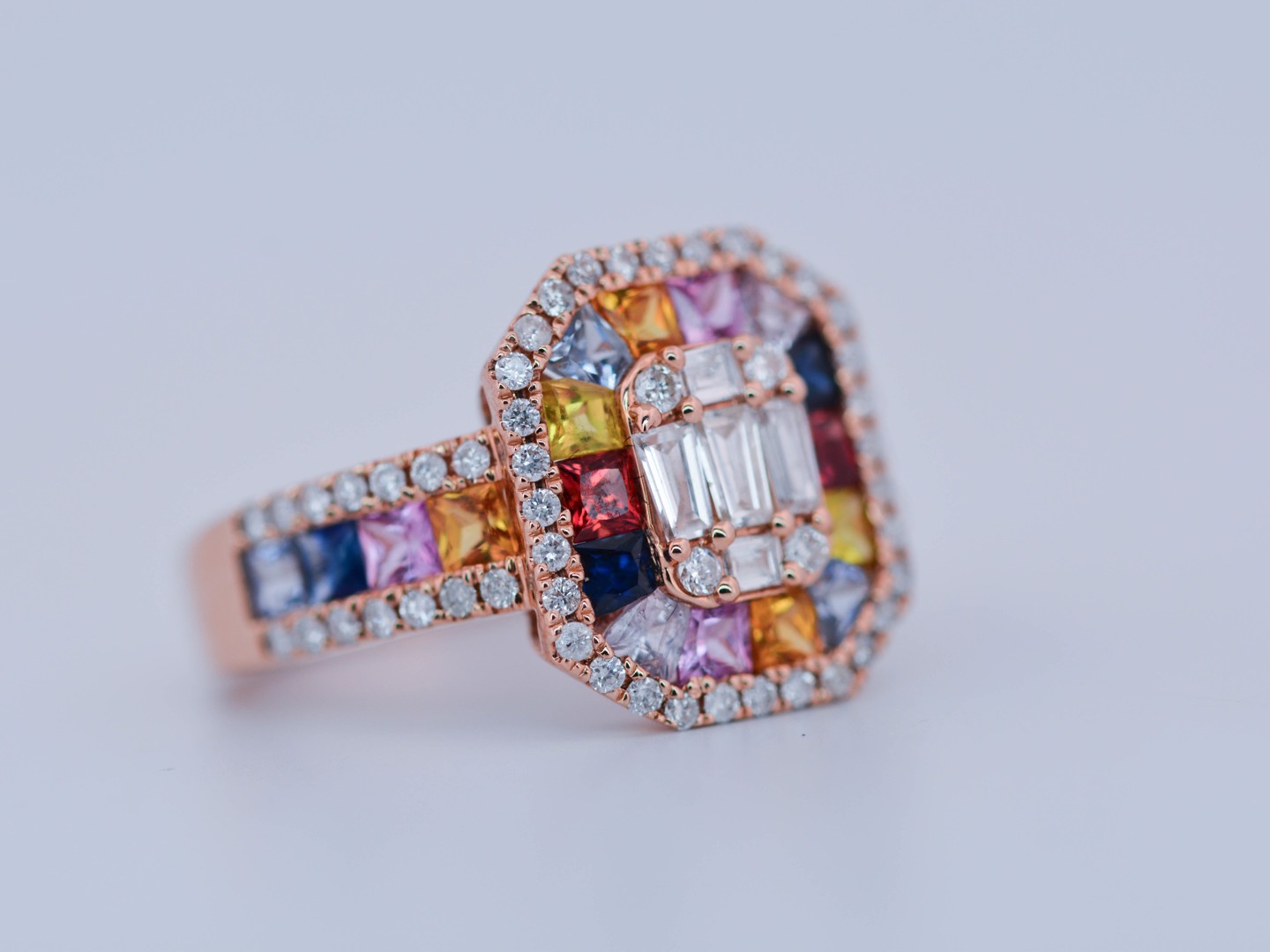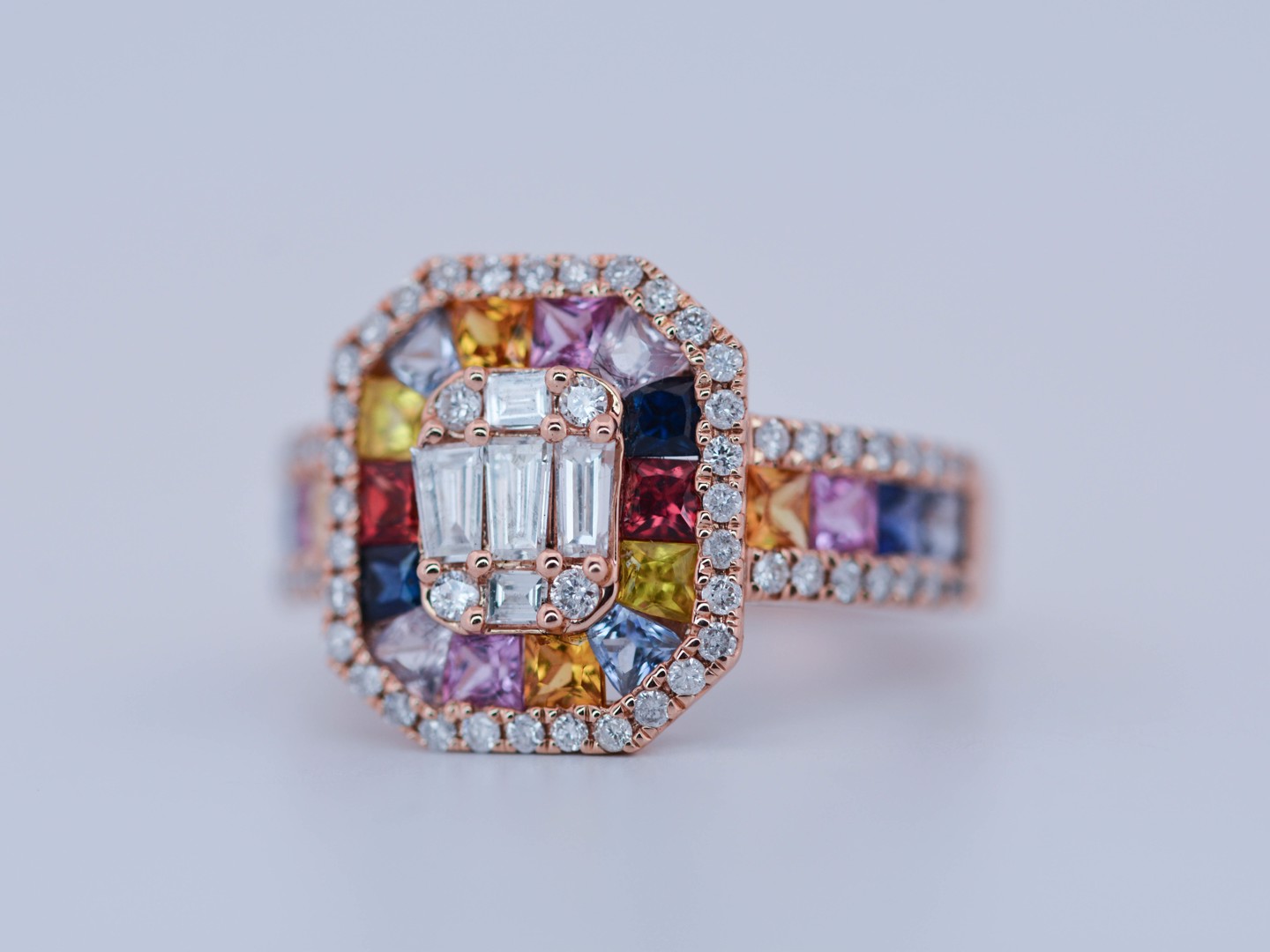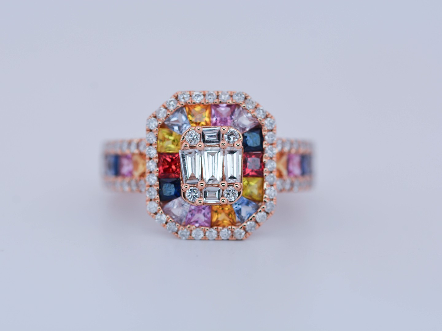 Elegante multicolor ring, bezet met witte diamanten, baguette- en briljantgeslepen, met een totaalgewicht van circa 1 karaat, van kleur F–G (Exceptional White) en zuiverheid VS.