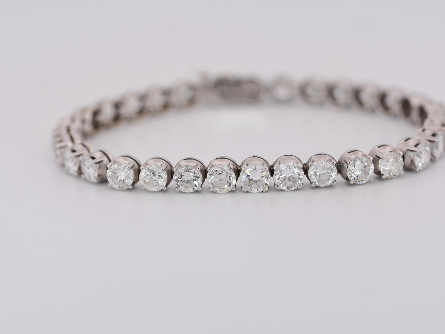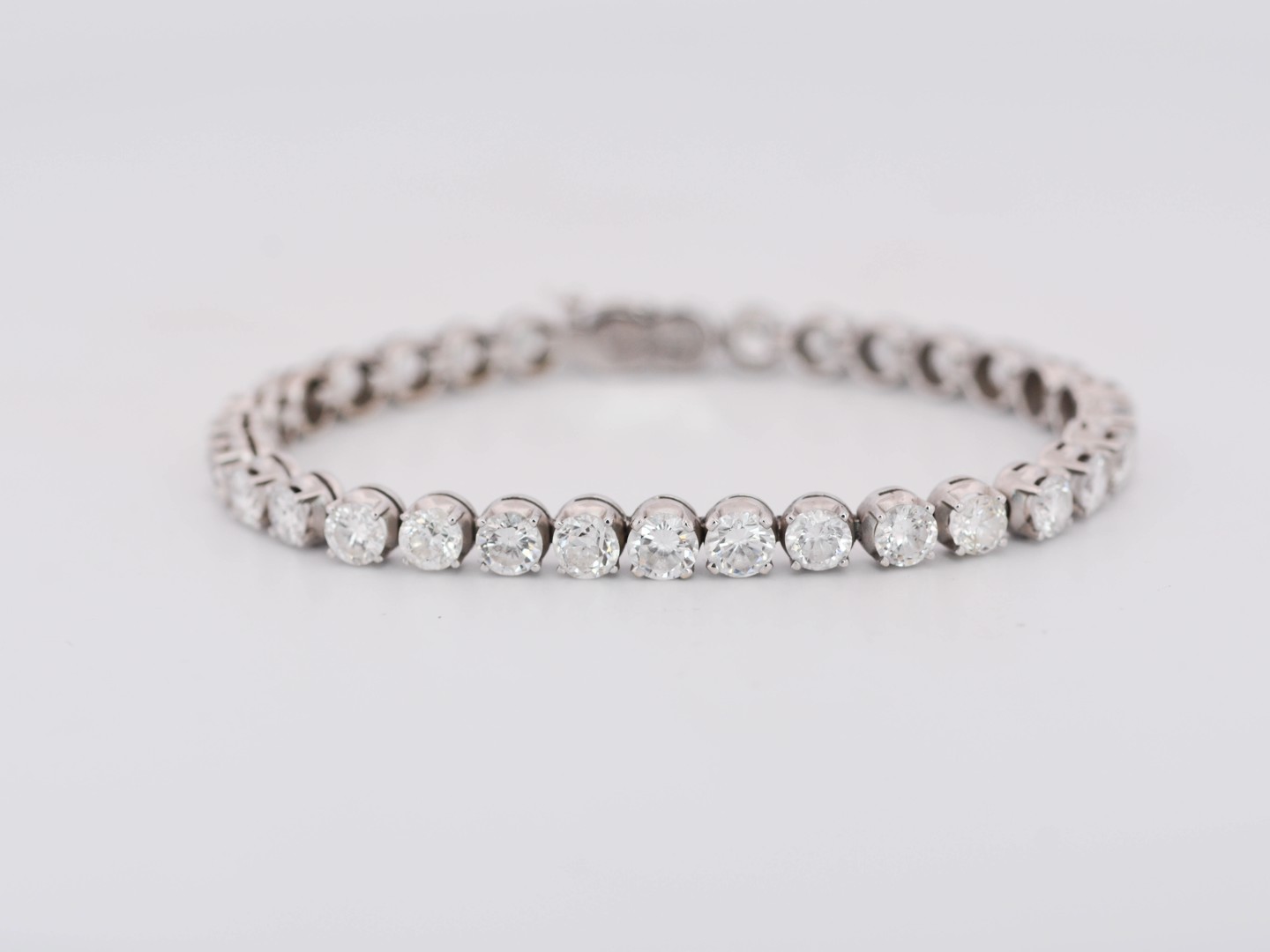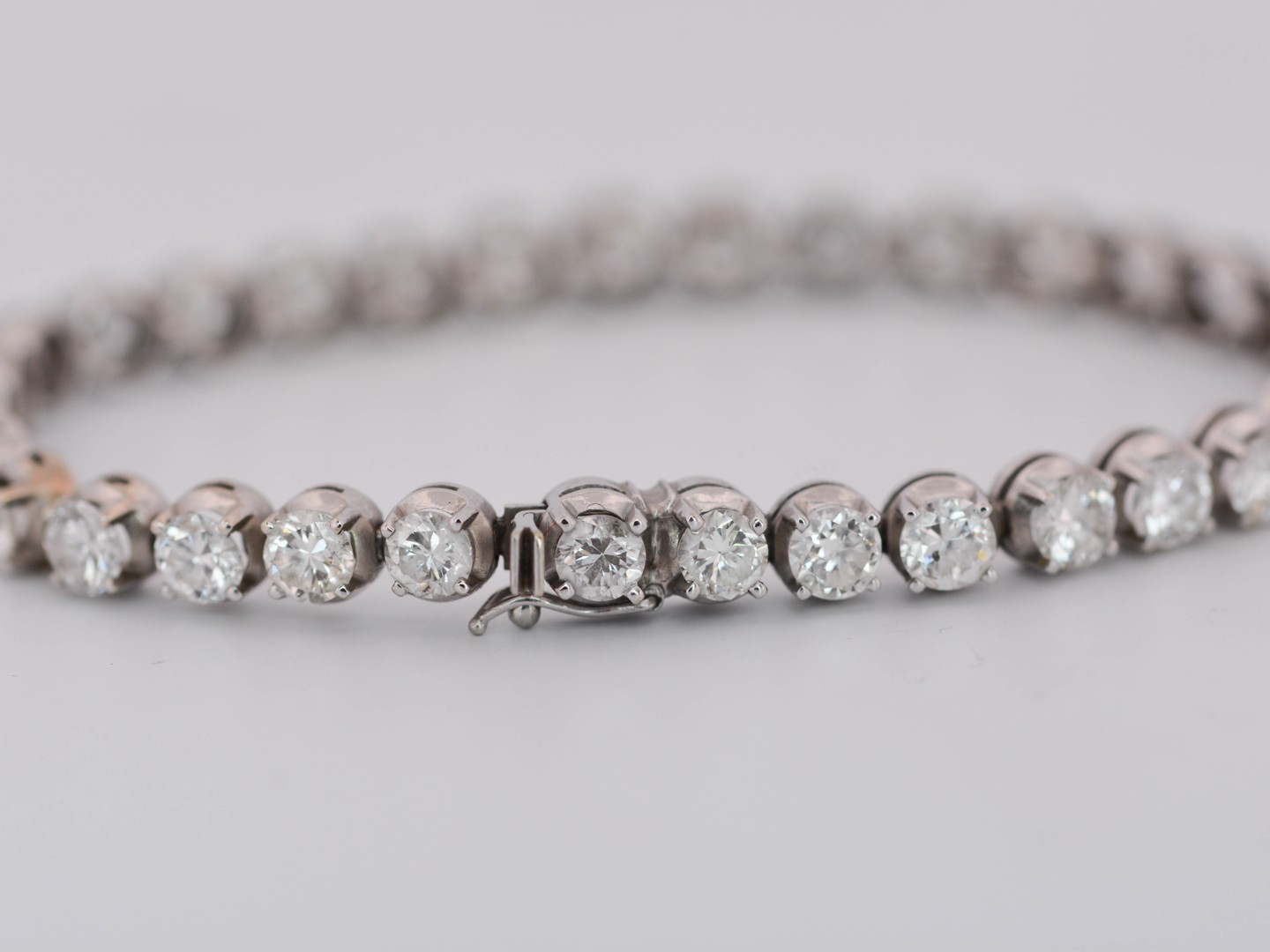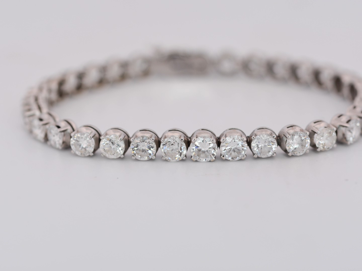 Uitzonderlijke rivière- of tennisarmband, bezet met 32 briljantgeslepen diamanten van uitzonderlijke kwaliteit. De armband telt 14 grotere briljanten van circa 0,50 karaat en 18 briljanten van circa 0,40 karaat, samen goed voor een totaalgewicht van ongeveer 14,20 karaat.
