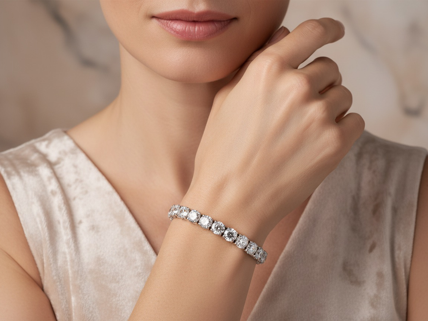 De diamanten, van kleur F–G (Exceptional White) en zuiverheid VS, vormen een perfecte lijn van licht en symmetrie, wat het juweel zijn iconische en tijdloze uitstraling geeft.