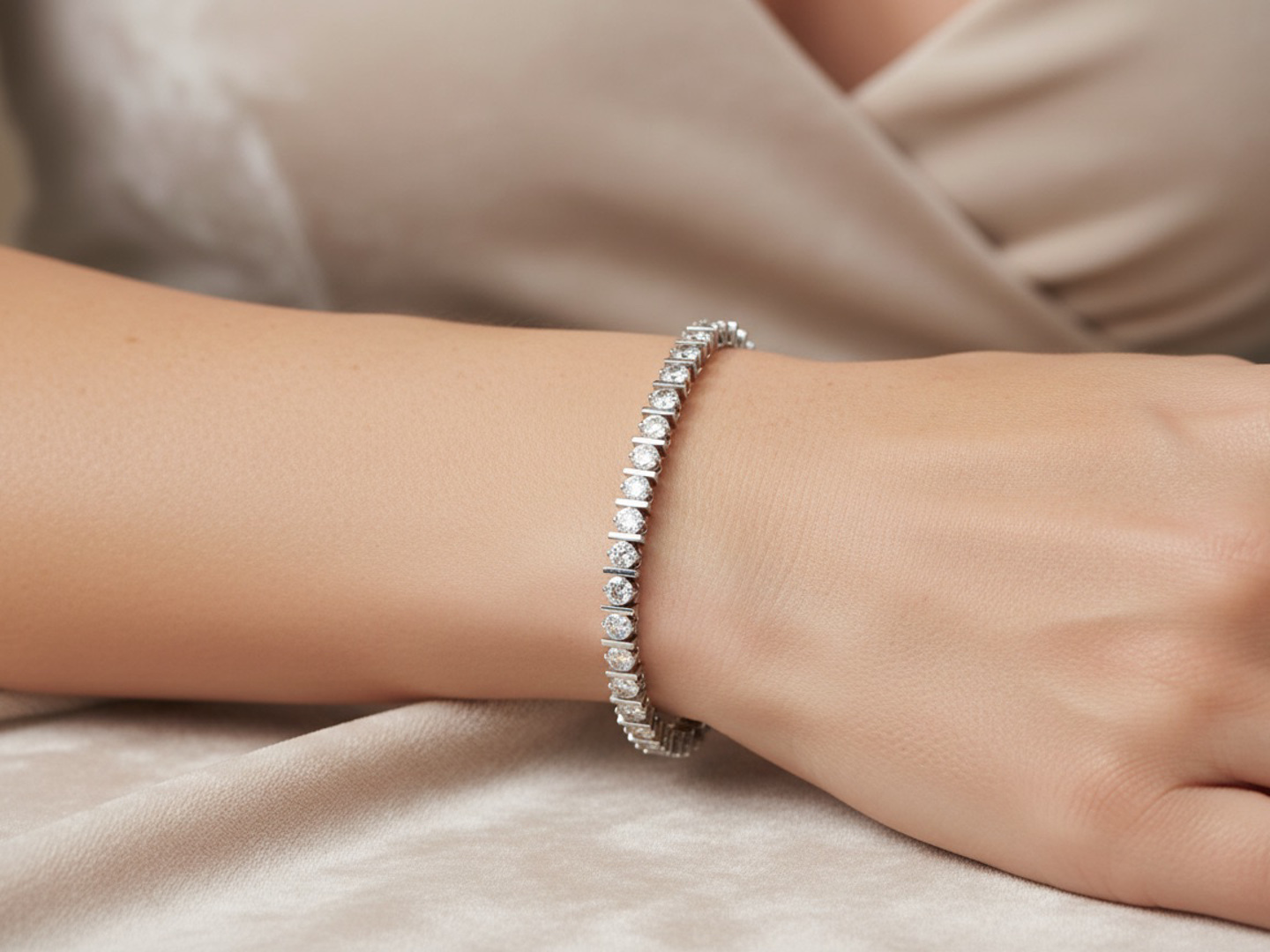 De diamanten, van kleur F–G (Exceptional White) en zuiverheid VS, vormen een naadloze rij van schittering en licht — een toonbeeld van balans, perfectie en tijdloze schoonheid.