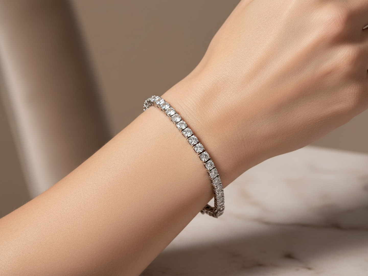 De diamanten, van kleur F–G (Exceptional White) en zuiverheid VS, vormen een perfecte aaneenschakeling van licht en schittering — een tijdloos symbool van elegantie en klasse.