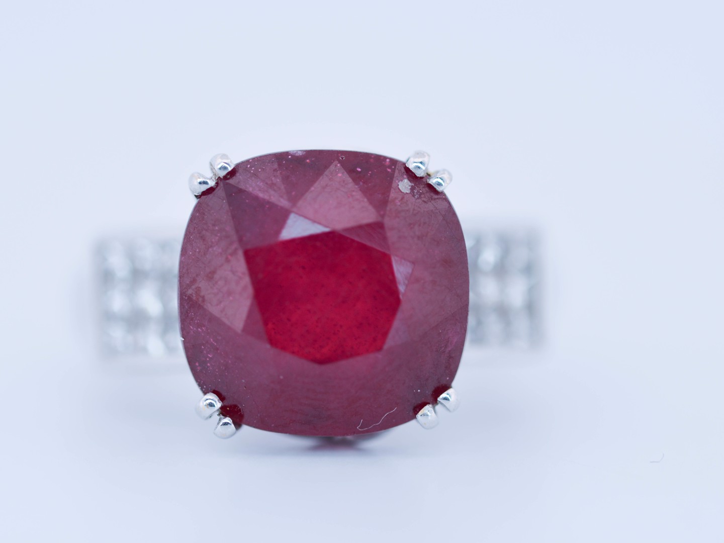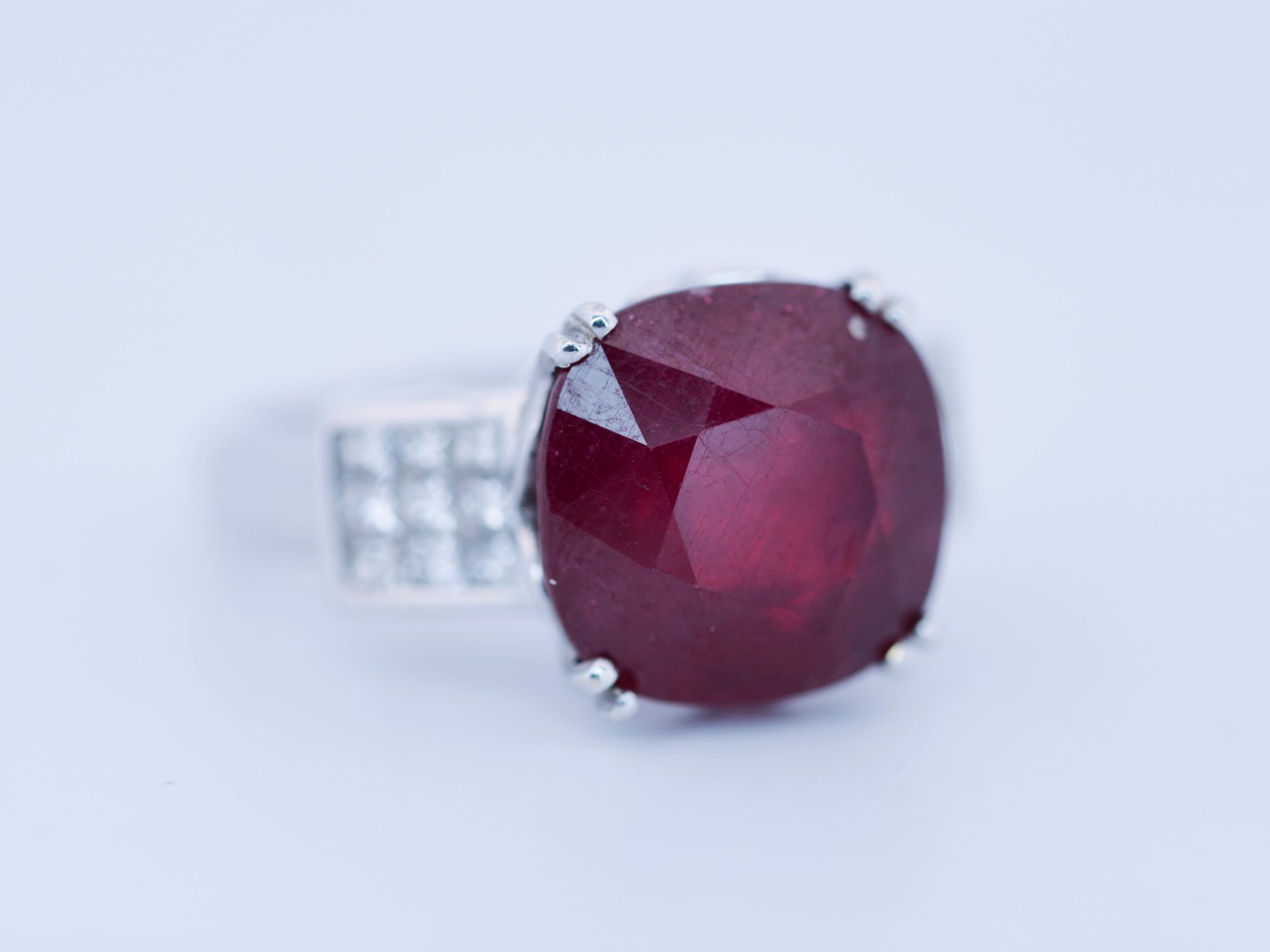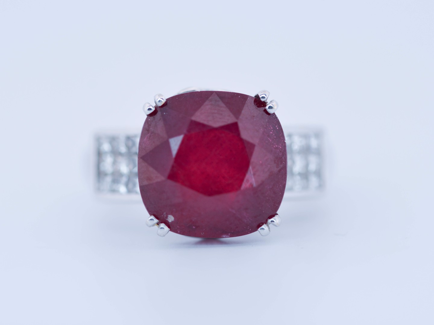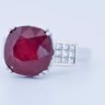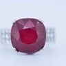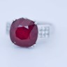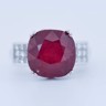 Exclusieve ring bezet met een indrukwekkende ruby van circa 12 karaat, rijk van kleur en met een natuurlijke, levendige schittering.
