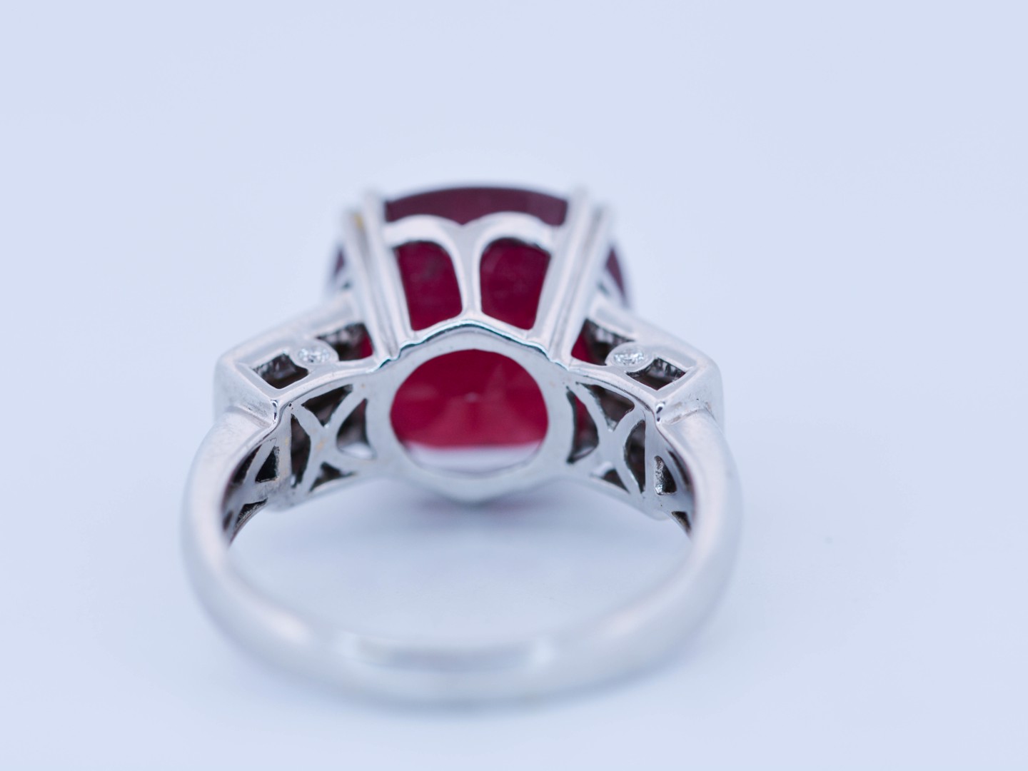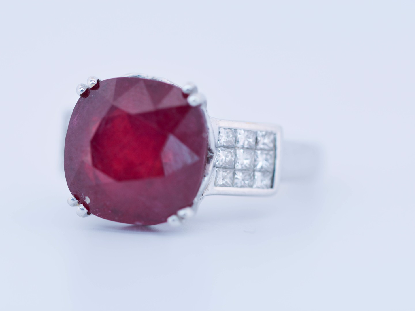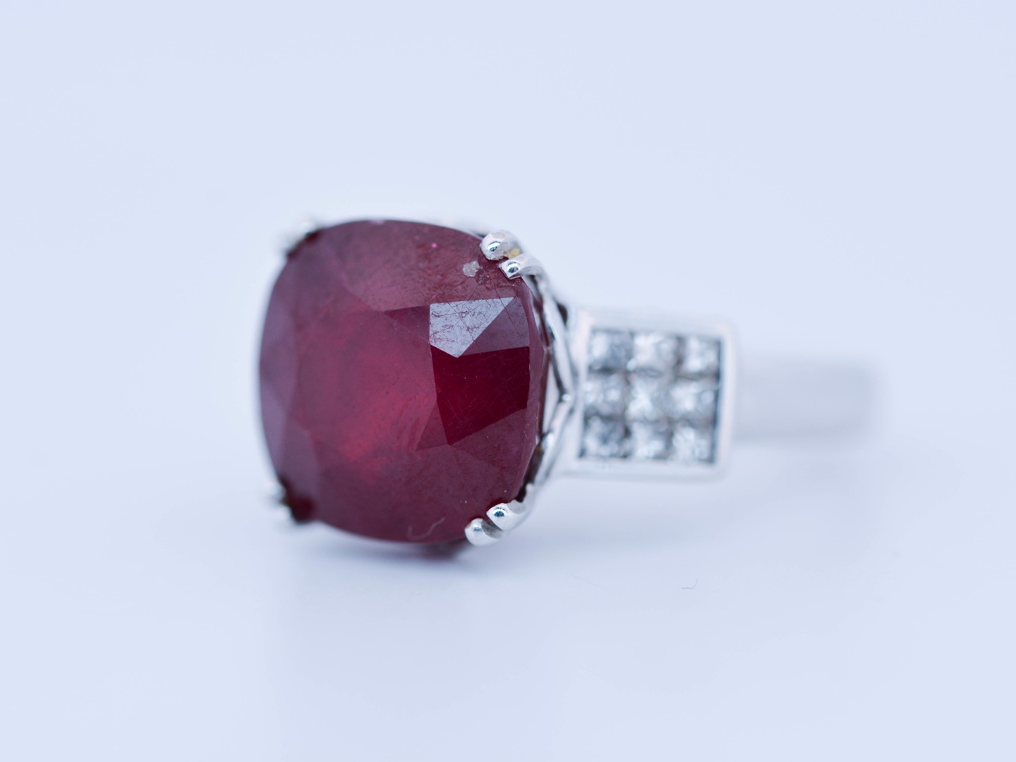 Exclusieve ring bezet met een indrukwekkende ruby van circa 12 karaat, rijk van kleur en met een natuurlijke, levendige schittering.