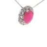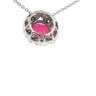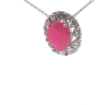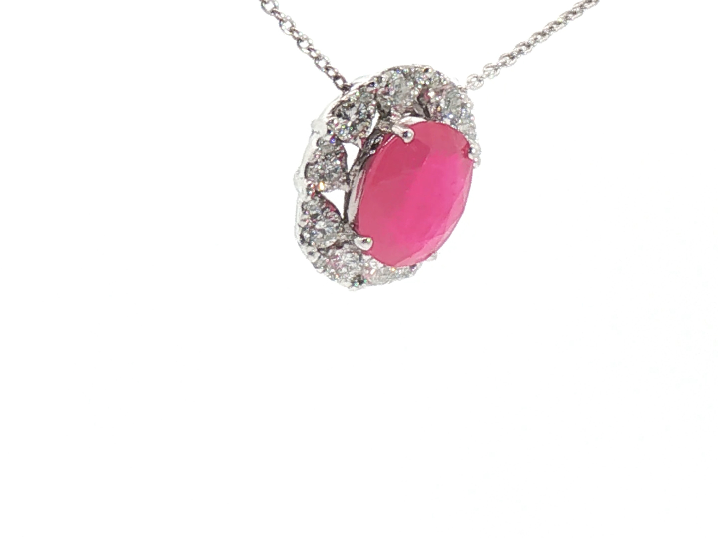 Een verfijnde en bijzonder charmante hanger, centraal gezet met een prachtige robijn van circa 3 karaat. De warme, levendige rode kleur van de steen wordt schitterend aangevuld door een krans van 10 briljantgeslepen diamanten van samen ongeveer 1 karaat, in de heldere kleurtinten F–G en met een uitzonderlijke VVS1-zuiverheid.