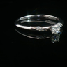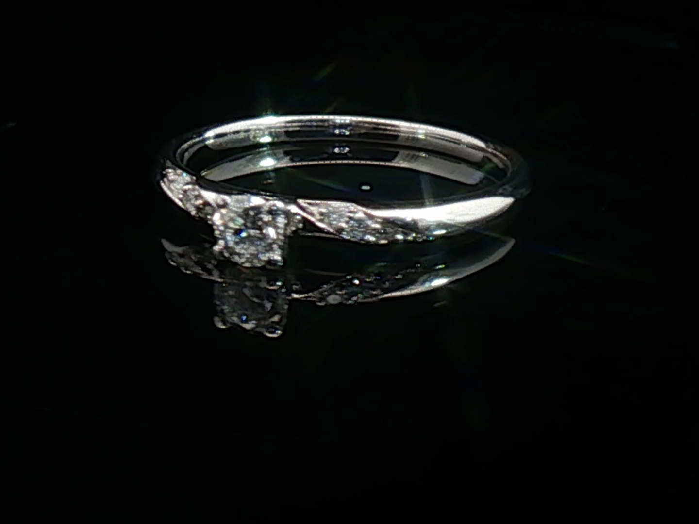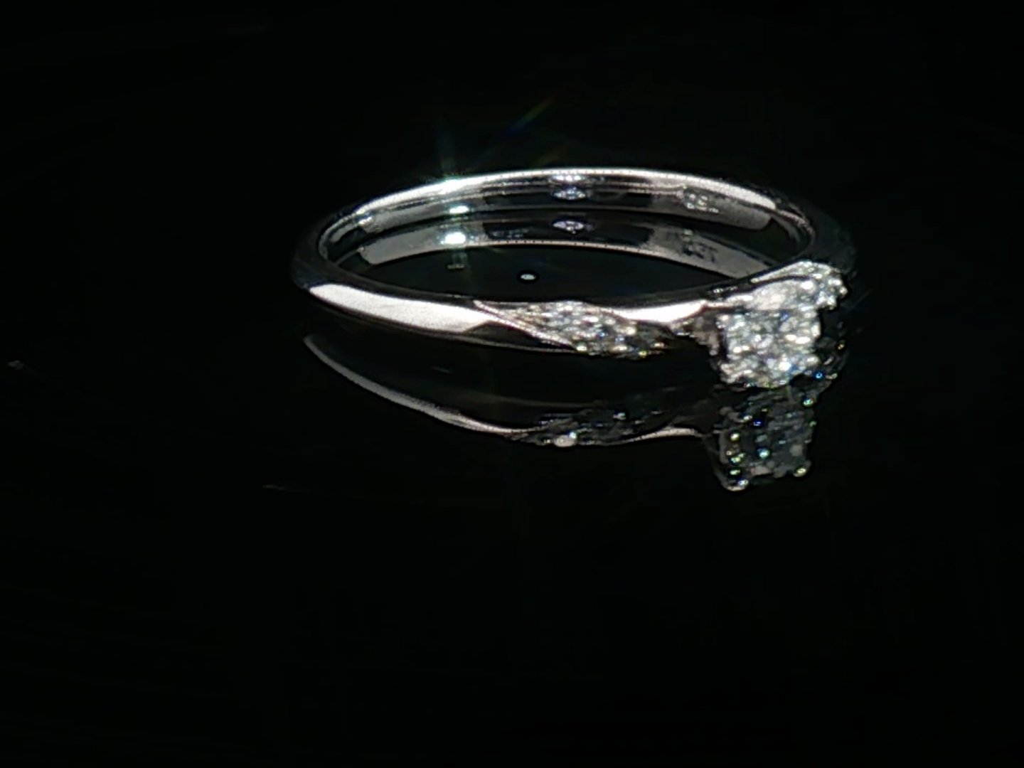 Fijne ring bezet met 7 witte diamanten. 1 briljant: +-0.20ct + 6 kleine briljanten. Kleur: F-G en zuiverheid: VS. Ingezet in wit goud 18kt (gemerkt 750). Ringmaat: 51-54. Gewicht: 2,40 gram