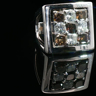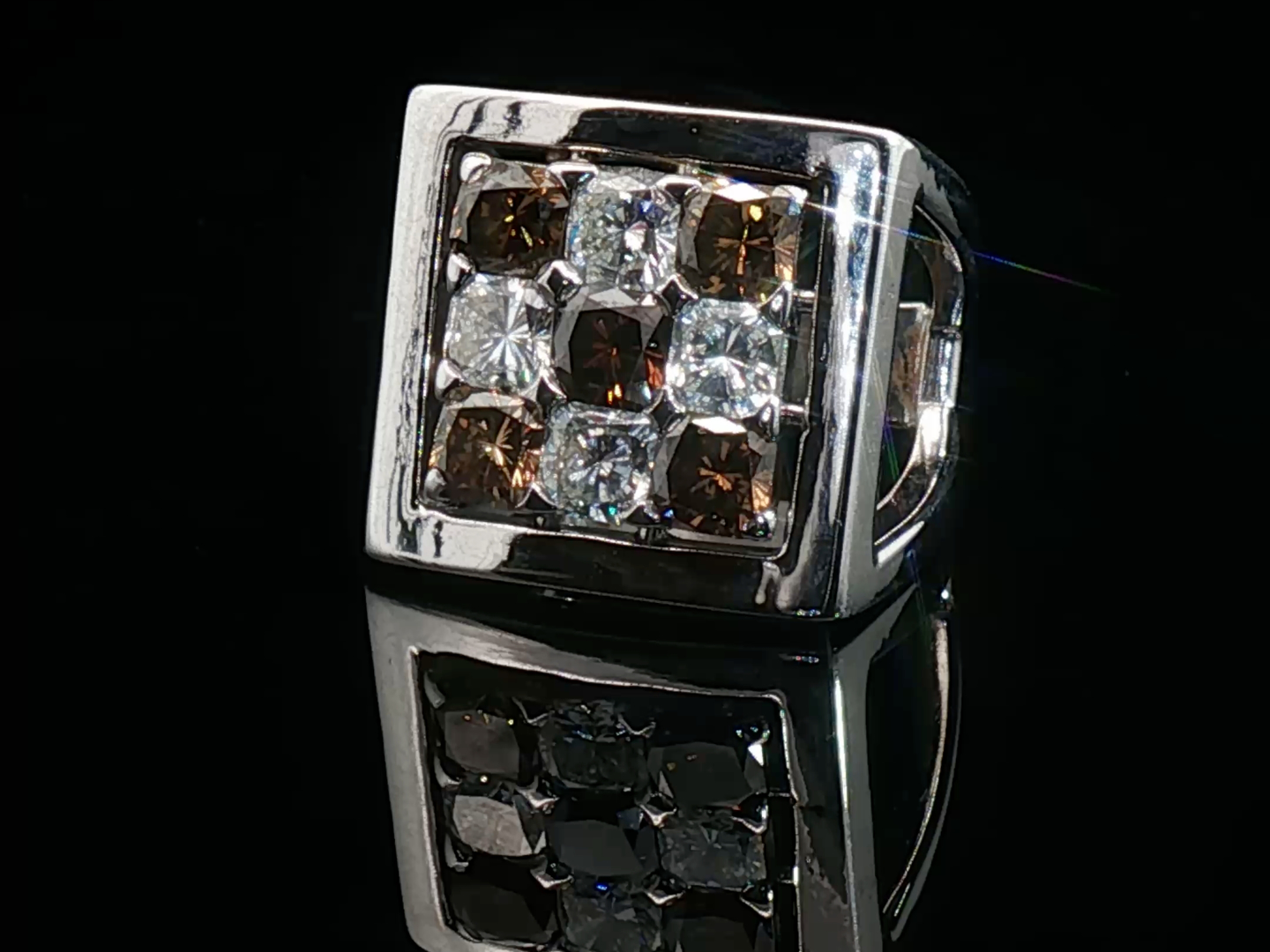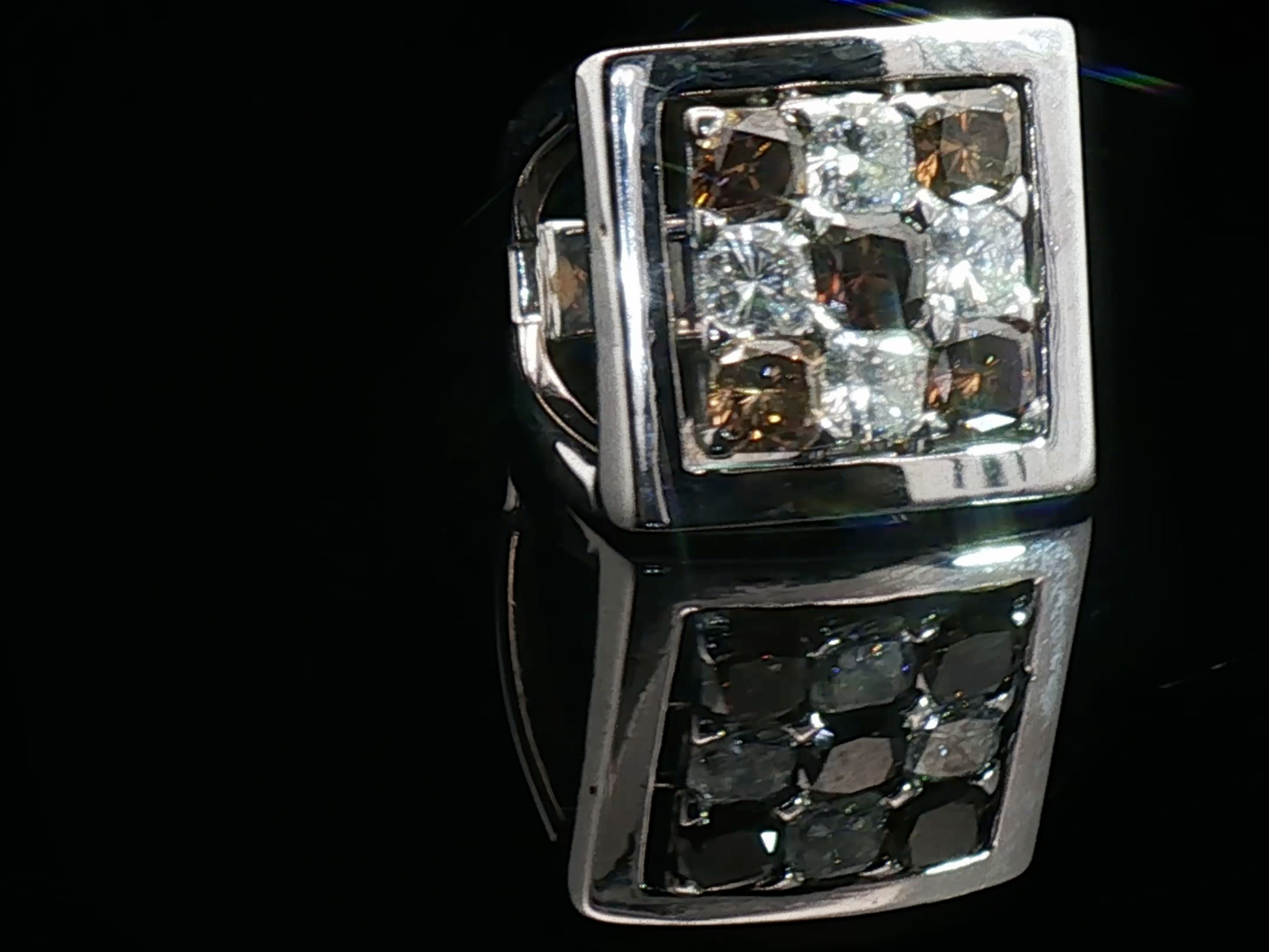 Exclusieve ring juwelier Quijo bezet met 4 witte diamanten radiant geslepen +- 1.00ct. en 5 brownish diamanten radiant geslepen +- 1.25ct. ingezet in wit goud 18kt. ring +- 18 mm. op 18 mm. gewicht: 14,94 gram