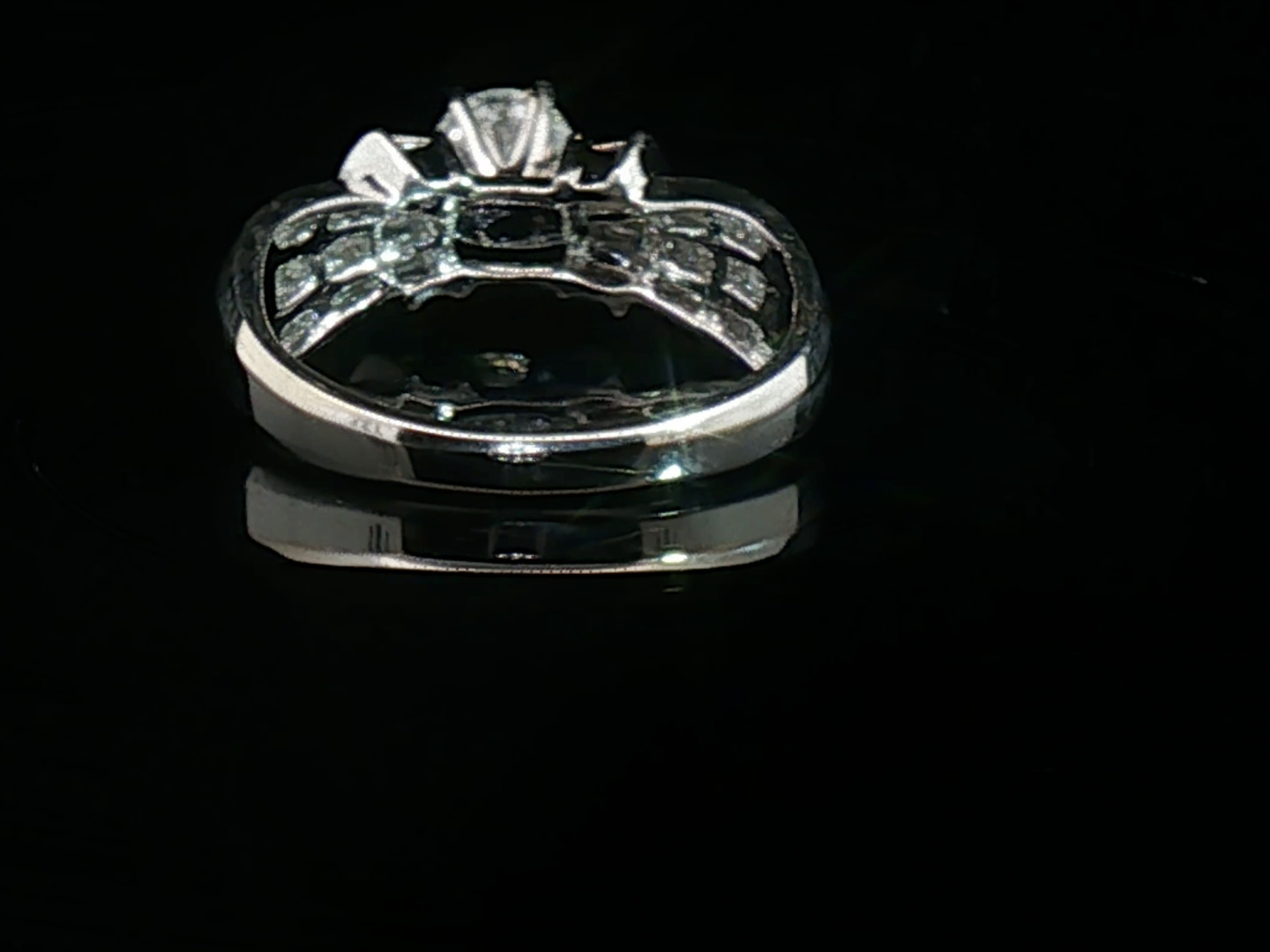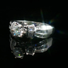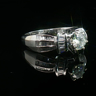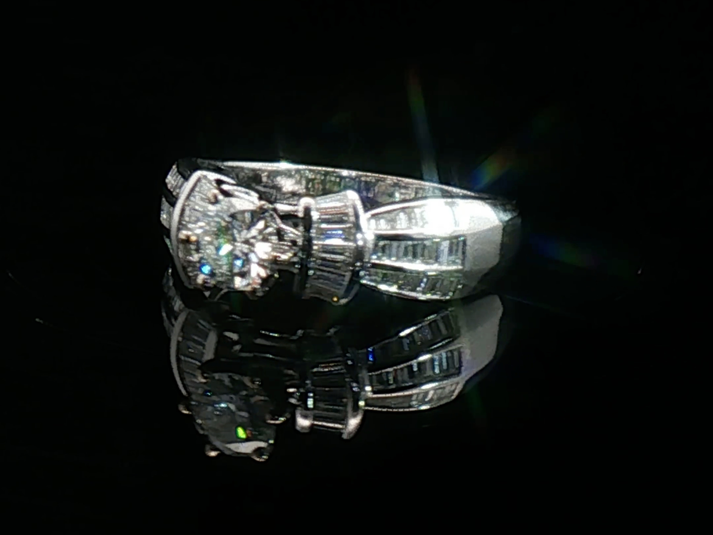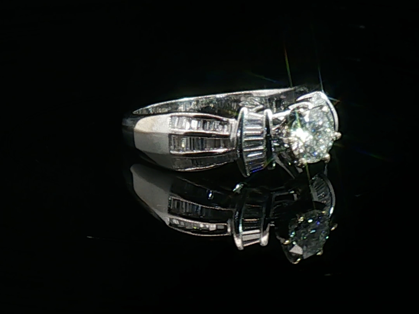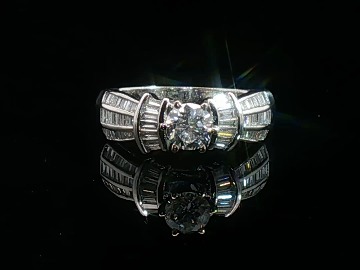 Elegante ring bezet met witte diamanten: 1 briljant geslepen: +-0.55ct, kleur: G-H en zuiverheid: VS. Omringd door +-50 kleine baguette geslepen diamanten: +-0.50ct, kleur: G-H en zuiverheid: VS. Ingezet in wit goud 18kt (gemerkt 750). Ringmaat: 52-55