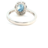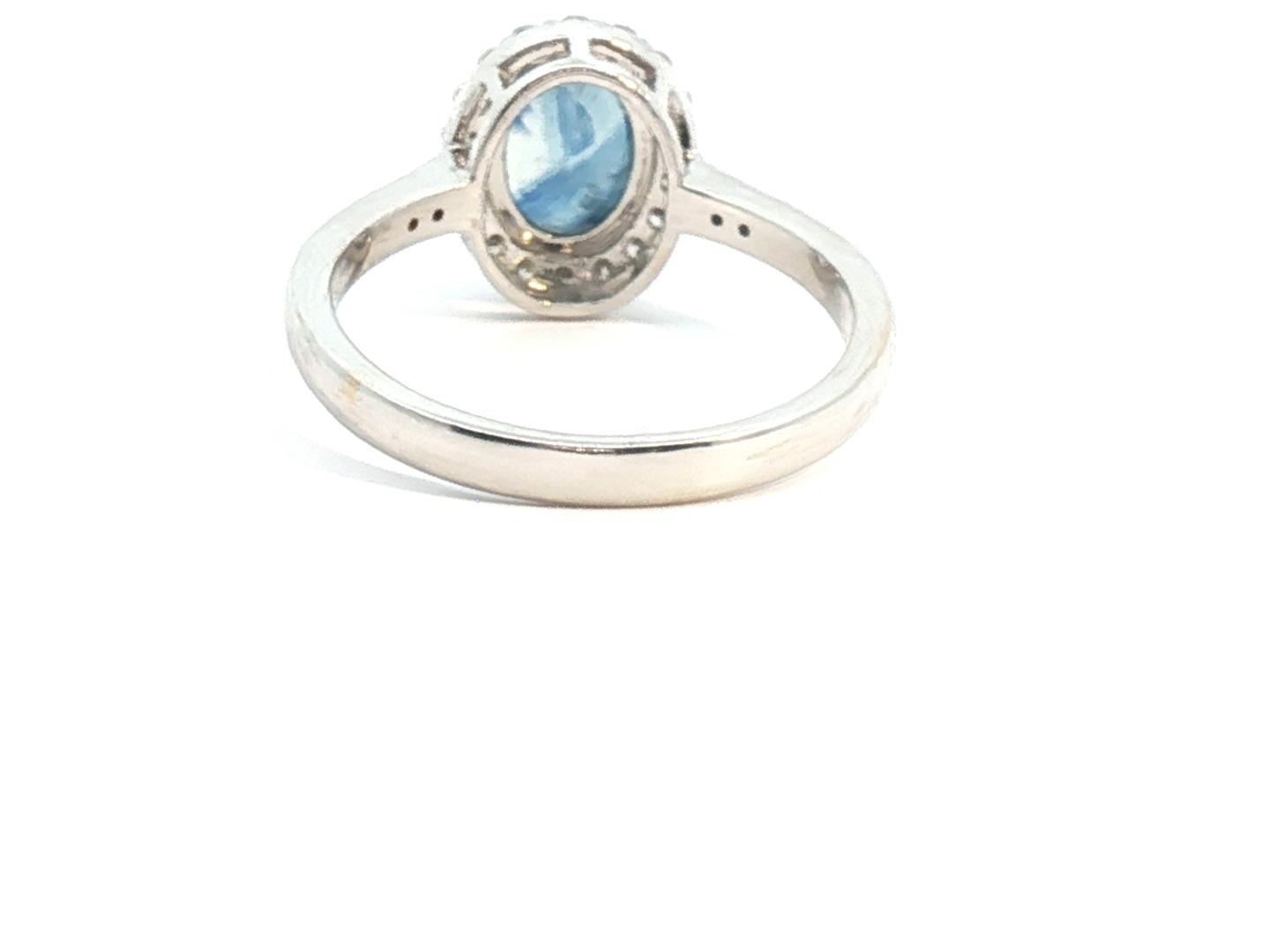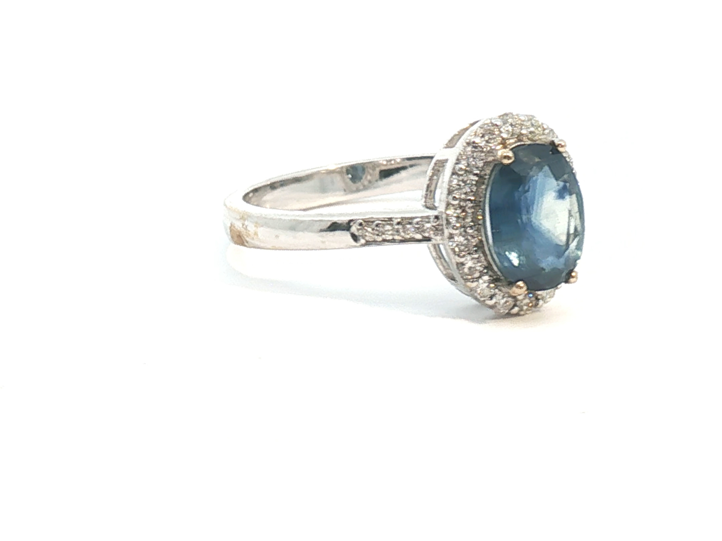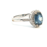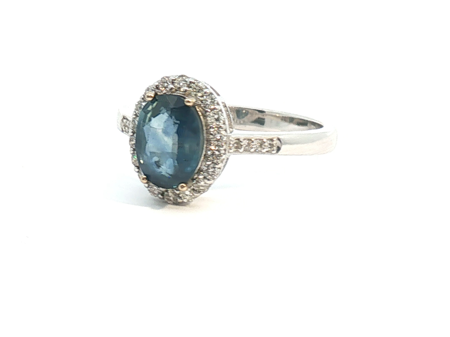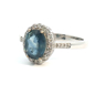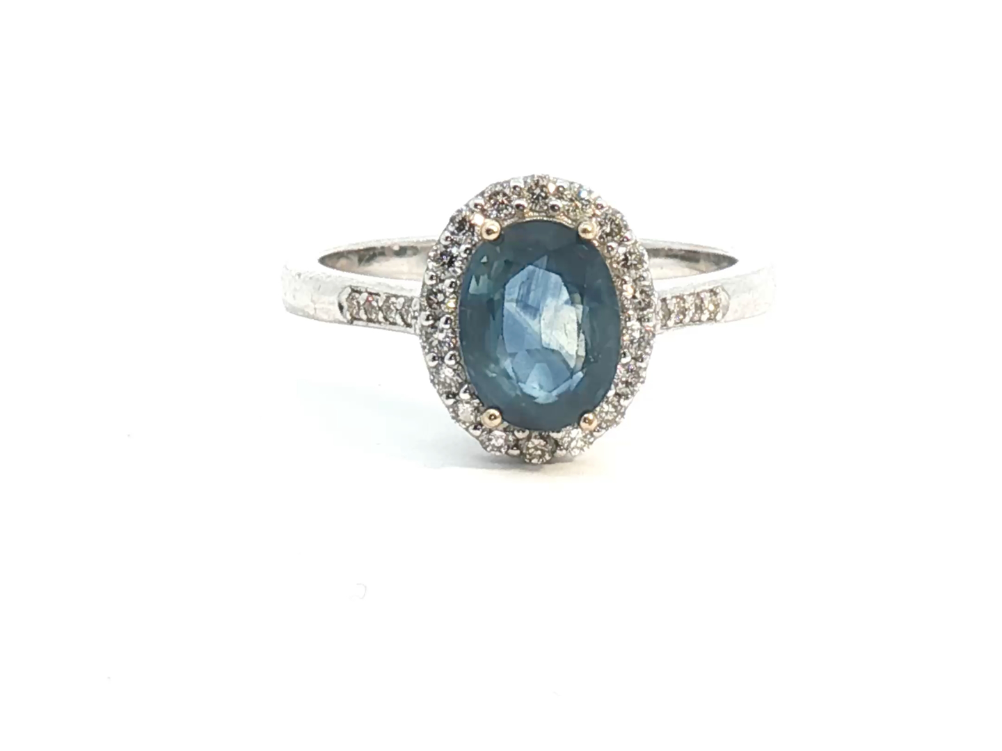Elegante ring bezet met 1 saffier van +-2.00ct, omringd door 26 briljanten: +-0.52ct, kleur: I-J en zuiverheid: VS-SI. Ingezet in wit goud 18kt (gemerkt 750). Ringmaat: 51-53 en gewicht: +-4 gram