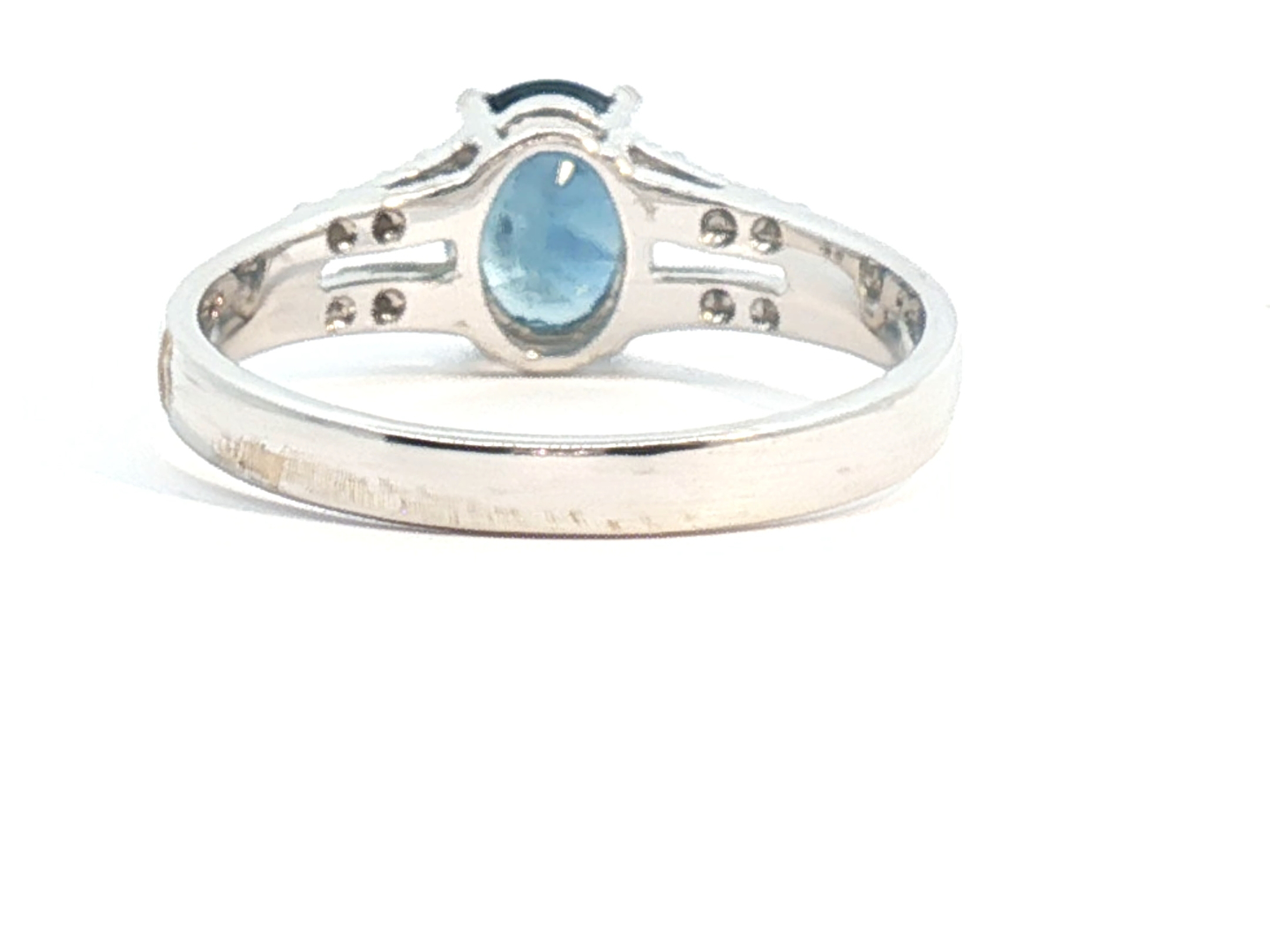 Fijne ring bezet met 1 saffier light blue transparant van +-0.75ct, omringd door 16 kleine briljanten: +-0.16ct, kleur: G-H en zuiverheid: VS. Ingezet in wit goud 18kt (gemerkt 750). Ringmaat: 49-51 en gewicht: +-3,1 gram