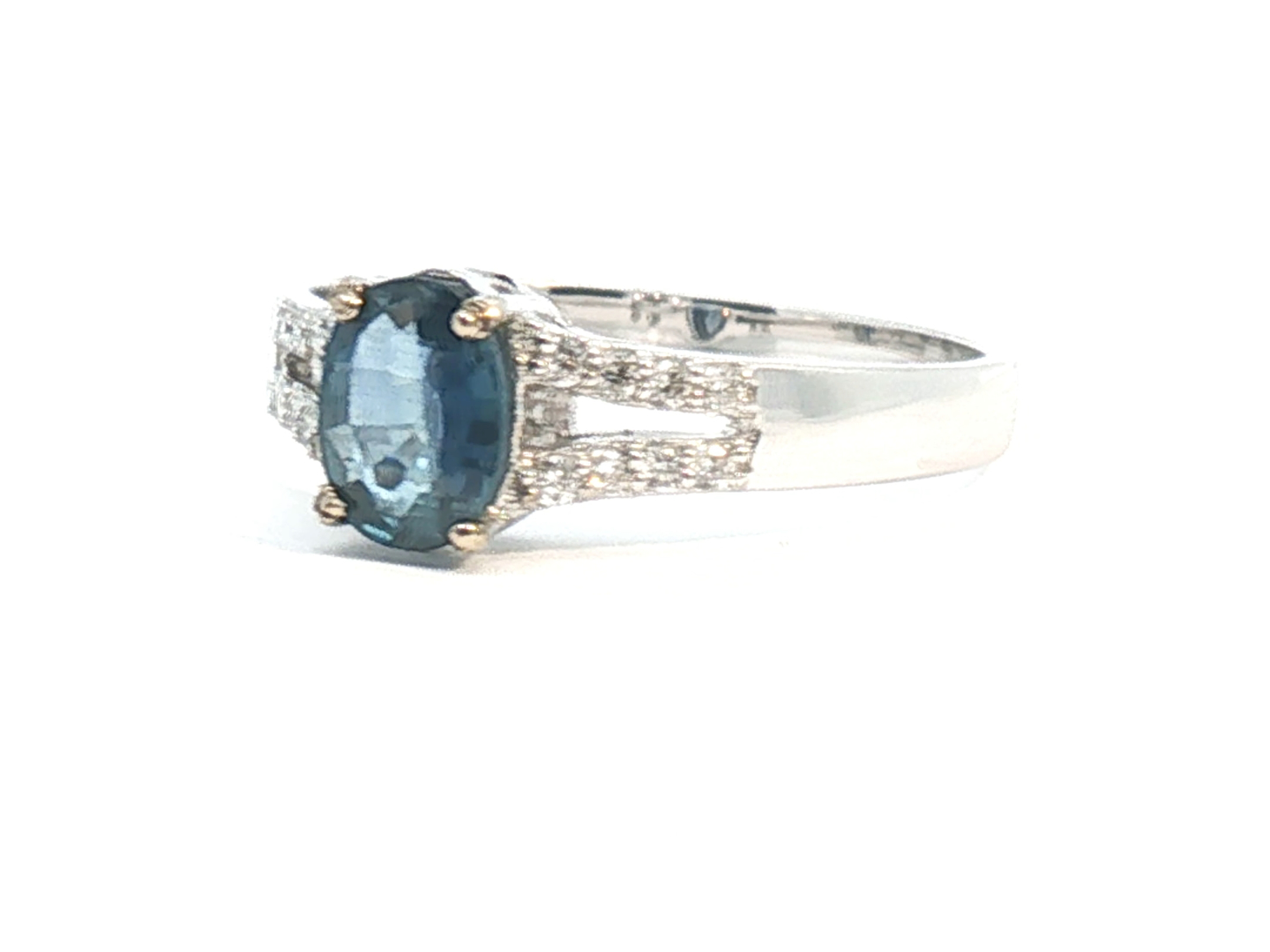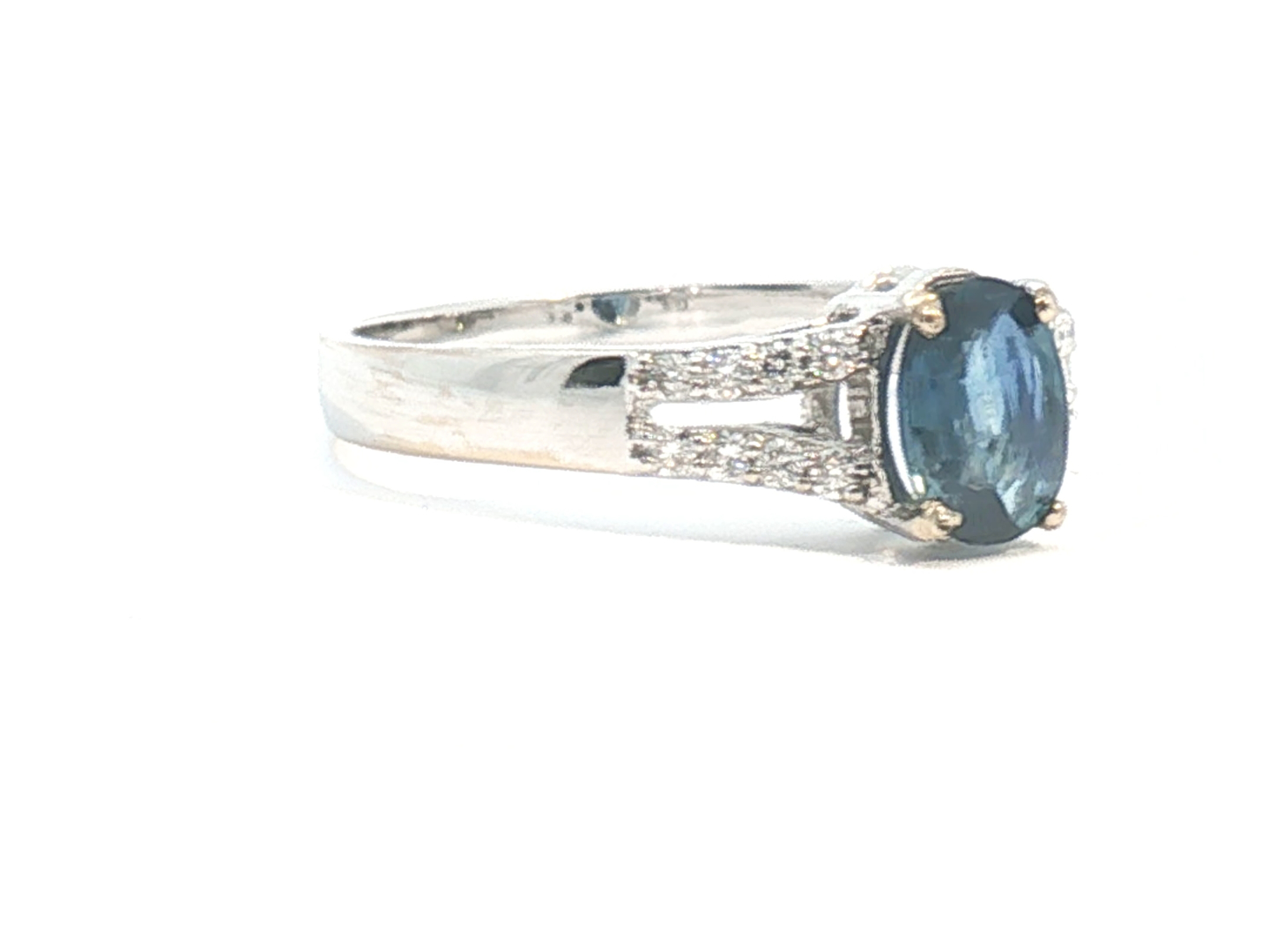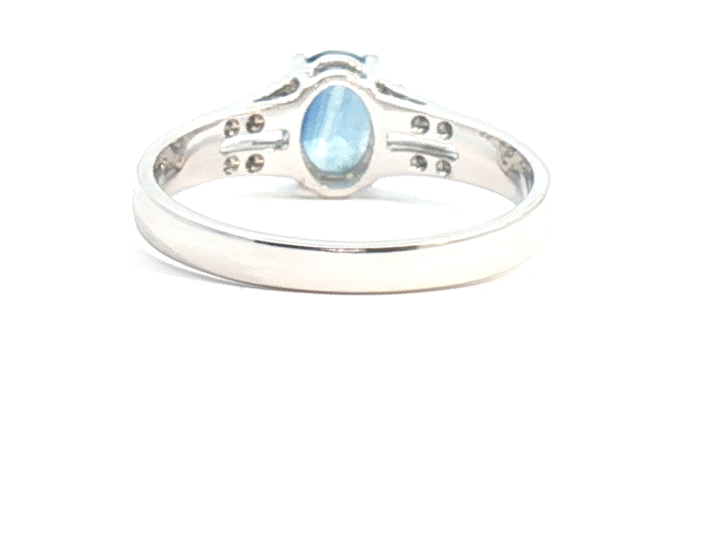 Fijne ring bezet met 1 saffier van +-0.80ct, light blue transparant, omringd door 16 kleine briljanten: +-0.16ct, kleur: I en zuiverheid: VS. Ingezet in wit goud 18kt (gemerkt 750). Ringmaat: 51-53 en gewicht: +-3,3 gram