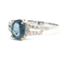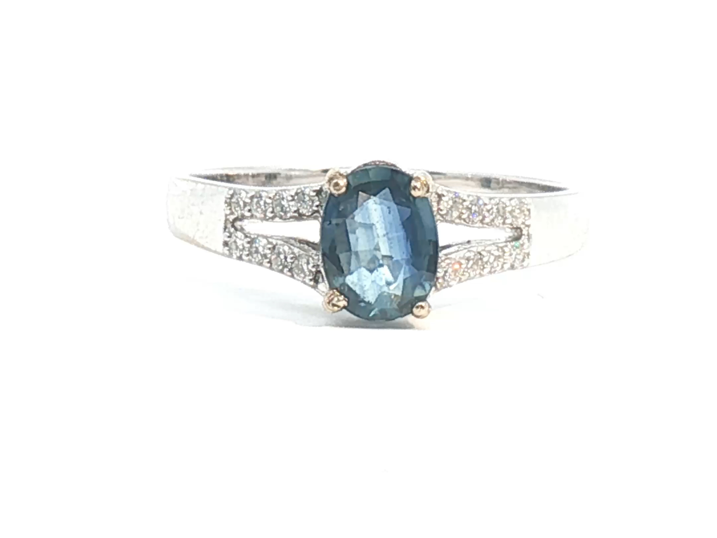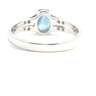 Fijne ring bezet met 1 saffier van +-0.80ct, light blue transparant, omringd door 16 kleine briljanten