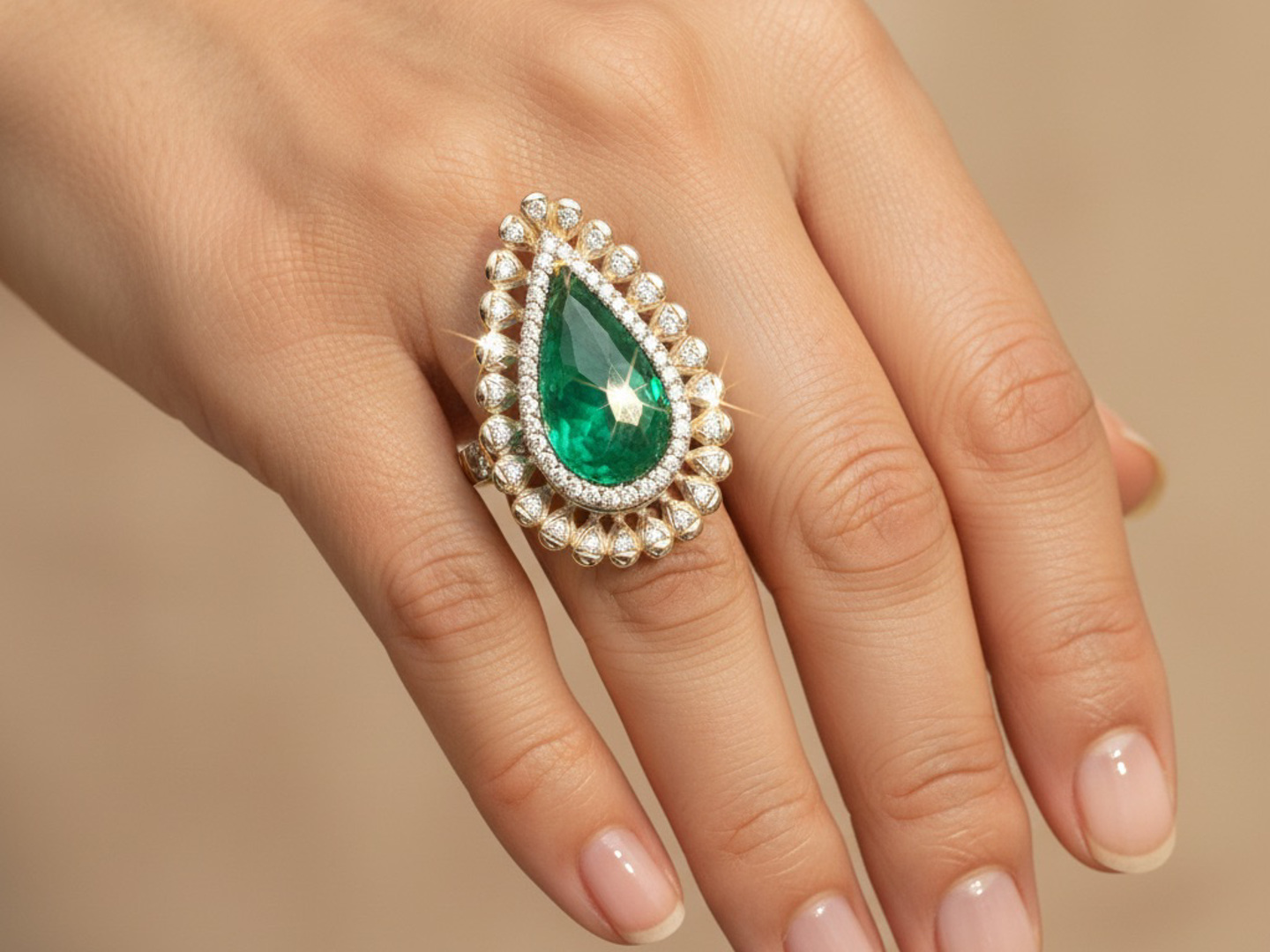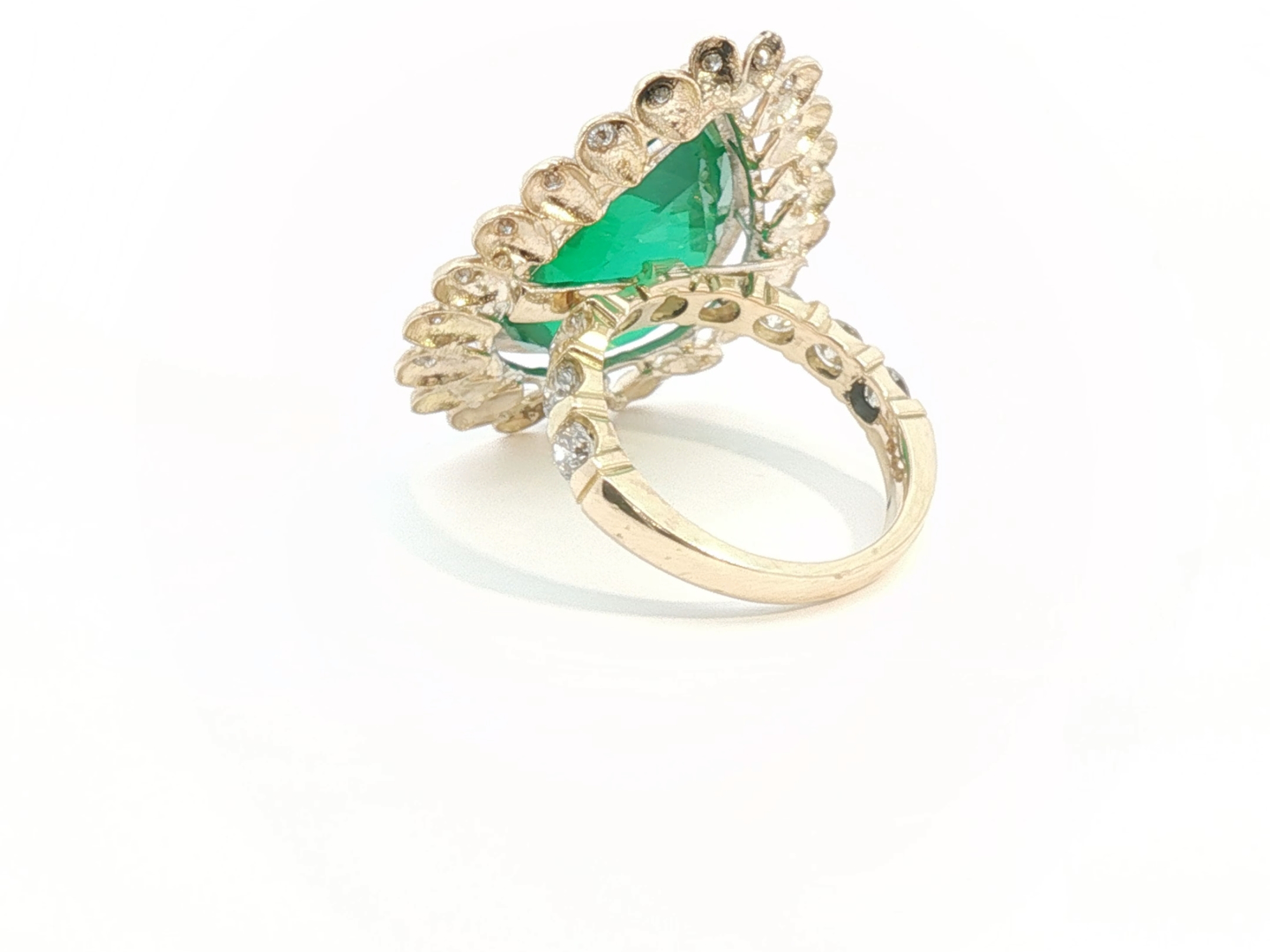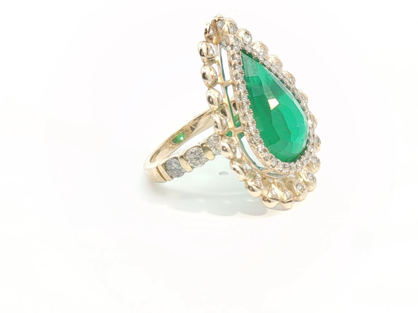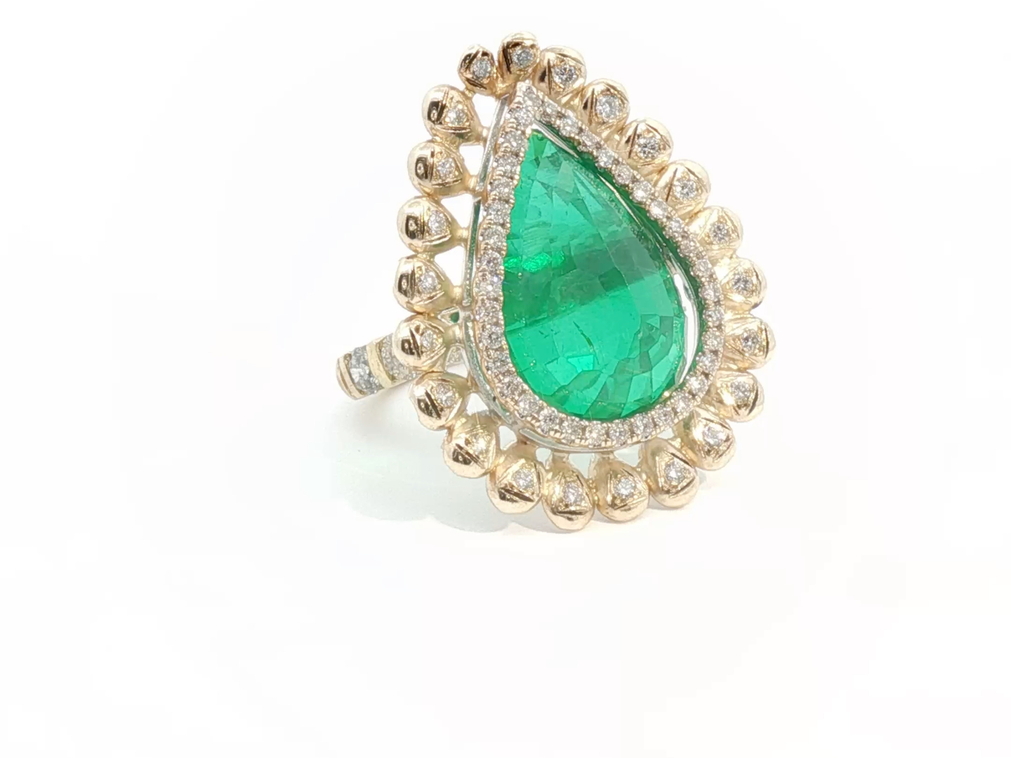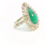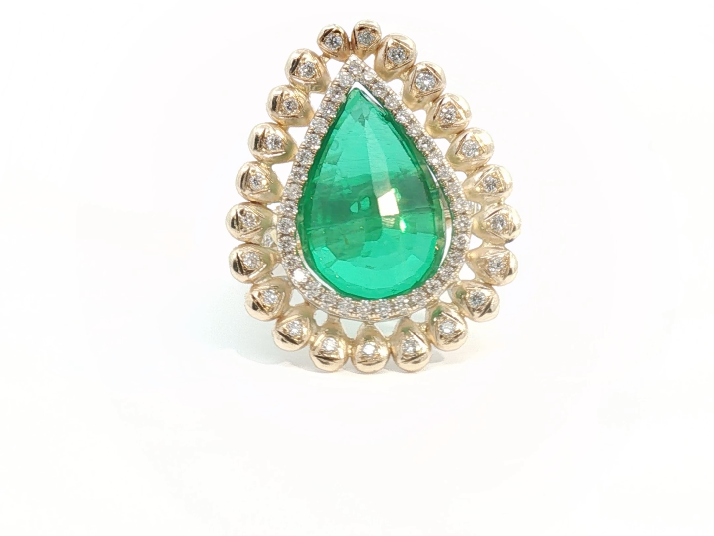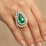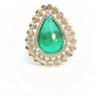 Sublieme grote ring bezet met 1 kwaliteitssmaragd van +-9.00ct, vivid green transparant, omringd door 64 diamanten - dubbel entourage, briljant geslepen: +-1.30ct, kleur: G-H-I en zuiverheid: VS. Ingezet in geel goud 18kt. Ringmaat: 51 en afmetingen ring: +-30mm op 23mm