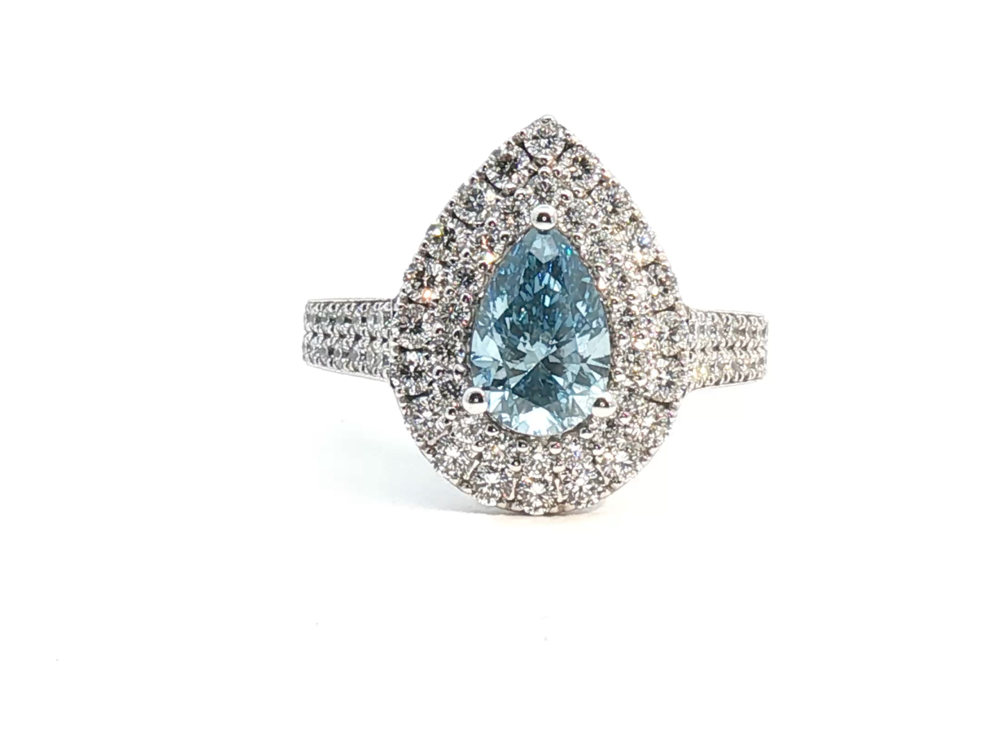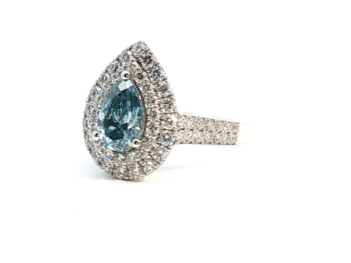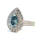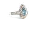 Exclusieve ring bezet met 1 light blue diamant peer geslepen omringd door 66 witte diamanten briljant geslepen