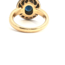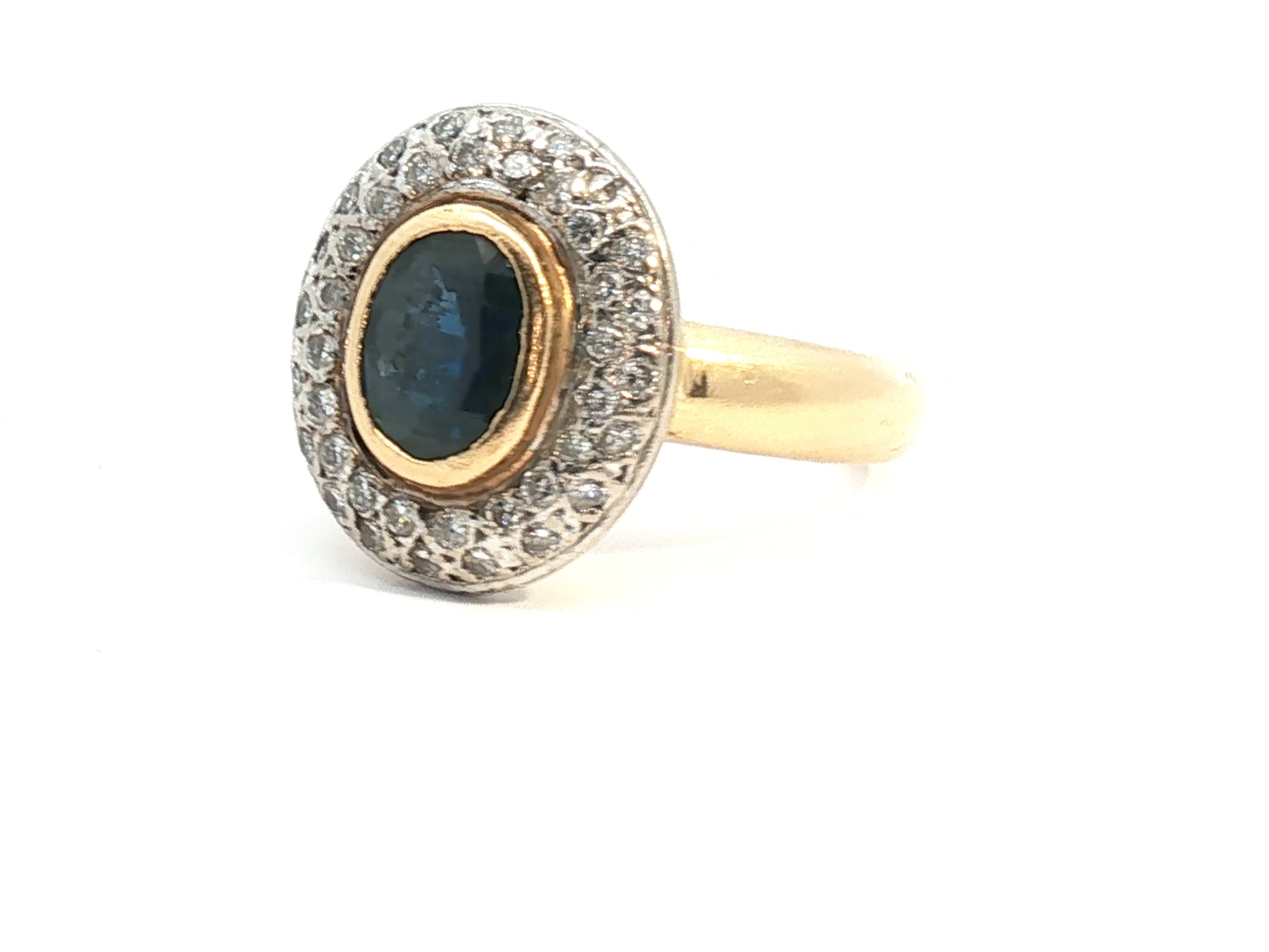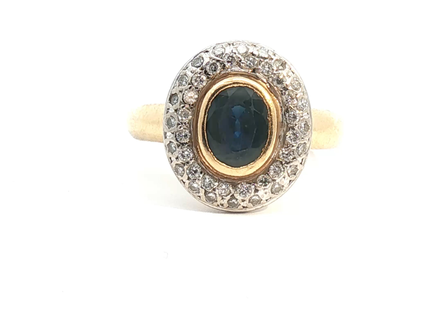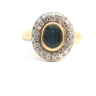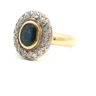 Ring bezet met 1 ovale saffier van 1.60ct. omringd door 40 witte diamanten oude slijp +- 1.00ct. ingezet in geel en wit goud 18kt. gewicht: 8,82 gram ring +- 16 mm. op 14 mm.