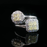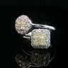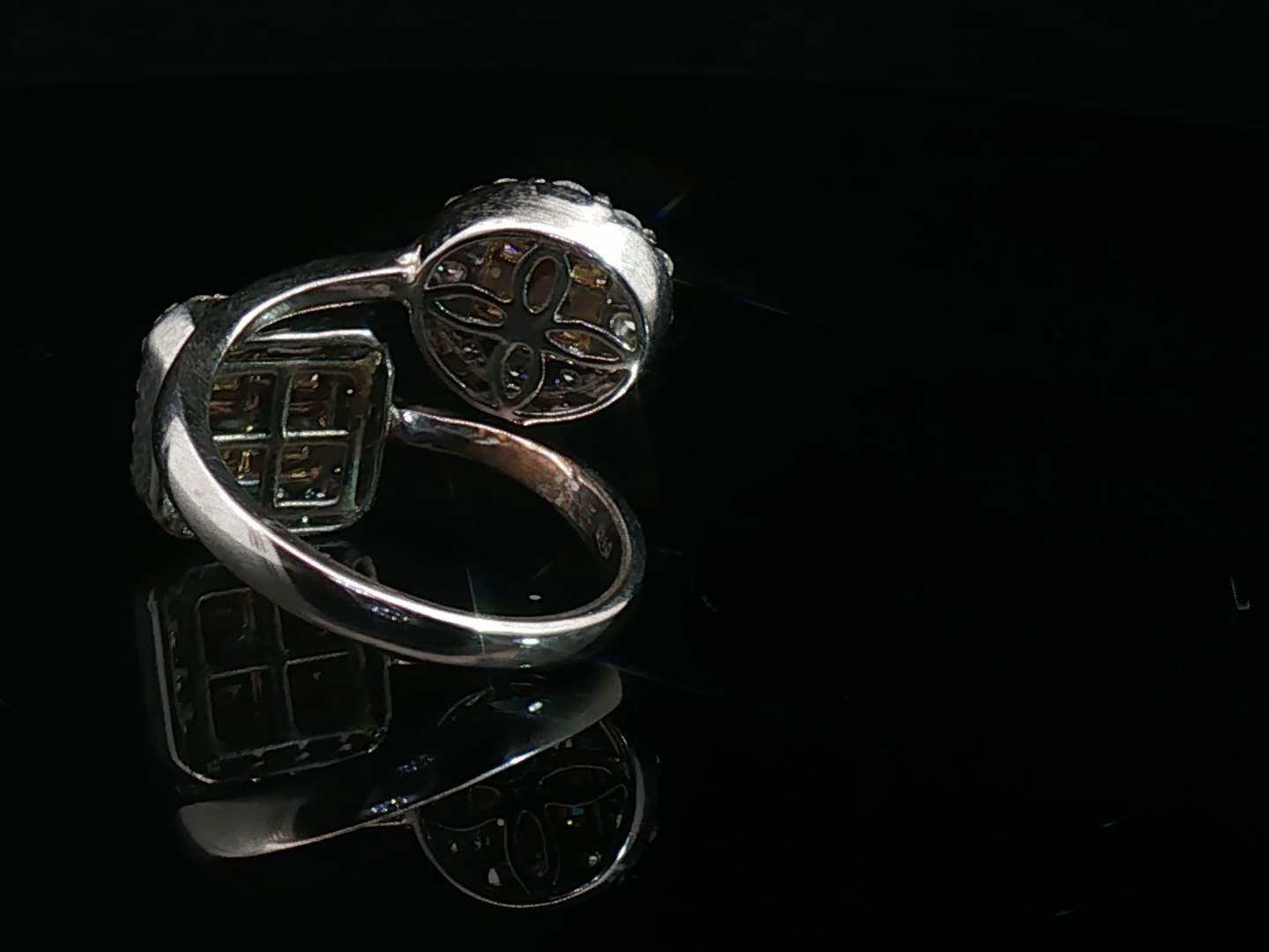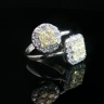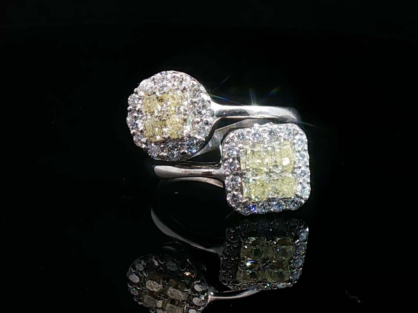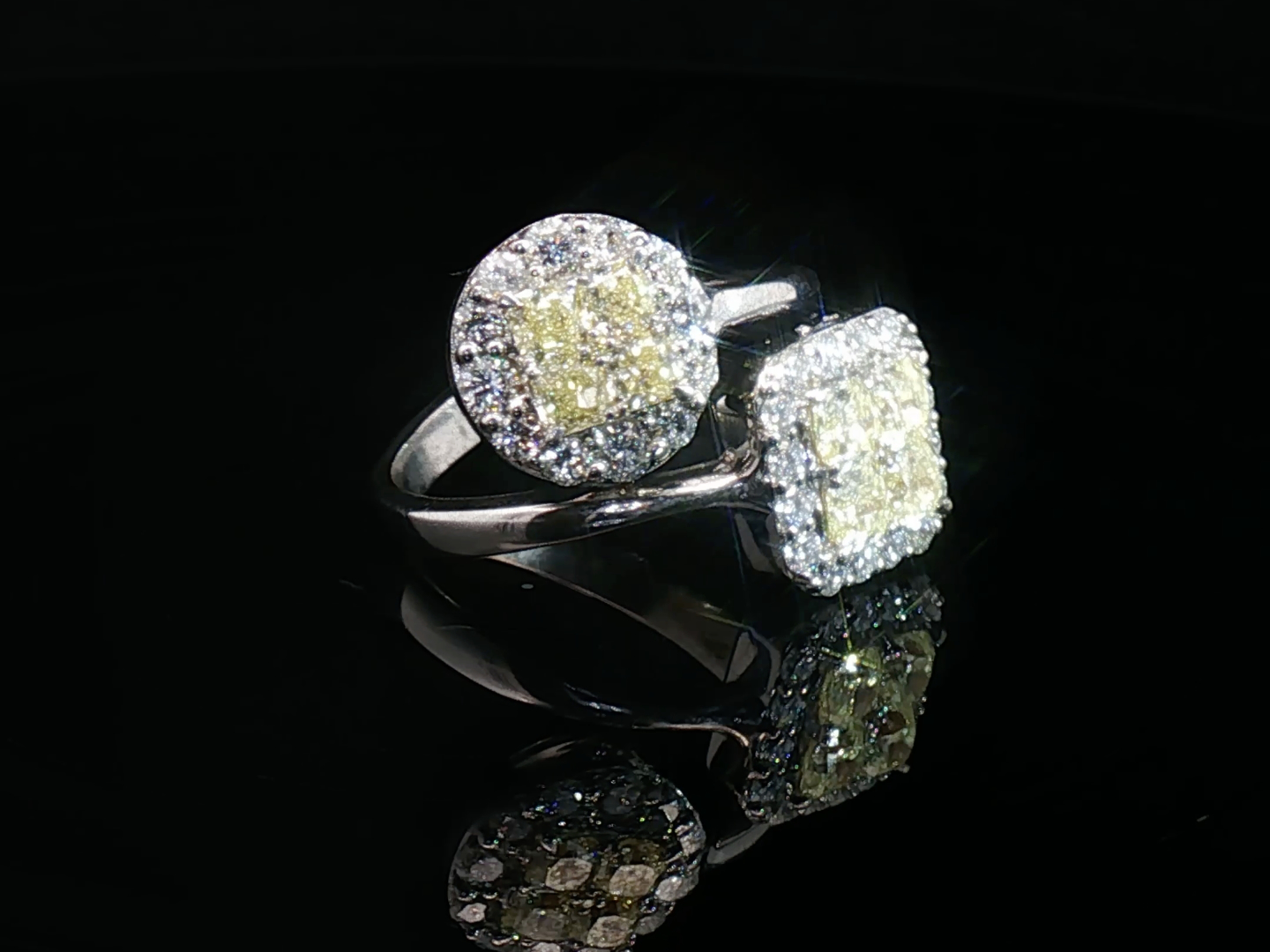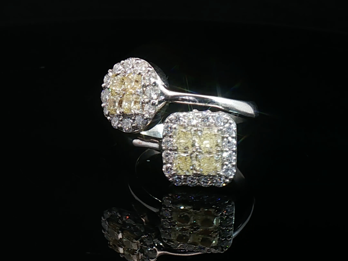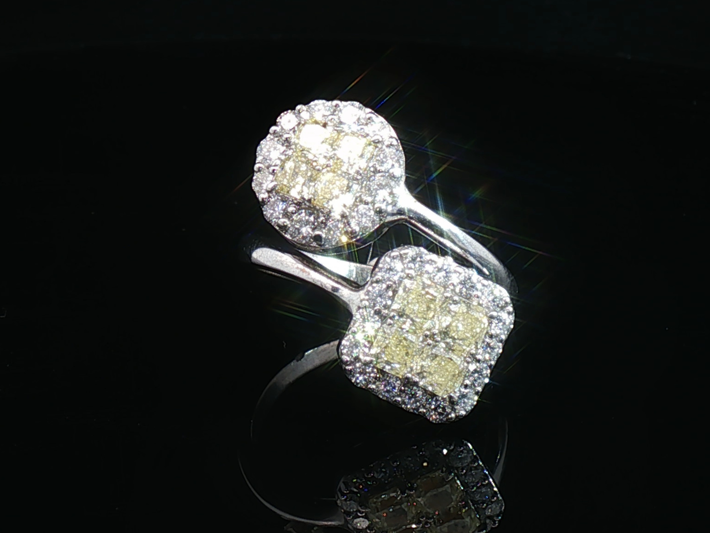 Grote ring (toi et moi) bezet met 8 fancy light yellow diamanten omringd door 28 witte diamanten briljant geslepen