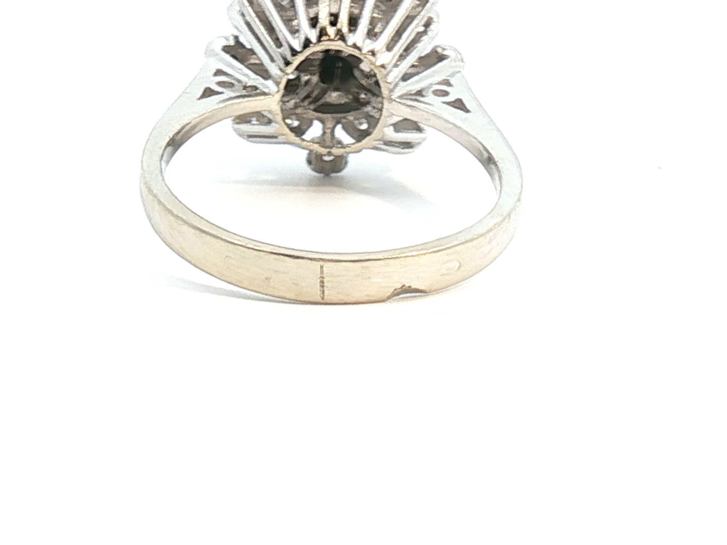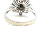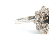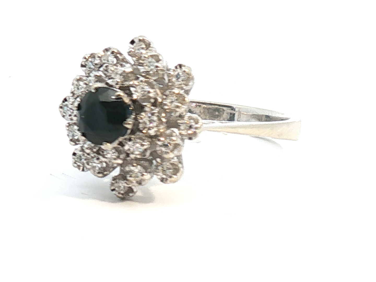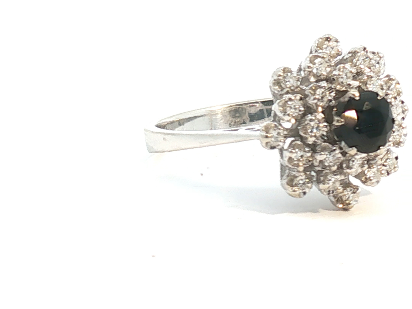 Ring met 1 saffier van +- 0.50ct. omringd door 24 briljanten kleur: I en zuiverheid: VS ingezet in wit goud 18kt. ringmaat: 54-56 ring diameter 14 mm.