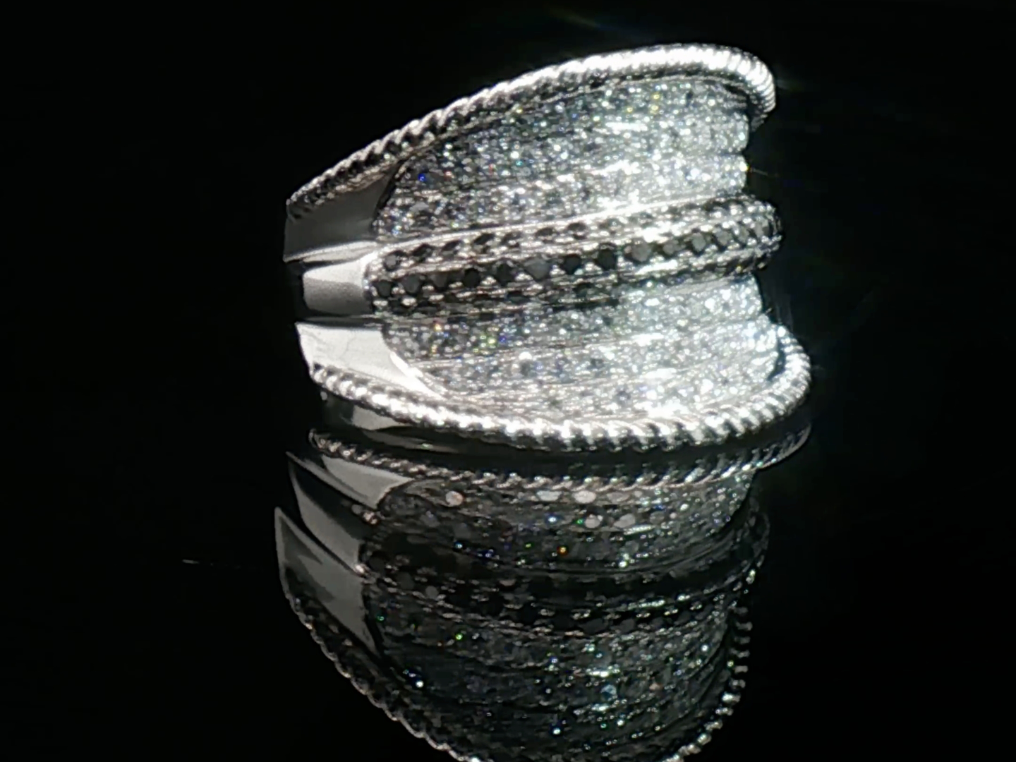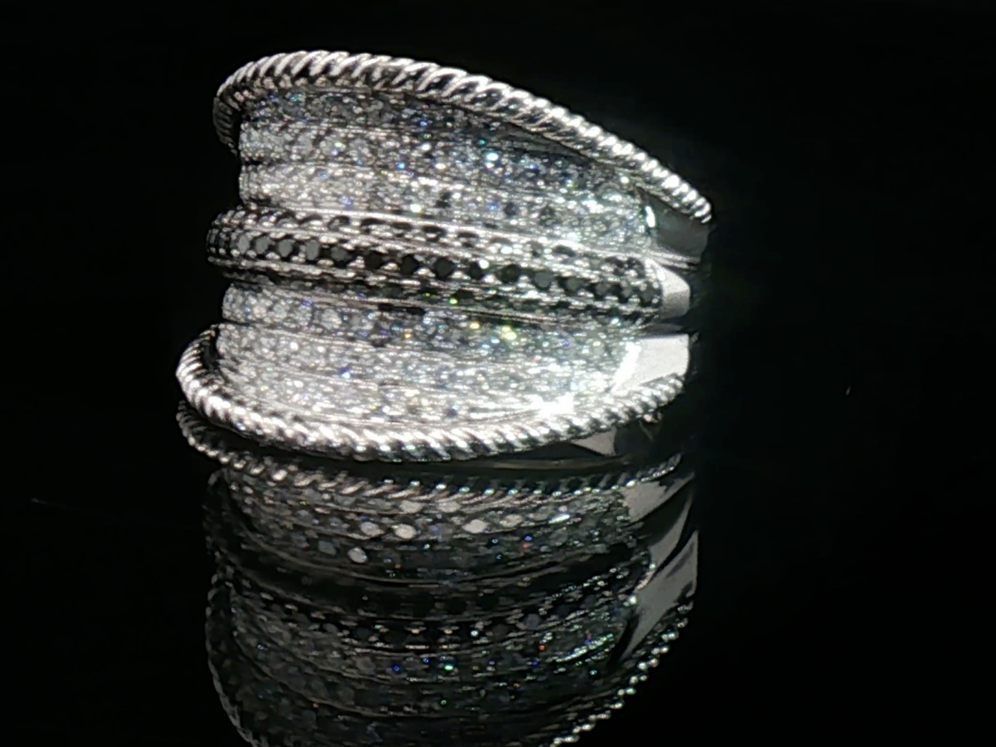 Modieuze ring bezet met 80 witte diamanten briljant geslepen en 58 zwarte diamanten
