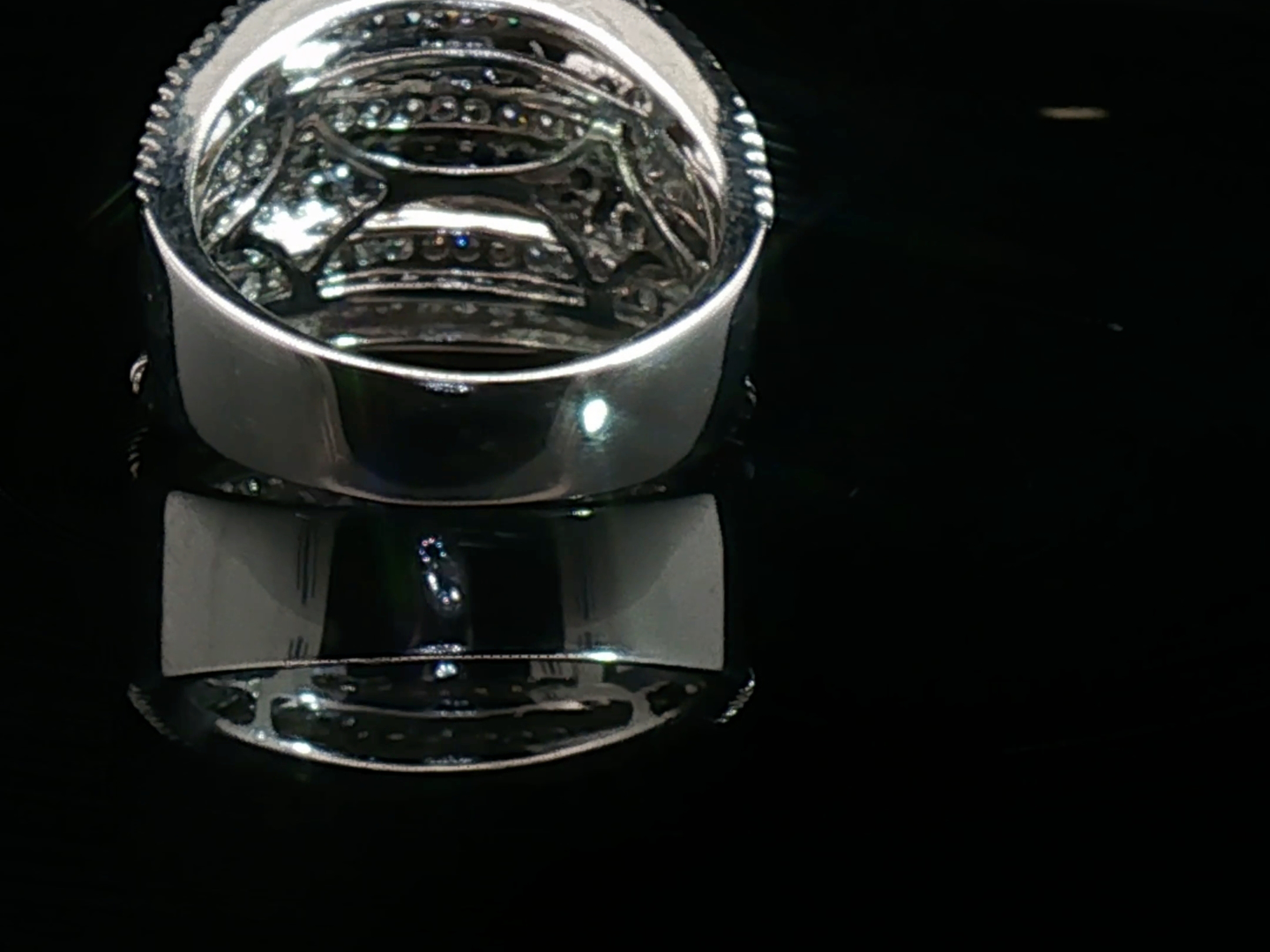 Modieuze ring bezet met 80 witte diamanten briljant geslepen +- 0.80ct. kleur: F-G en zuiverheid: VS en 58 zwarte diamanten +- 0.50ct. ingezet in wit goud 18kt. (gemerkt 750) gewicht: 8,35 gram ring breedte: 15 m. ringmaat: 53-55