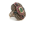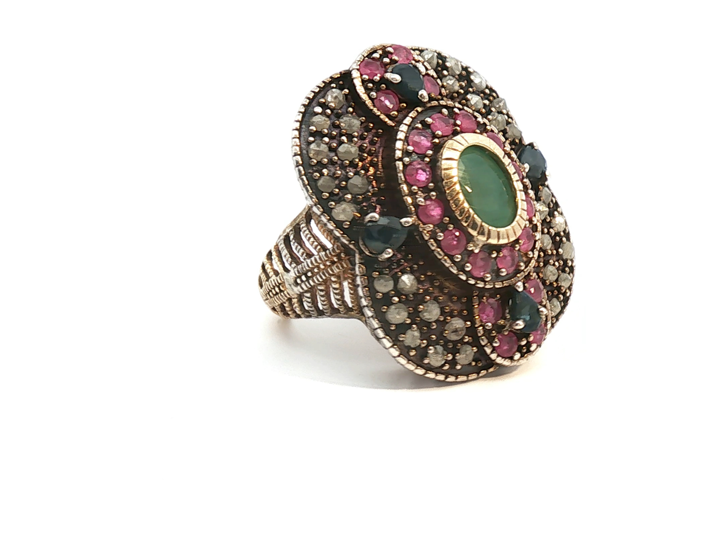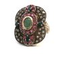 Antieke Napoleon III ring circa 1880 bezet met 1 smaragd + 20 robijnen + 4 saffieren + 32 diamanten oud slijp