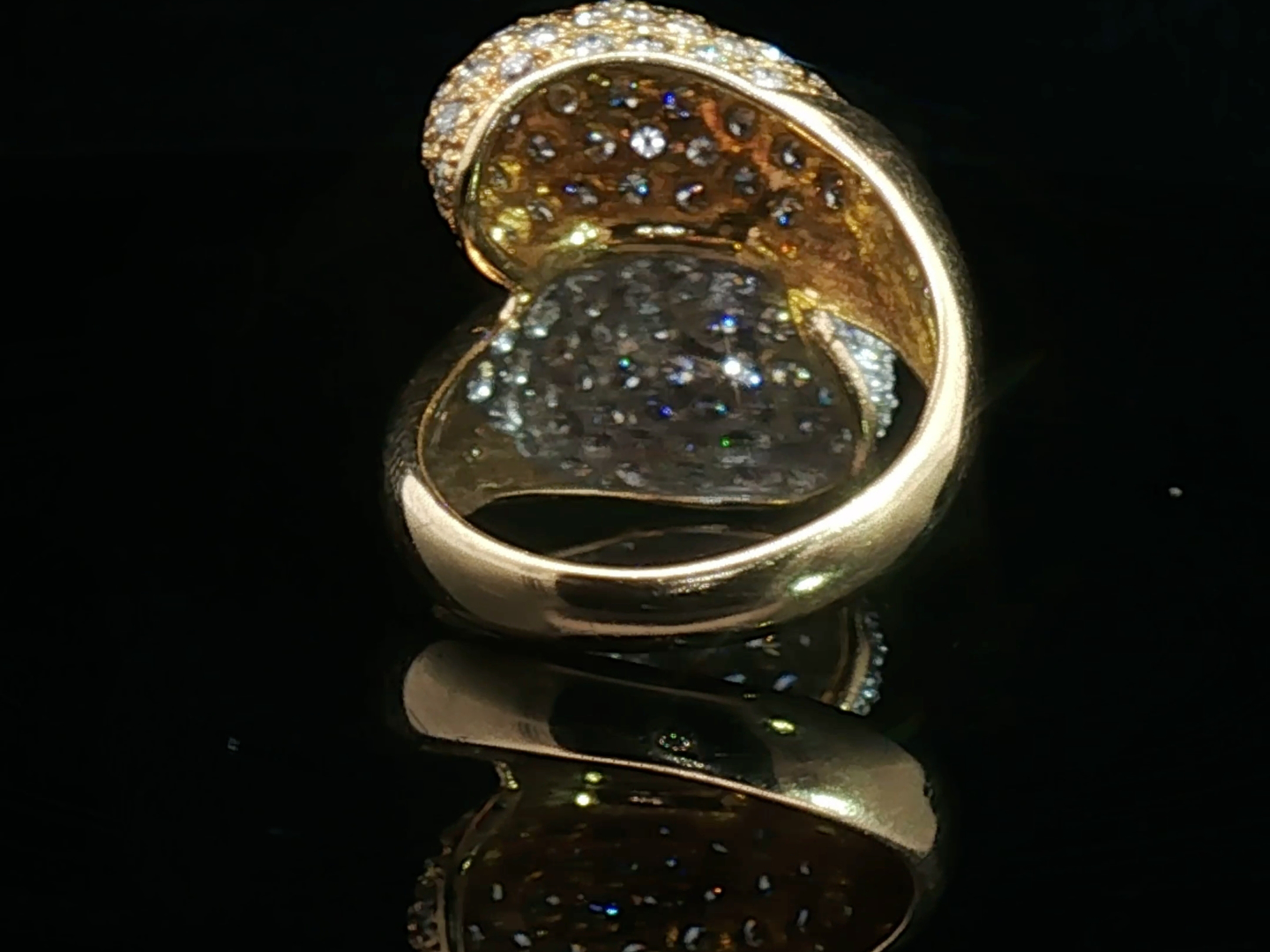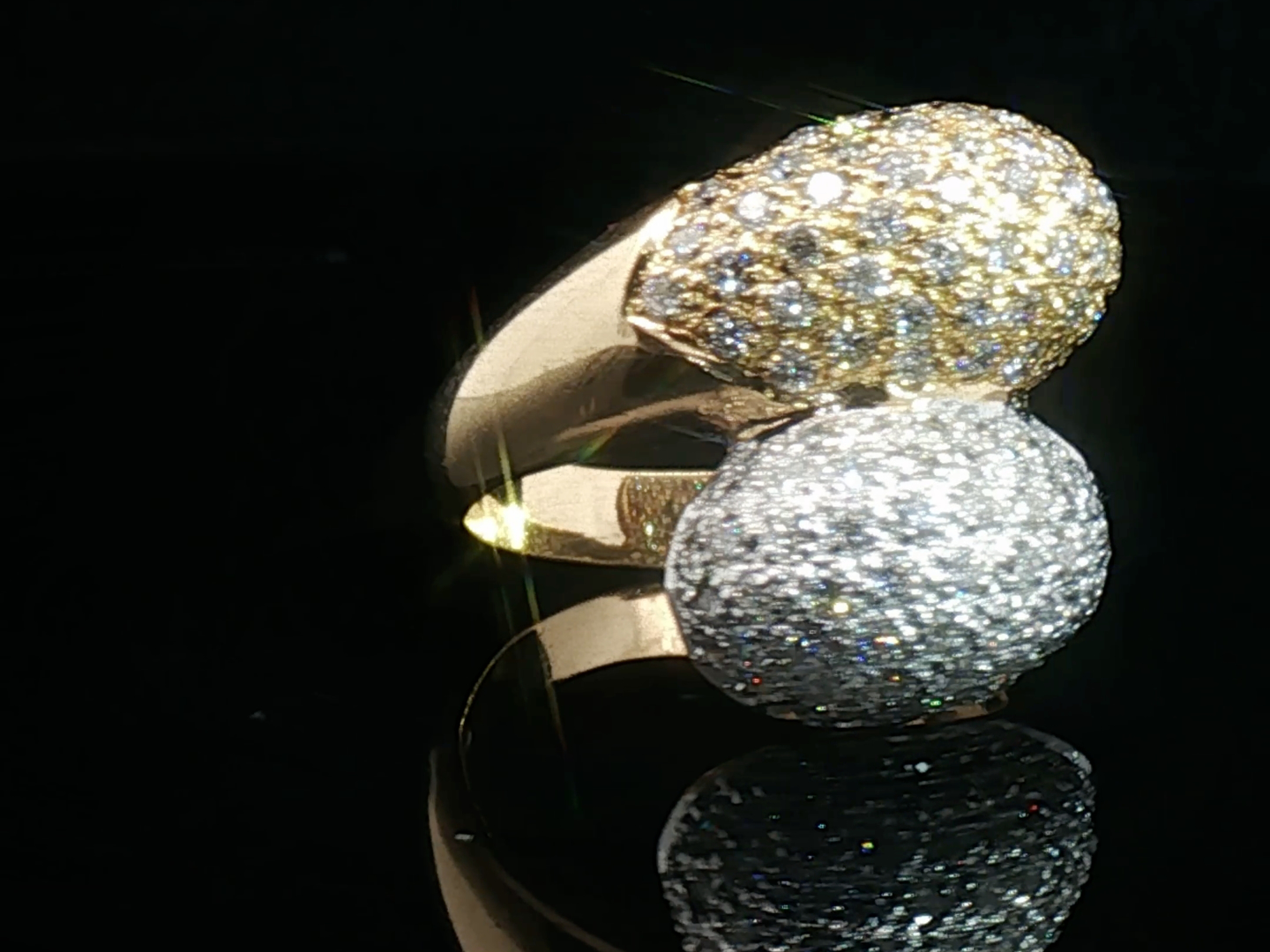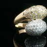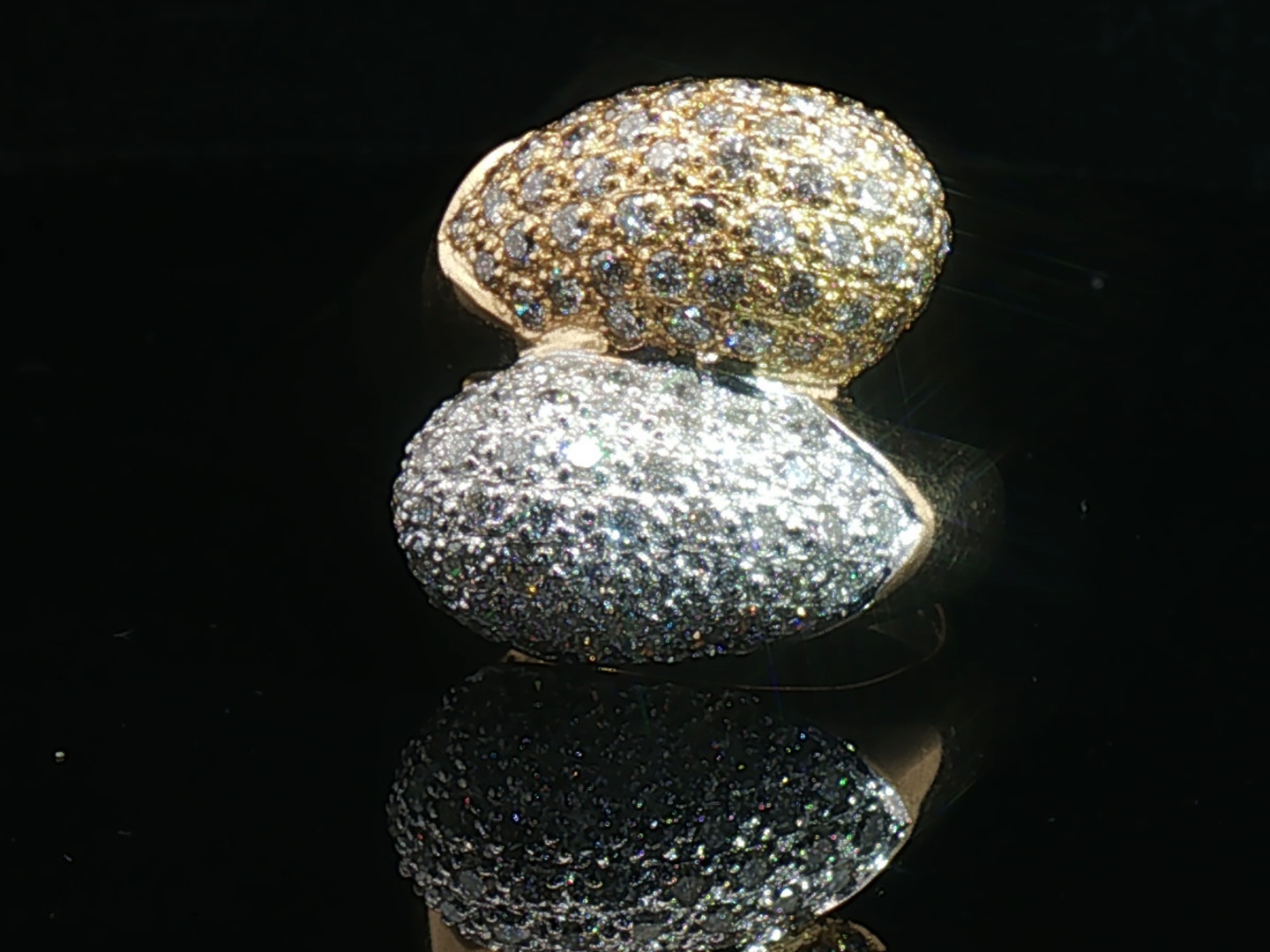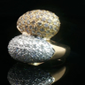 Ring (toi et moi) in geel en wit goud 18kt. (gemerkt 750) bezet met +- 50 witte diamanten briljant geslepen en +- 50 fancy color diamanten in totaal: +-1.00ct zuiverheid: VS ringmaat: 55-57 ring +- 20 mm. x +- 17 mm. gewicht: 9,21 gram