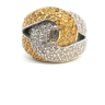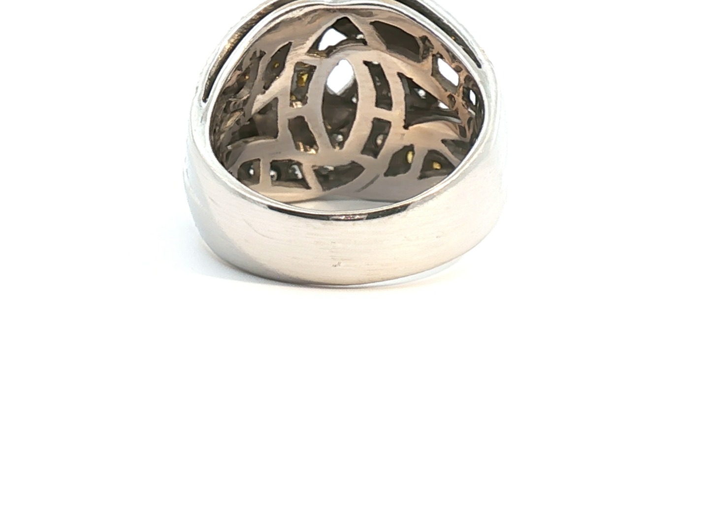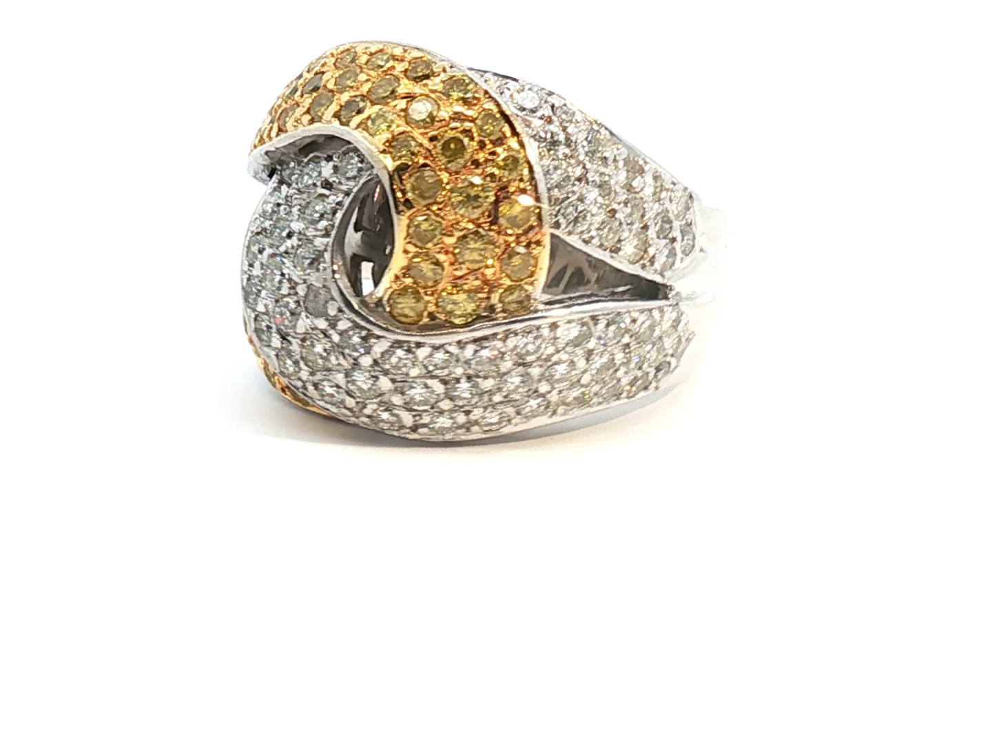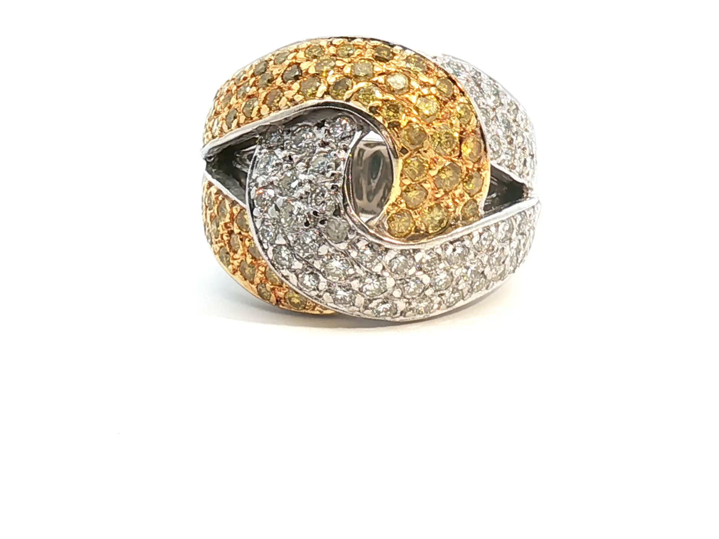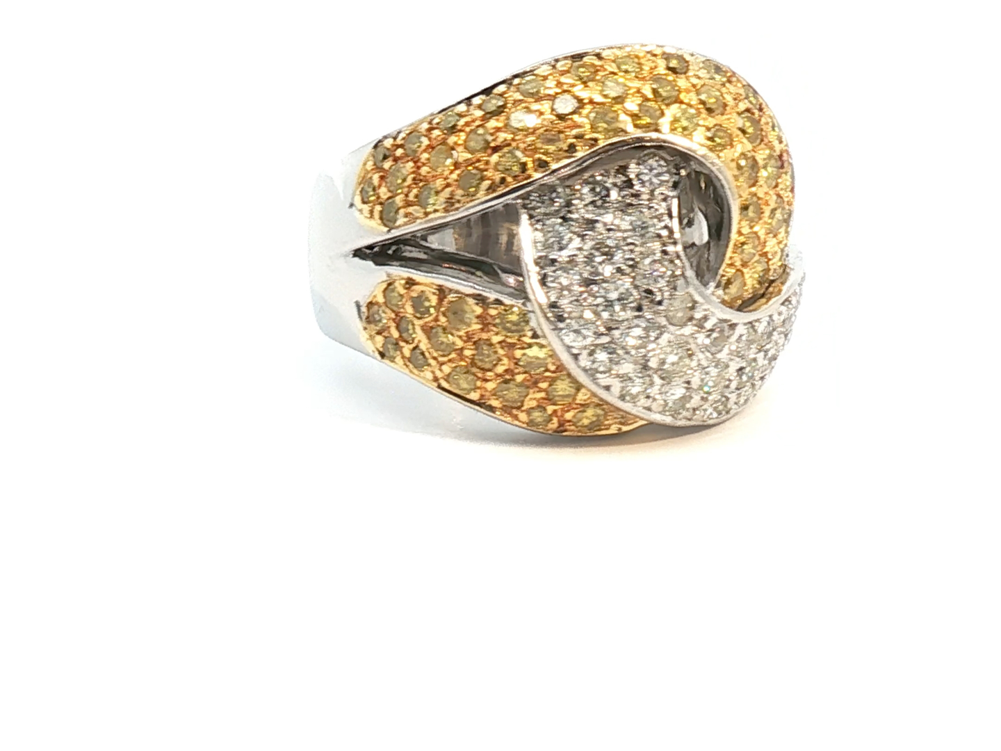 Kwaliteitsring bezet met 60 witte diamanten briljant geslepen en 60 fancy yellow diamanten briljant geslepen in totaal: +- 2.20ct. zuiverheid: VS ingezet in geel en wit goud 18kt. ring +- 20 mm. op 20 mm. ringmaat: 57-59 gewicht: 16,10 gram