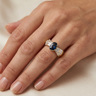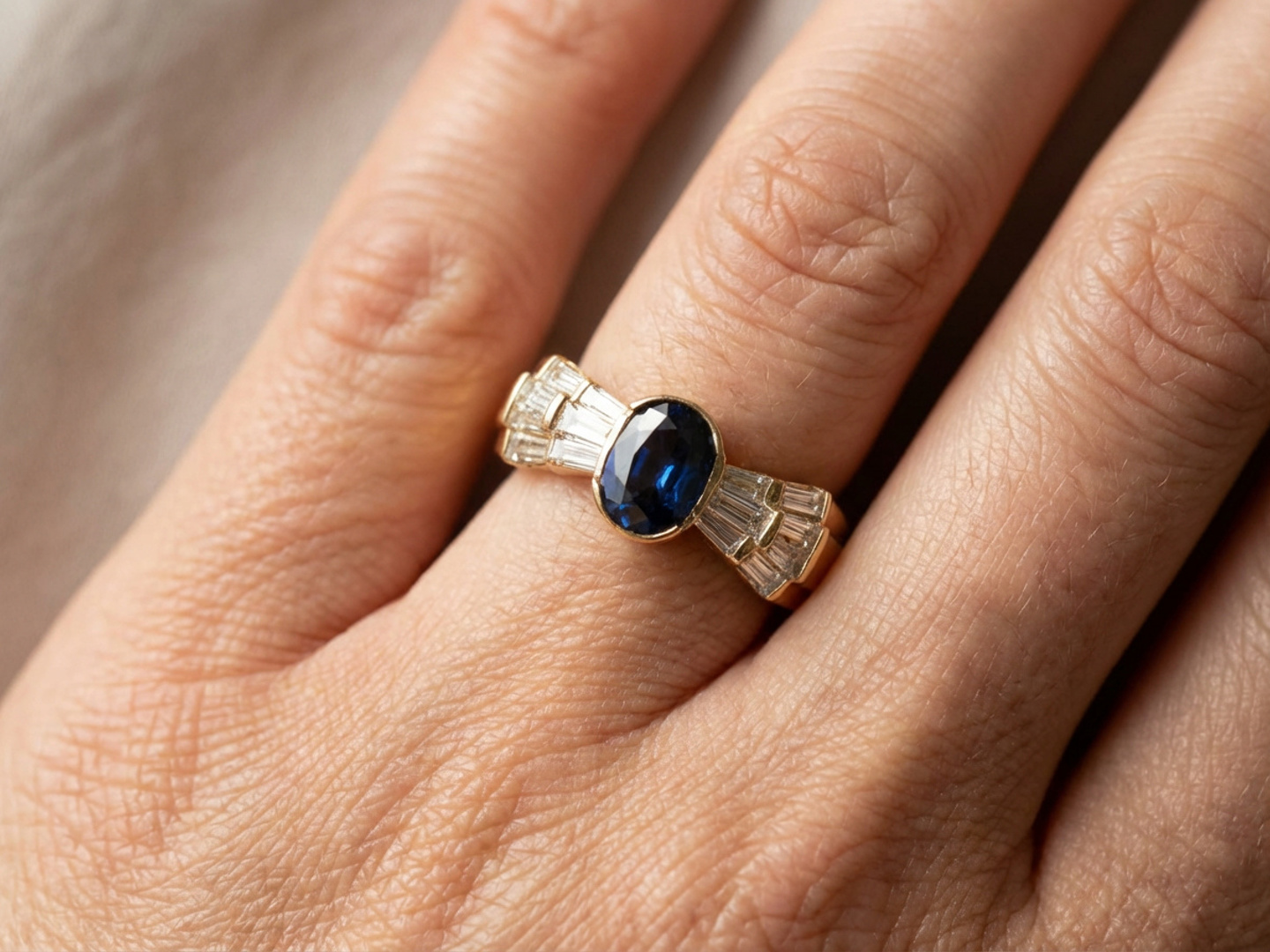 Elegante ring bezet met 1 Ceylon saffier van +- 1.00ct. omringd door 14 diamanten baguette geslepen +- 1.00ct.