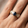 Elegante ring bezet met 1 Ceylon saffier van +- 1.00ct. omringd door 14 diamanten baguette geslepen +- 1.00ct. kleur: F-G en zuiverheid: VS ingezet in geel goud 18kt. (gemerkt 750) ringmaat 53-56 gewicht: 7,50 gram