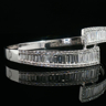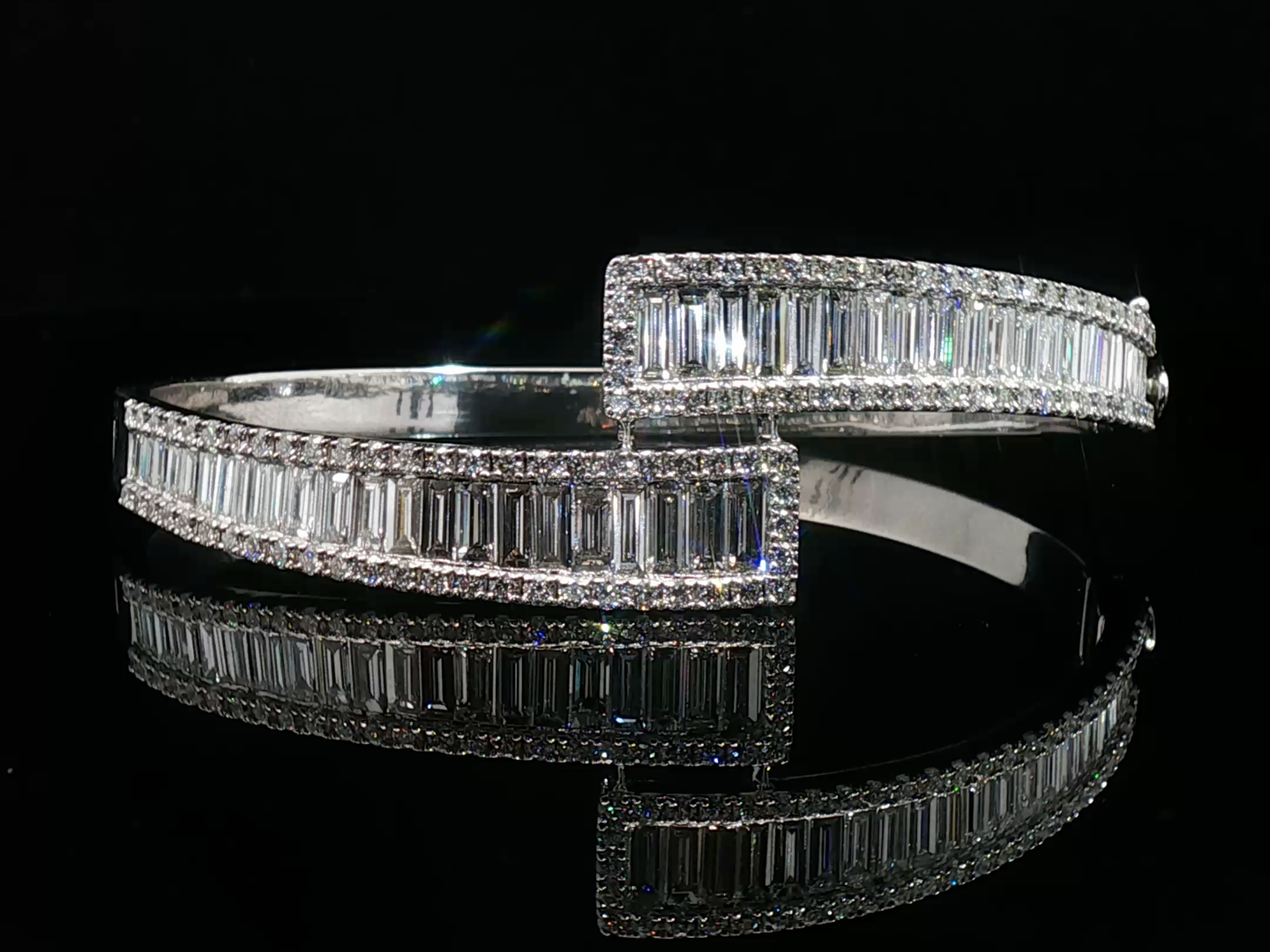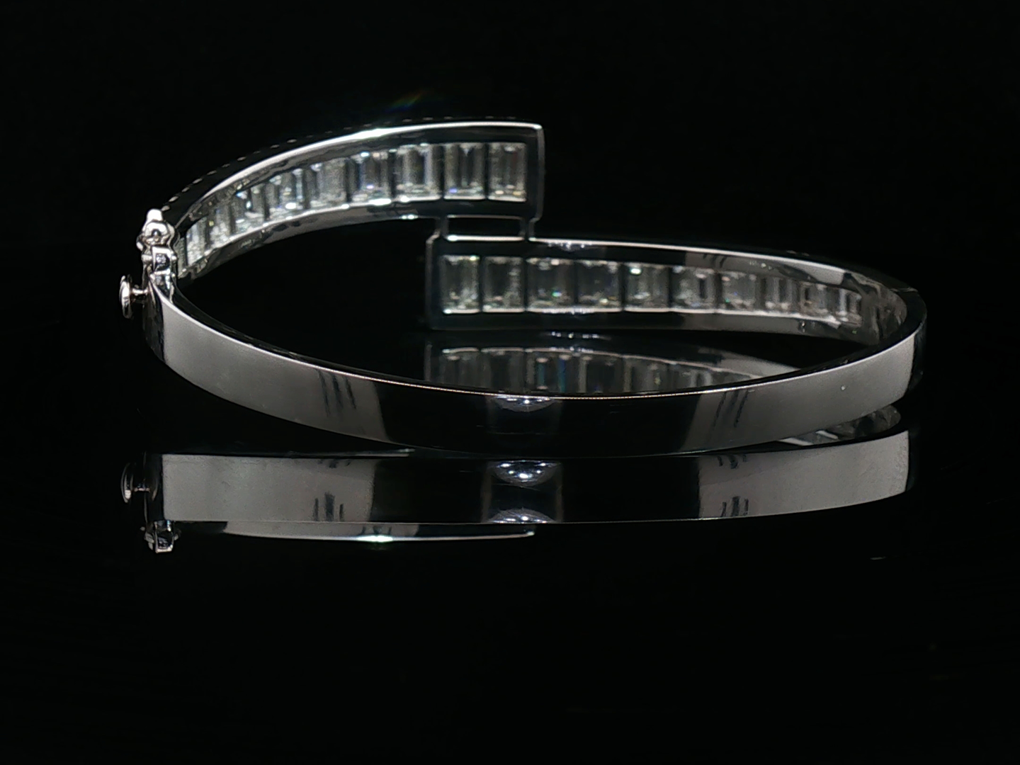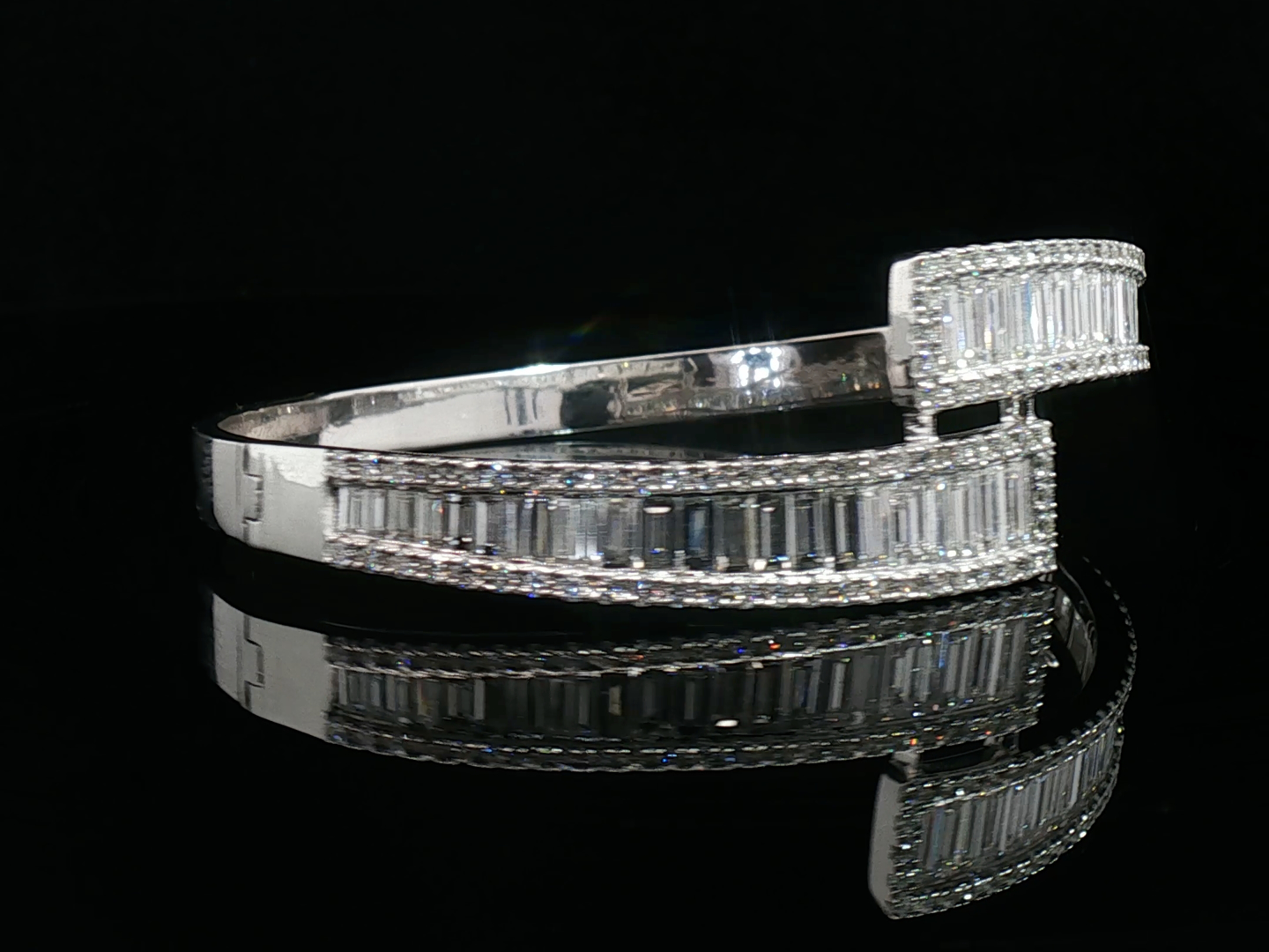 Modieuze armband bezet met 149 witte diamanten, baguette en briljant geslepen, totaal: +-7.20ct, kleur: F-G-H en zuiverheid: VS-SI. Ingezet in wit goud 14kt. gewicht: 19,03 gram en binnenmaat: +-57mm op 48mm