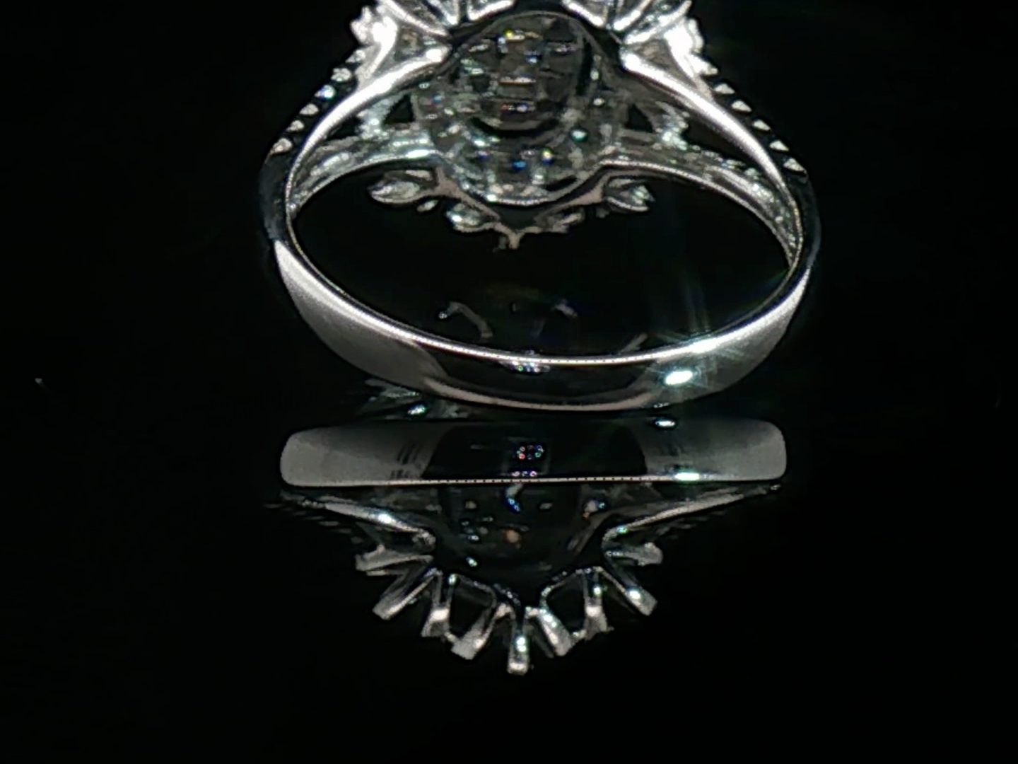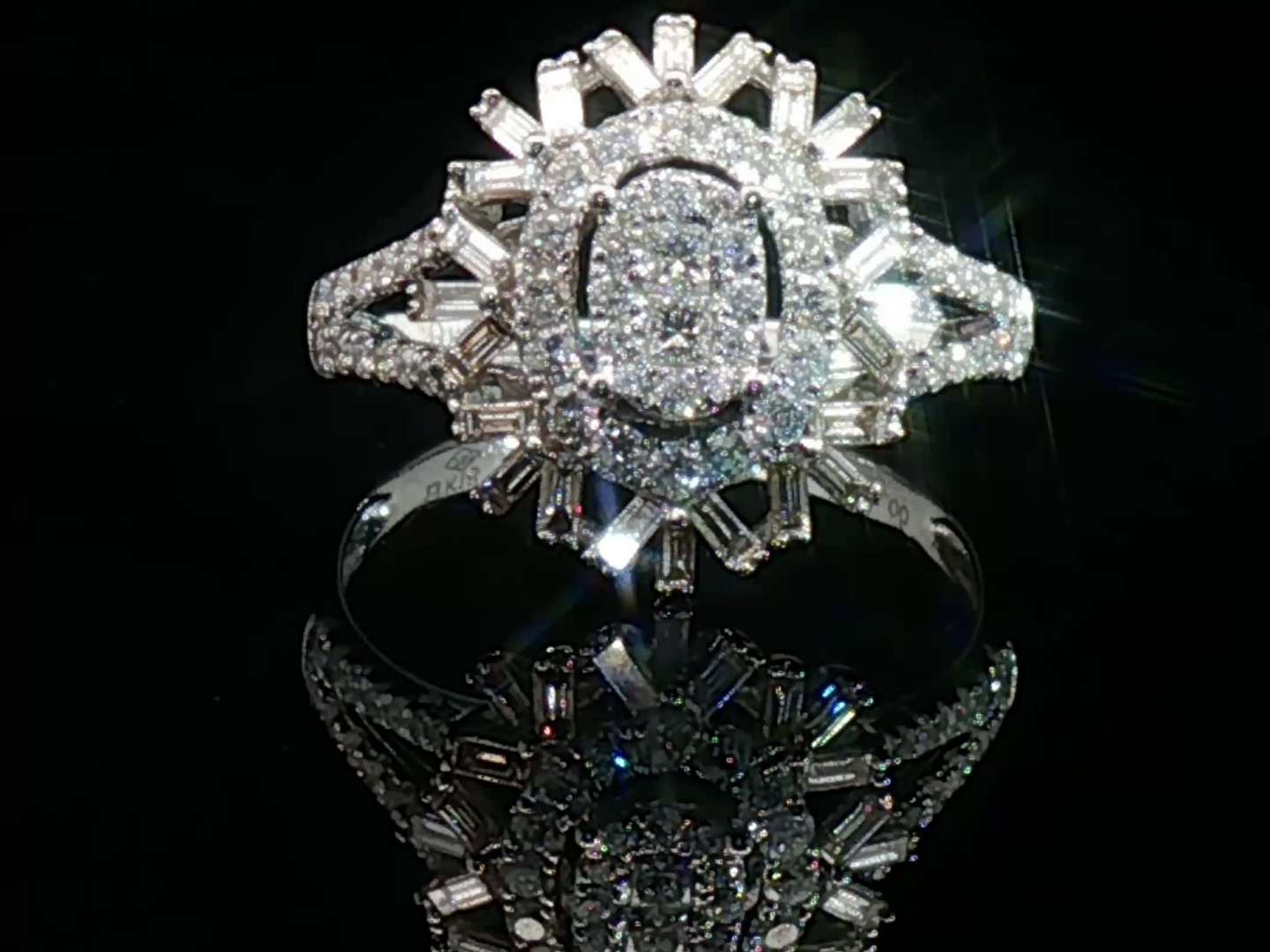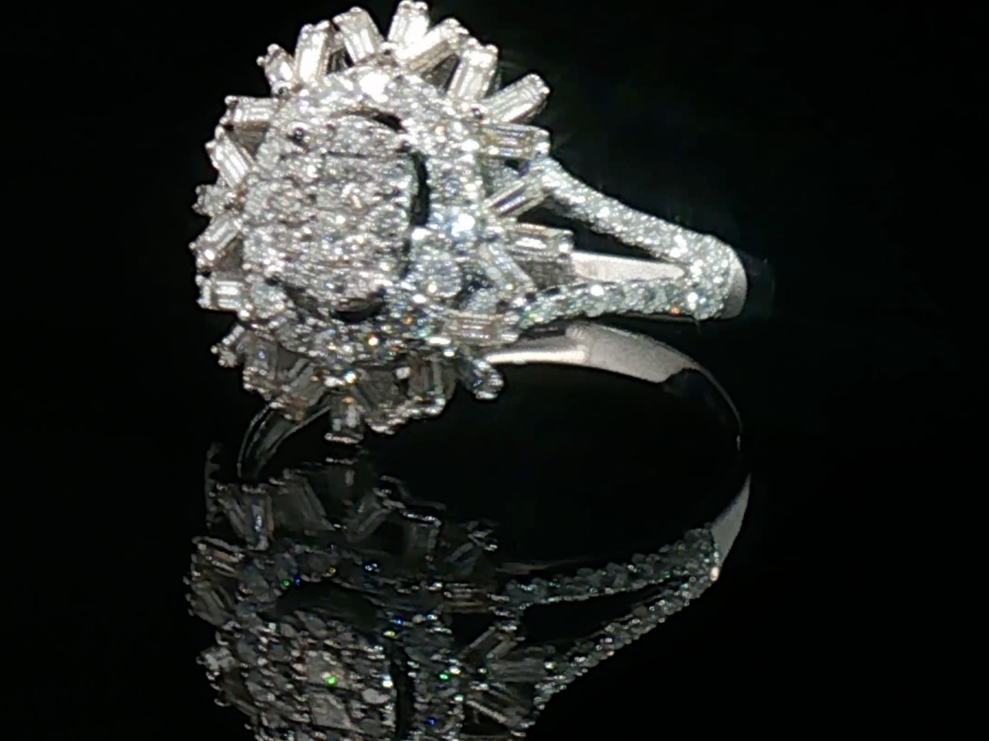 Fijne ring bezet met witte diamanten: 64 briljanten + 24 baguette geslepen + 2 prinses geslepen, totaal: 1.00ct. Kleur: G-H en zuiverheid: VS-SI. Ingezet in wit goud 18kt (gemerkt 750). Ringmaat: 53-56. Afmetingen ring: +-15mm op 12mm