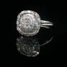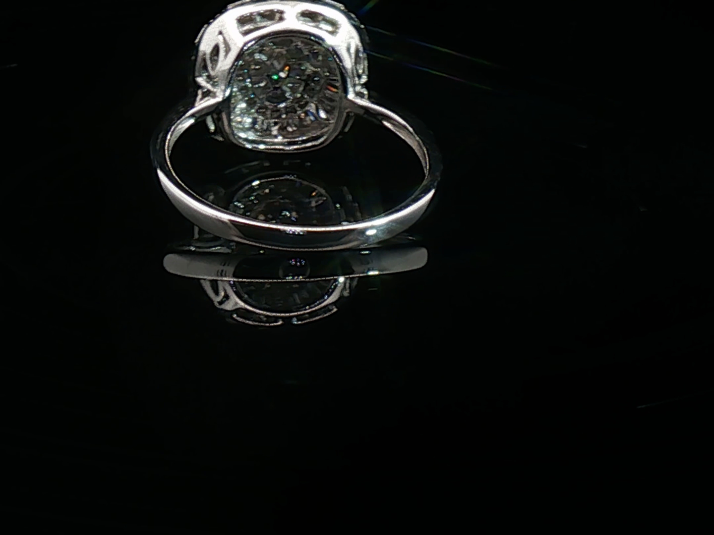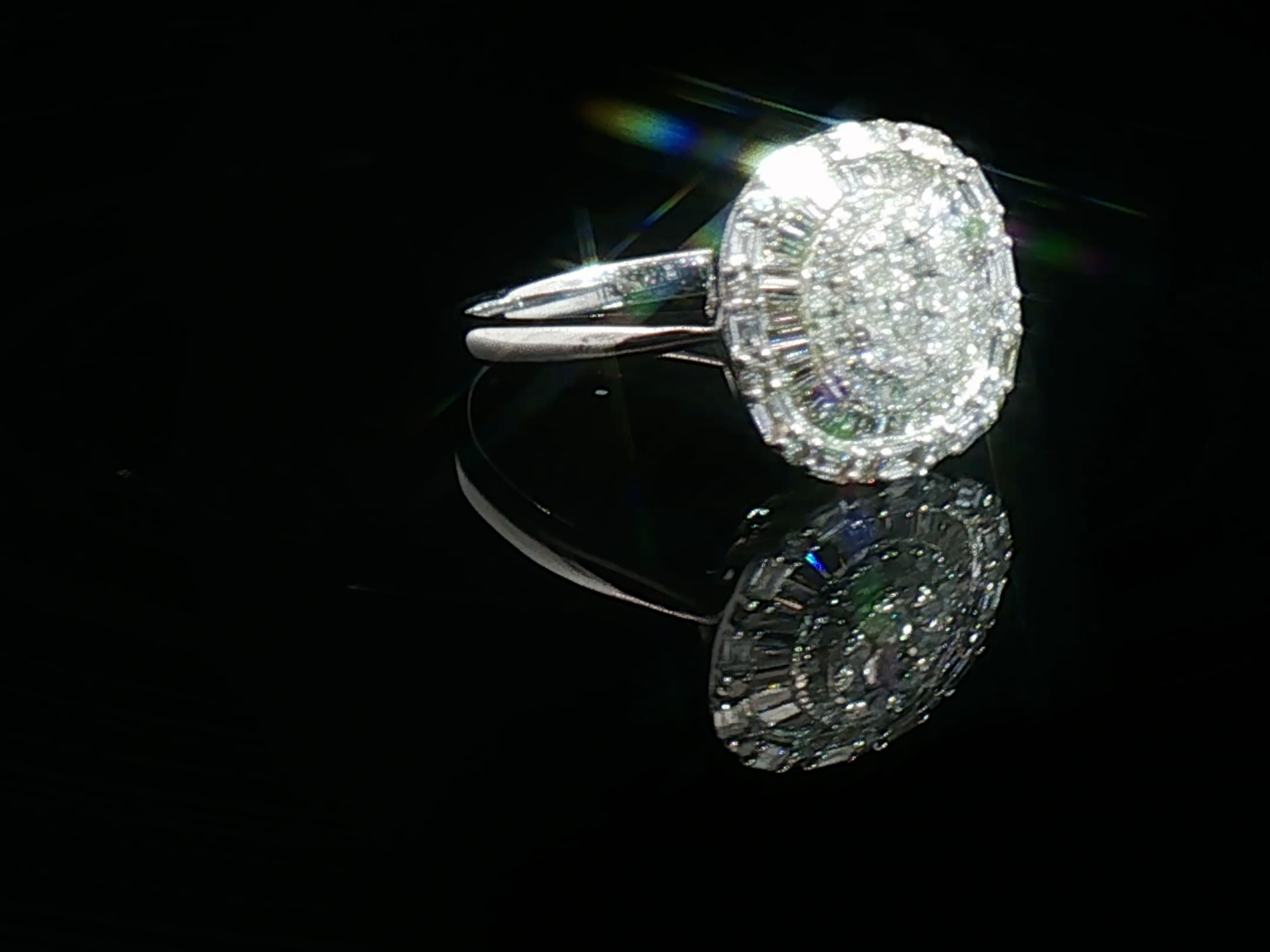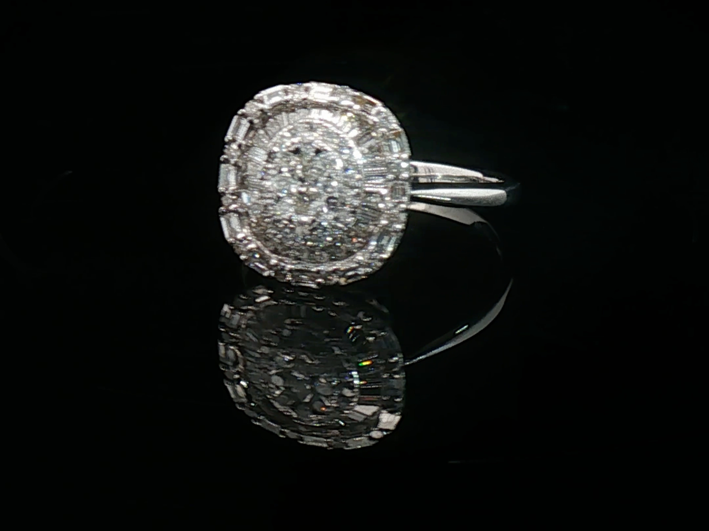 Kwaliteitsring bezet met witte diamanten: Briljant + baguette + marquise geslepen, totaal: +-0.80ct, kleur: D-E-F-exceptional white en zuiverheid: VS. Ingezet in wit goud 18kt (gemerkt 750). Ringmaat: 53-56 en diameter ring: +-14mm