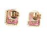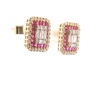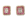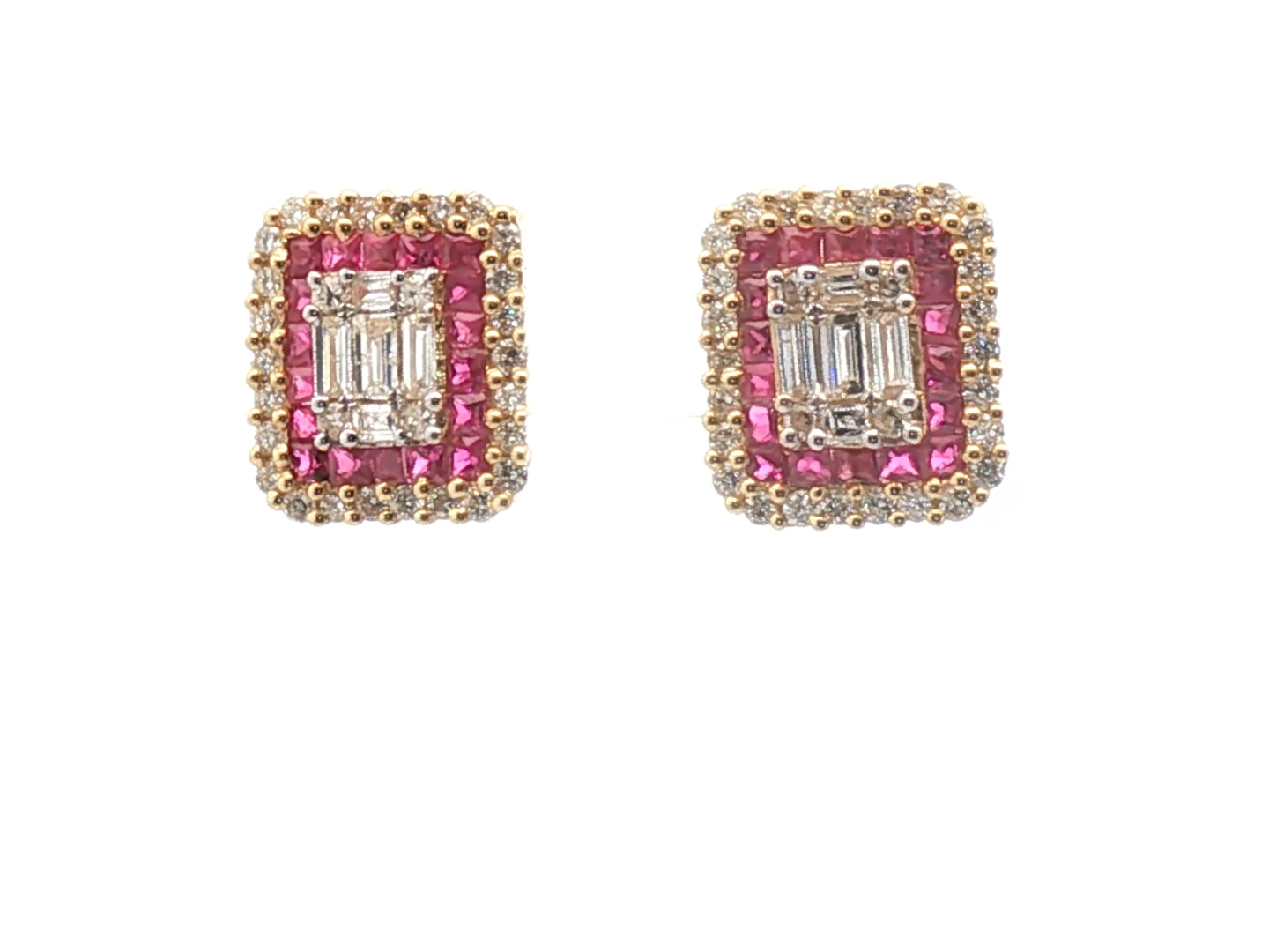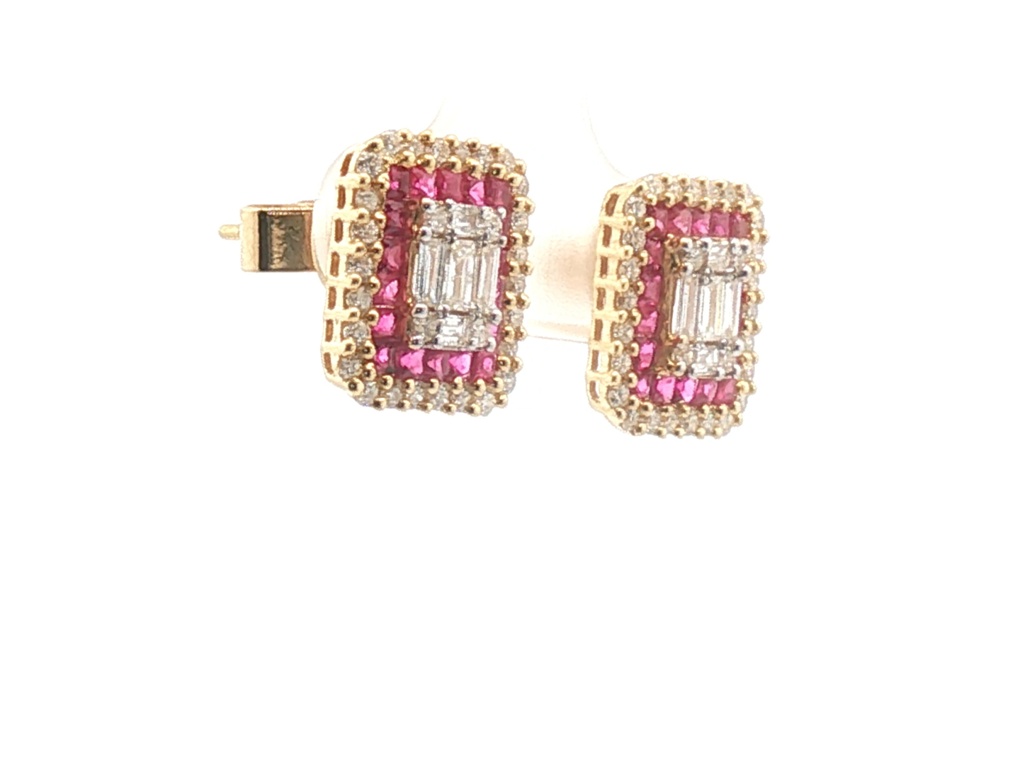 Paar elegante oorbellen bezet met 36 robijnen prinses geslepen: 0.90ct (gemerkt) + witte diamanten: 8 baguette + 68 briljant geslepen, totaal: +-0.90ct, kleur: G-H en zuiverheid: VS-SI. Ingezet in geel goud 18kt (gemerkt 750). Afmetingen oorbel: +-12mm op 10mm