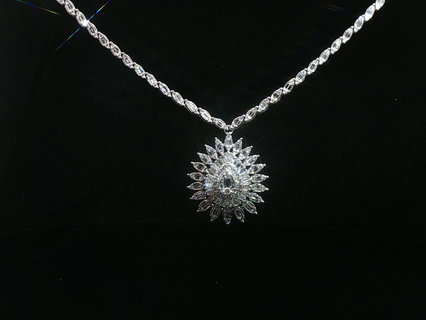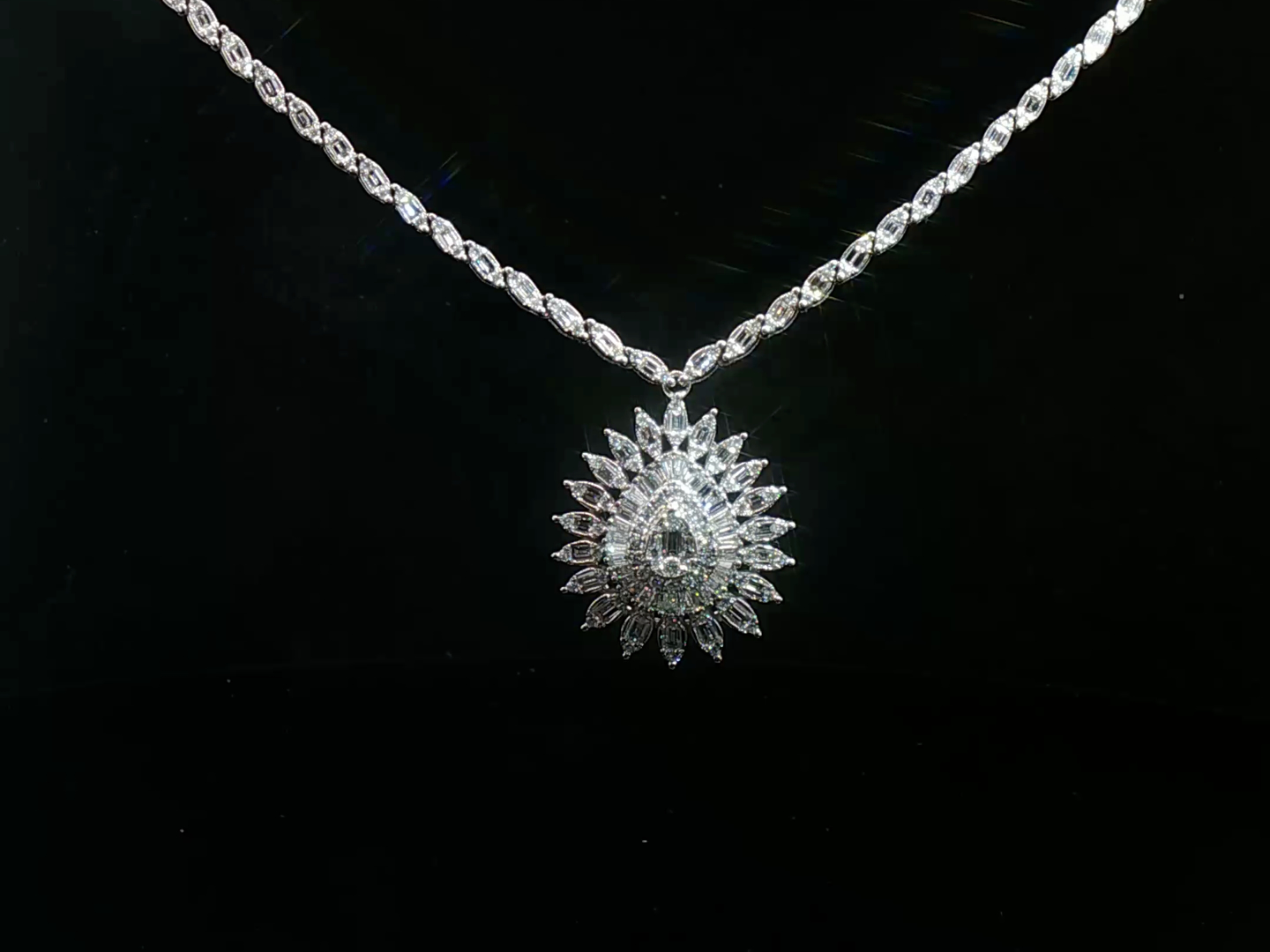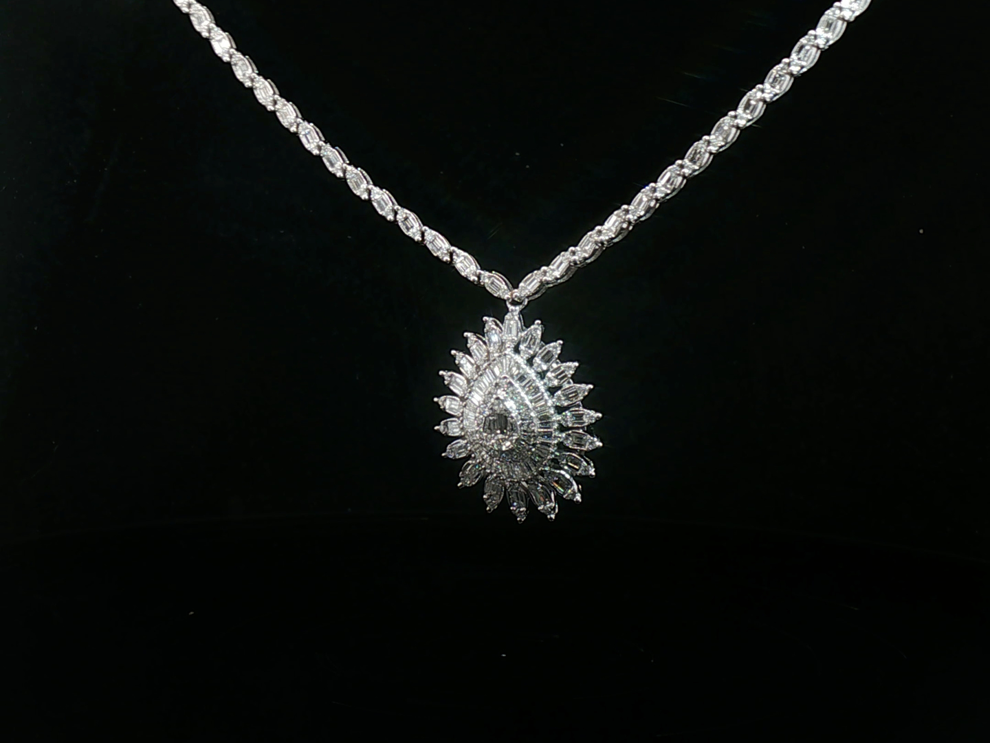 Exclusieve halsketting - hanger bezet met witte diamanten: +-140 briljant en +-240 baguette geslepen, totaal: 4.00ct (gemerkt), kleur: D-E-F-exceptional white en zuiverheid: VS-SI. Ingezet in wit goud 18kt (gemerkt 750). Lengte ketting: 45cm en hanger: +-23mm