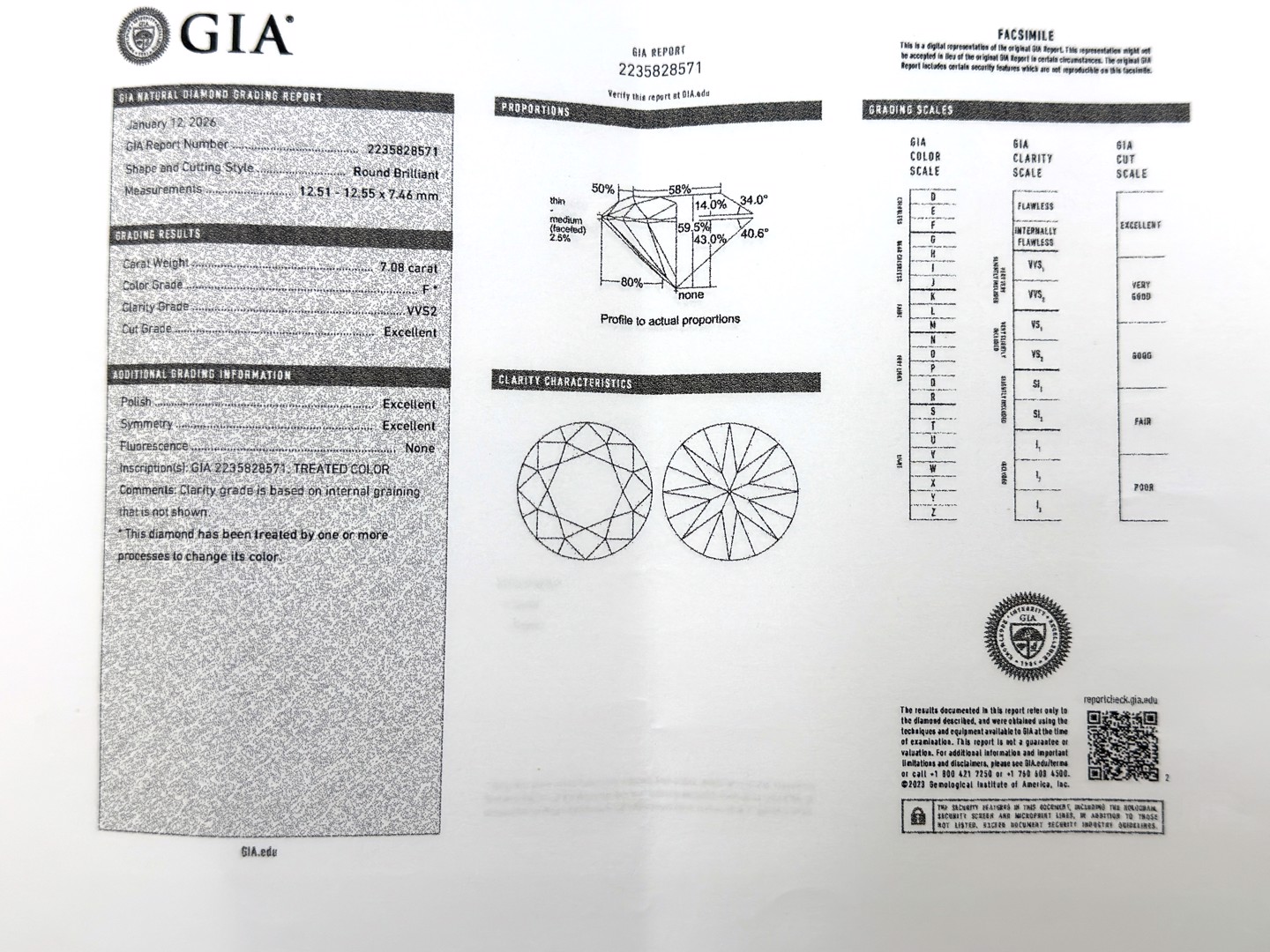 Top kwaliteit solitaire briljant geslepen van 7.08ct met GIA certificaat en laser inscriptie. Kleur: F en zuiverheid: VVS2, ingezet in wit goud 18kt (gemerkt 750).
