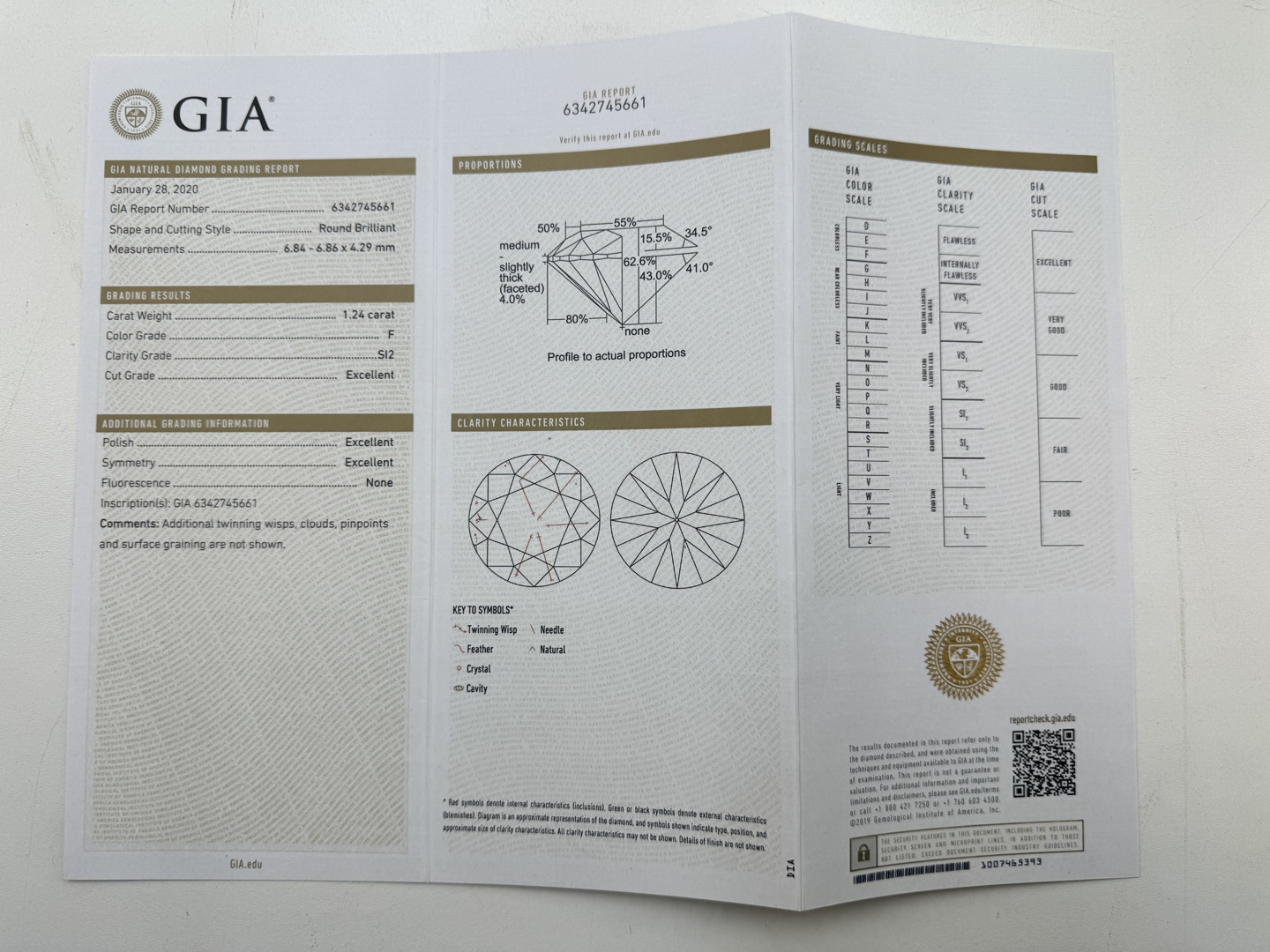 Kwaliteit ring met GIA certificaat, bezet met 1 briljant van 1.24ct, kleur: F en zuiverheid: SI2. Omringd door 22 kleine briljanten, kleur: F en zuiverheid: VS. Ingezet in wit goud 18kt (gemerkt 750). Ringmaat: 49-51
