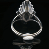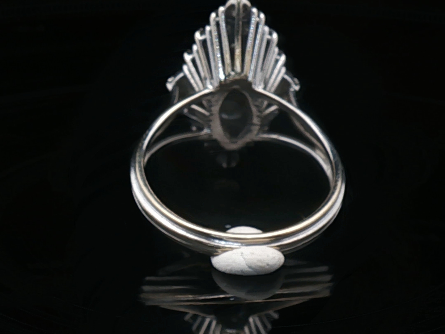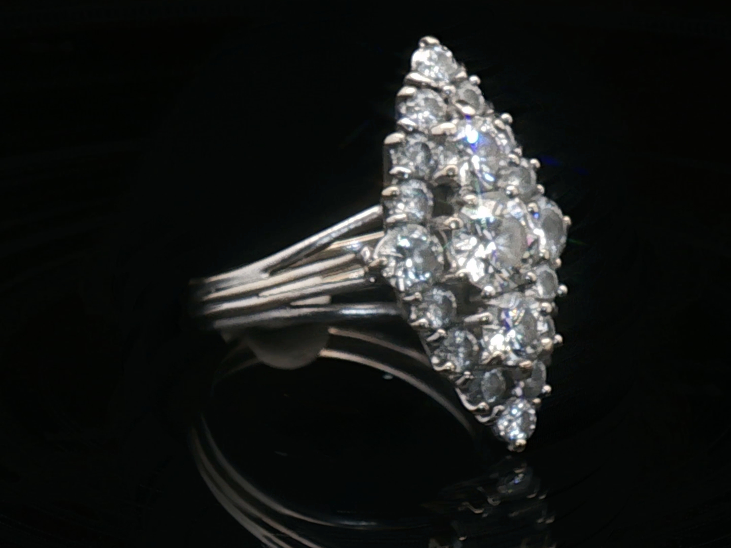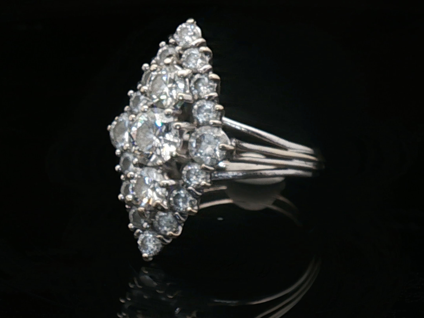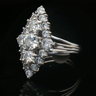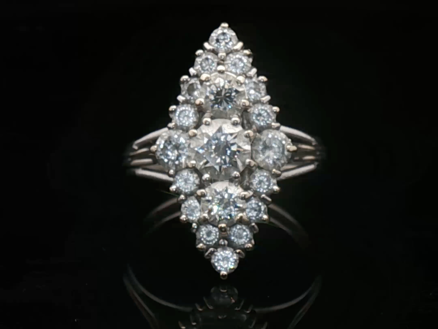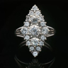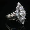 Ring marquise met witte kwaliteit diamanten: 1 briljant van +-0.70ct + 2 briljanten: +-0.50ct + 2 briljanten: +-0.40ct + 14 kleine briljanten: +-0.90ct, totaal: +-2.50ct, kleur: D-E-F-exceptional white en zuiverheid: VS-SI. Ingezet in platinagoud. Ringmaat: 56-58. Afmetingen ring: +-24mm op 12mm