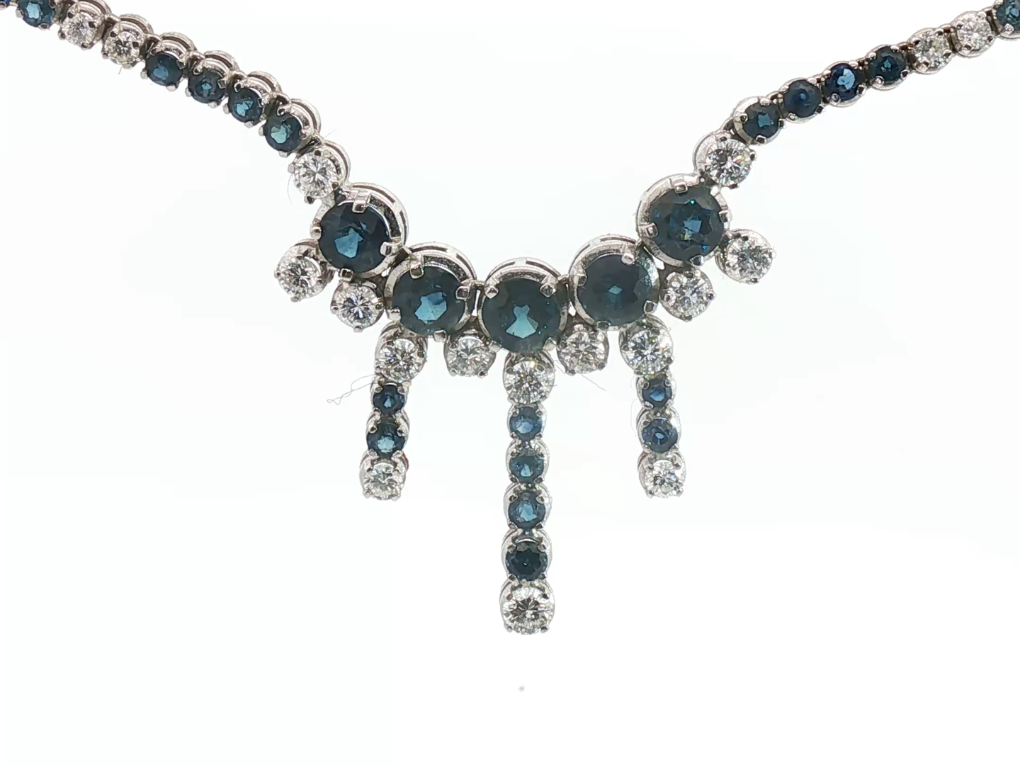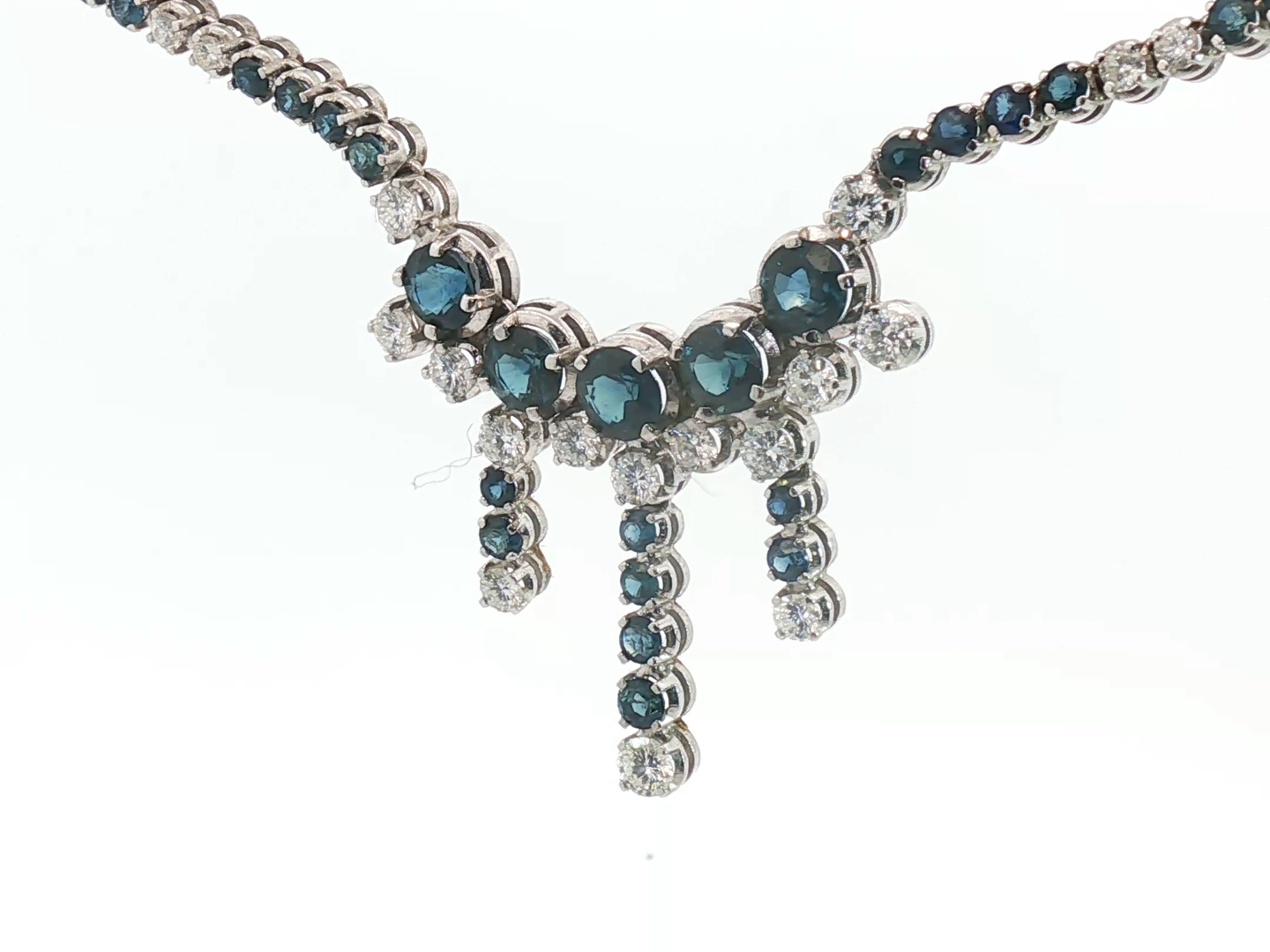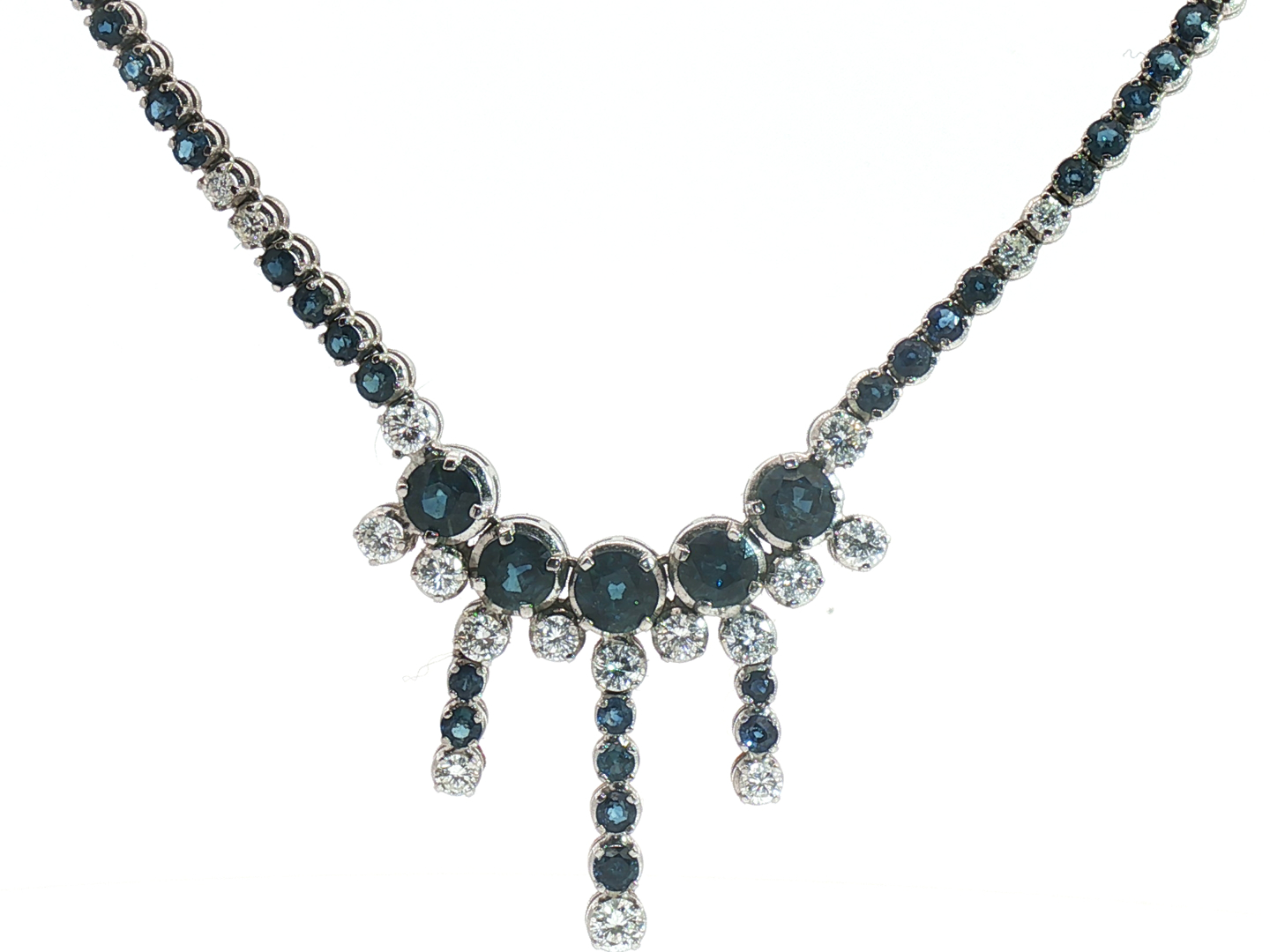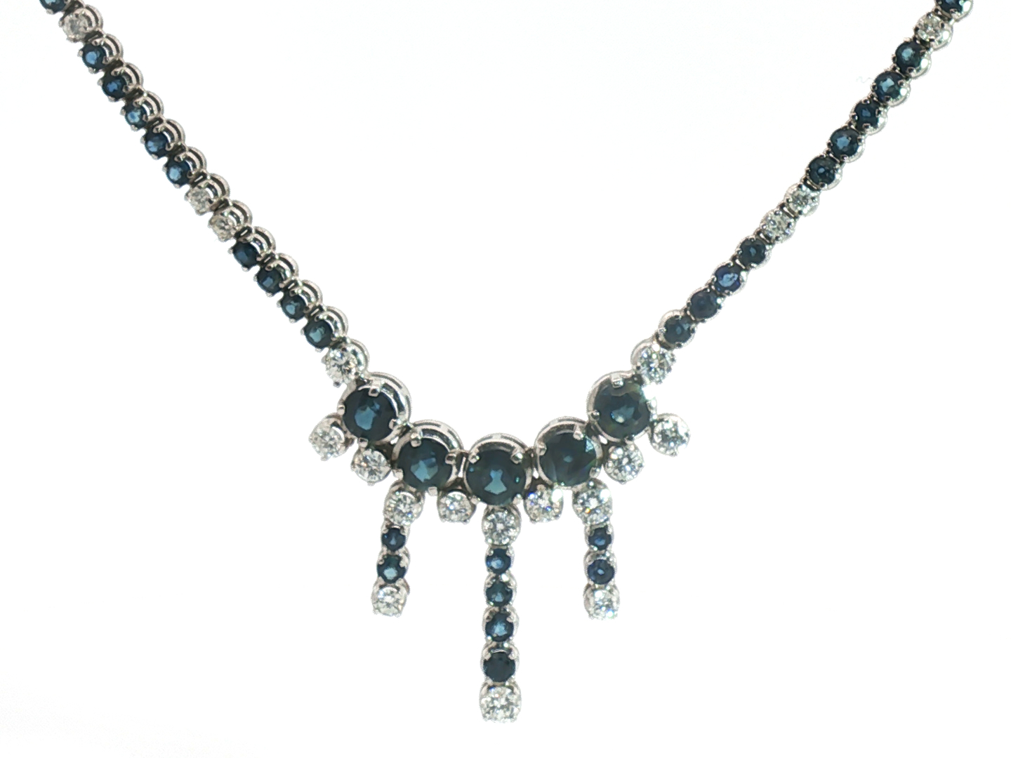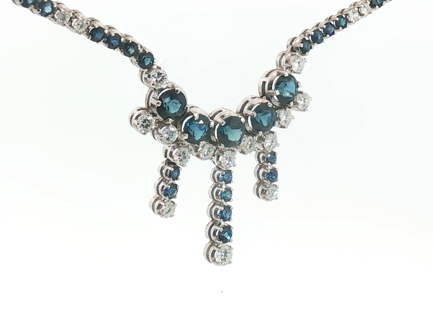 Halsketting bezet met 44 witte diamanten briljant geslepen, totaal: +-5.00ct, kleur: F-G en zuiverheid: VS + 129 saffieren: +-12.00ct. Ingezet in wit goud 18kt (gemerkt 750). gewicht: 26,78 gram, lengte: 42 cm + hanger: 30mm