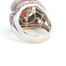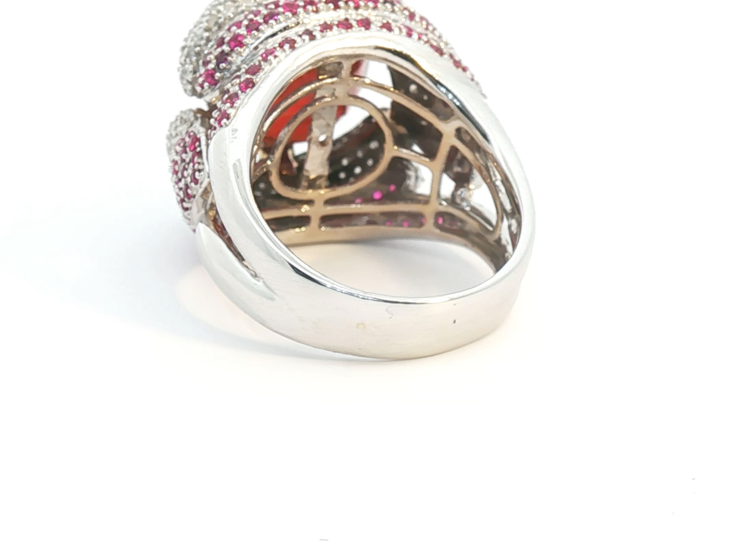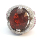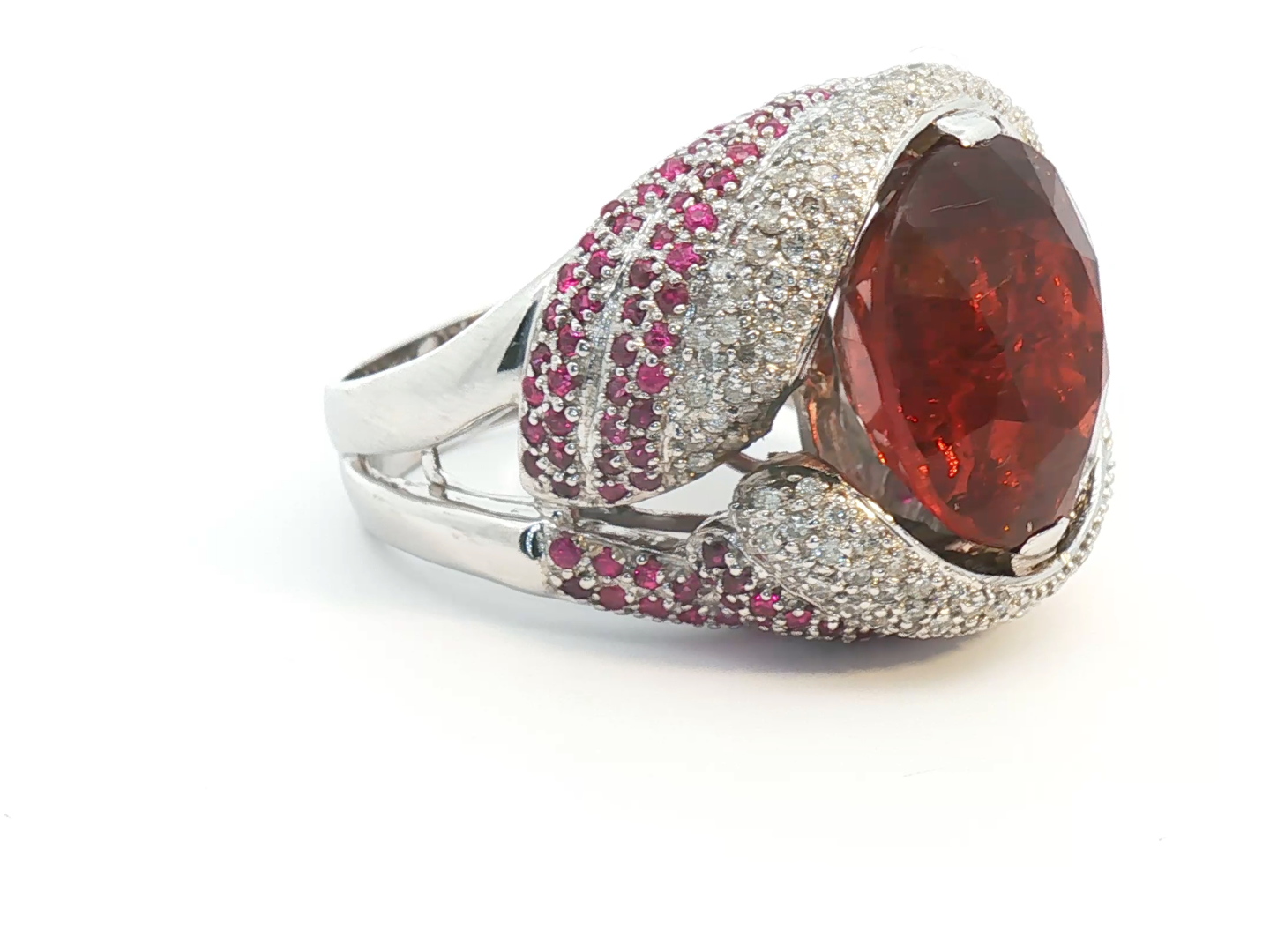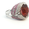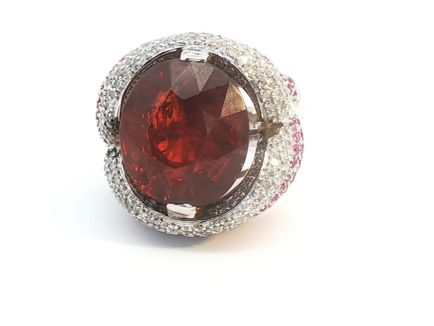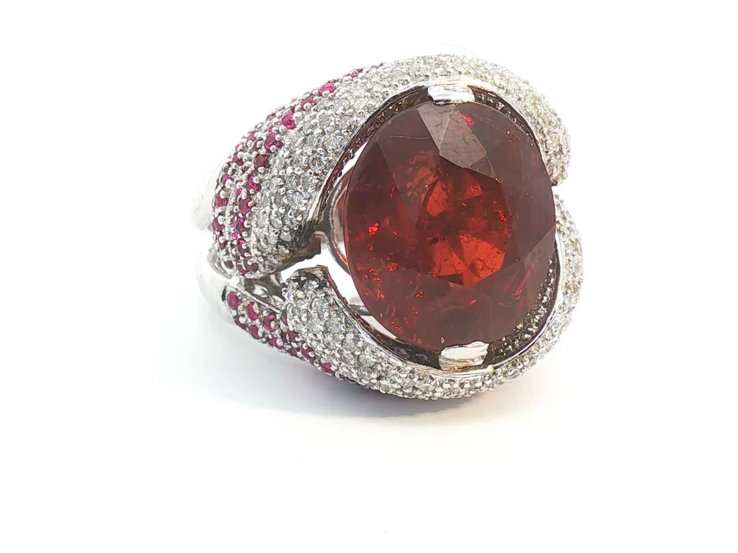 Exclusieve grote ring bezet met 1 rode granaatsteen van 18.49ct (gecertifieerd gem lab) ovaal-transparant, omringd door 192 witte diamanten briljant geslepen: +-2.00ct, kleur: G-H en zuiverheid: VS-SI + 150 kleine robijnen: +-1.50ct. Ingezet in wit goud 18kt. Afmetingen ring: +-22mm op 20mm en ringmaat: 57-61